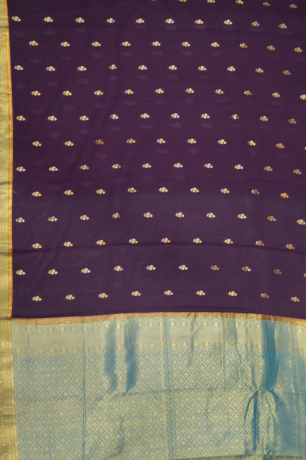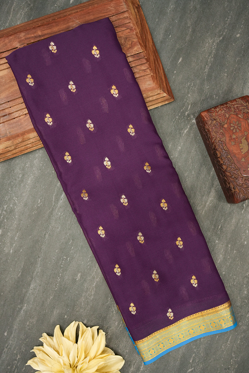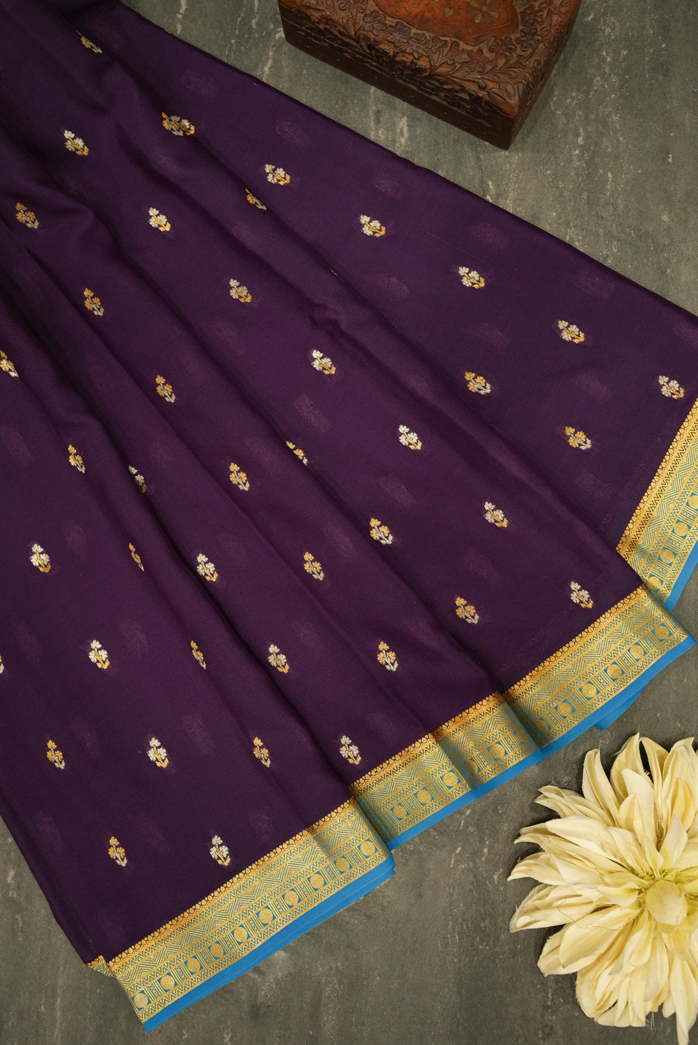 This stunning Mysore silk saree features a rich purple body adorned with elegant golden buttas (motifs). The saree is finished with a unique and beautiful border in a combination of light blue and golden zari, adding a touch of modern contrast to the traditional fabric. This lightweight and luxurious saree is a perfect choice for weddings, festive occasions, and special events.