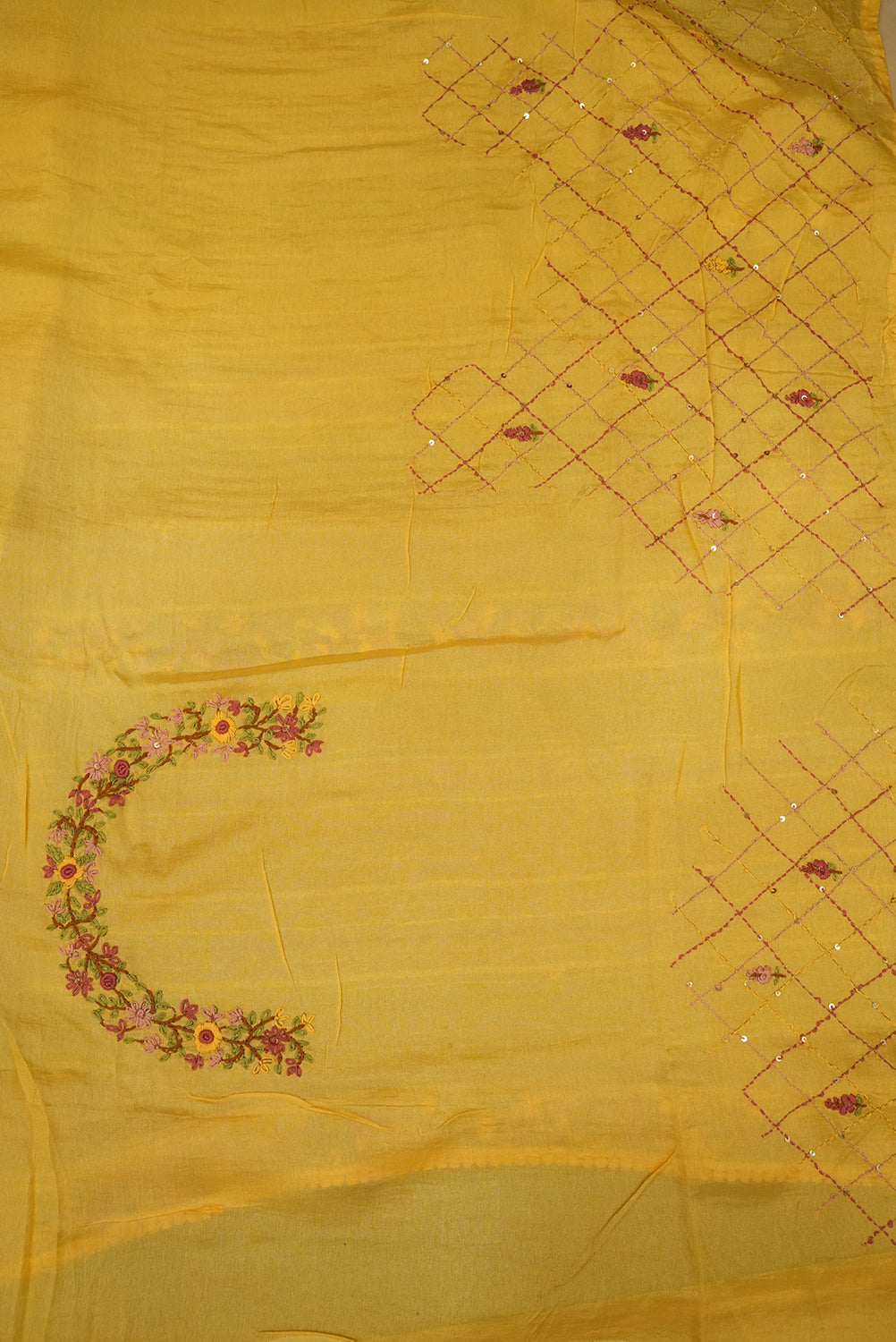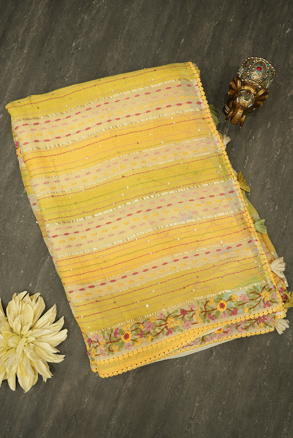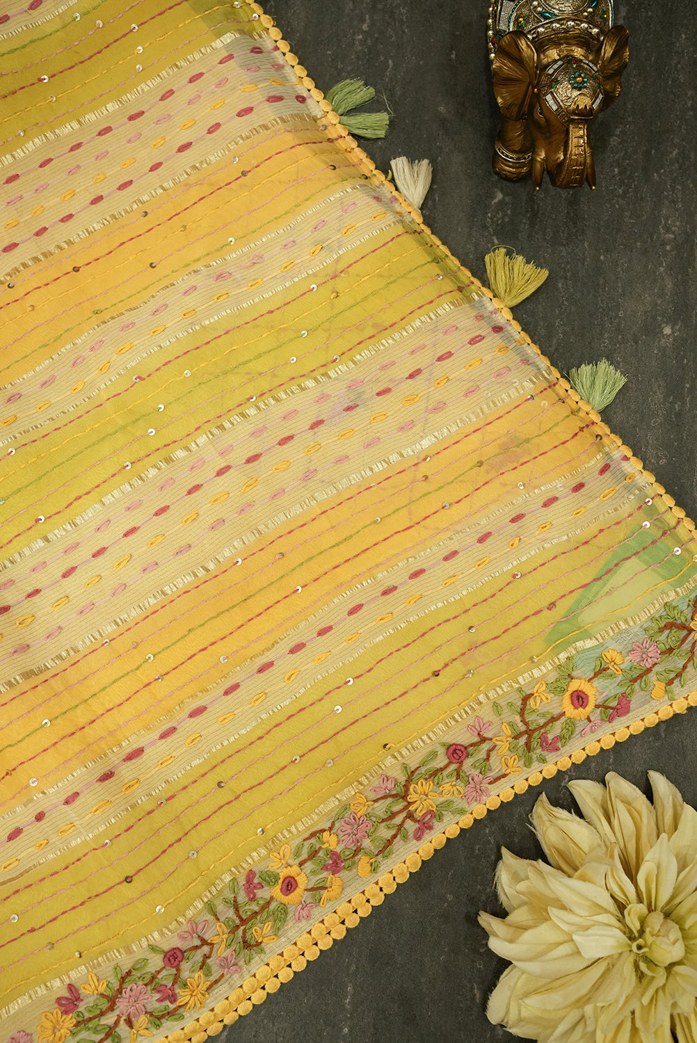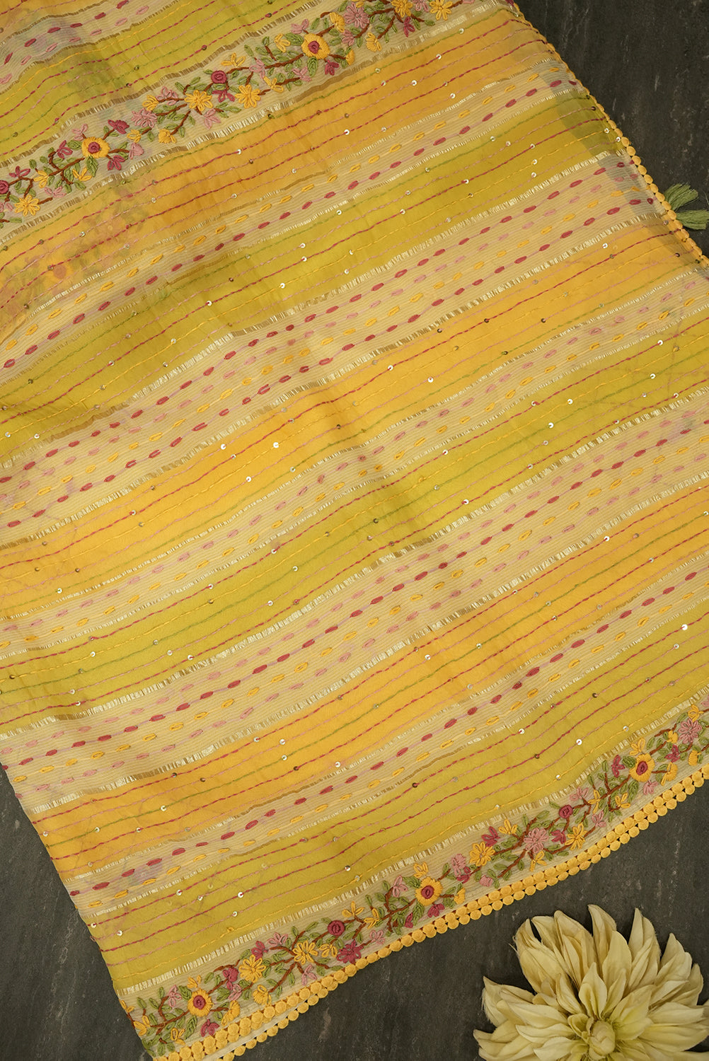 Brighten up your ethnic look with this cheerful sunny yellow cotton tussar saree Designed with alternating pastel and yellow stripes, it features delicate threadwork, shimmering sequin accents, and intricate floral embroidery along the border. Finished with charming pom-pom edging and tassels, this saree is perfect for festive celebrations, casual gatherings, or summer occasions. Unstitched blouse attached.