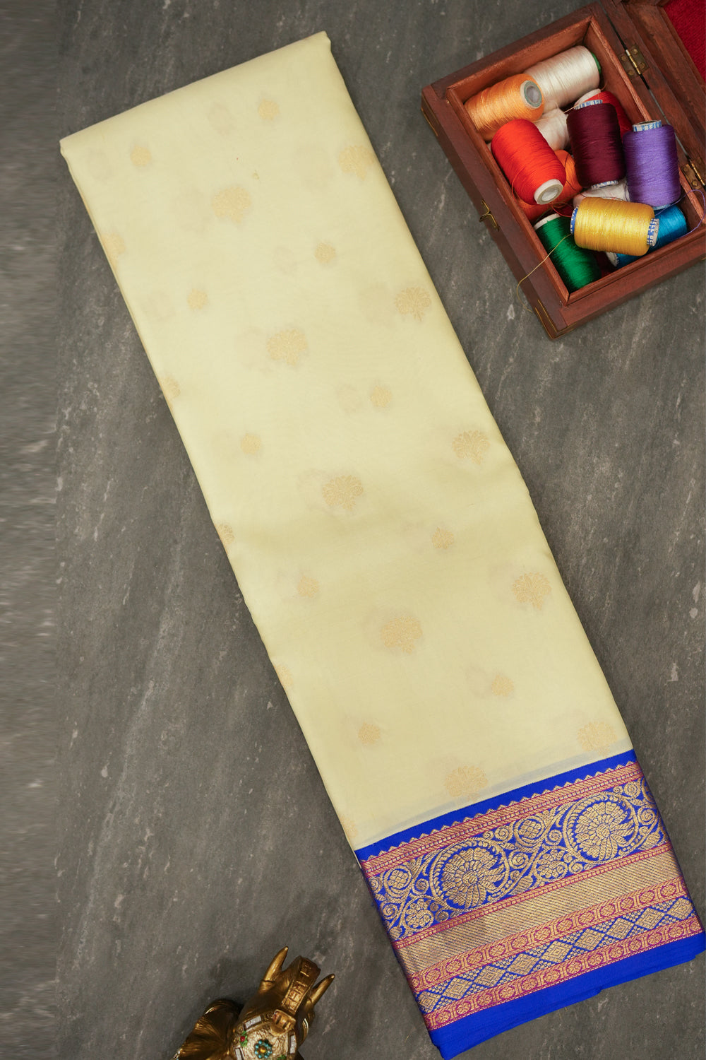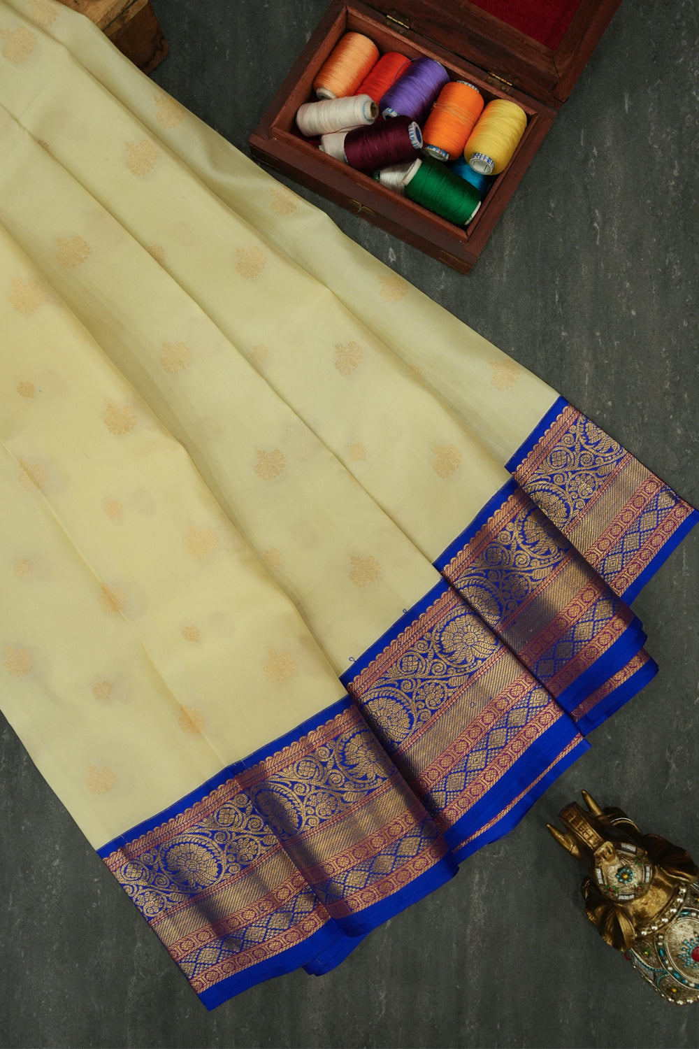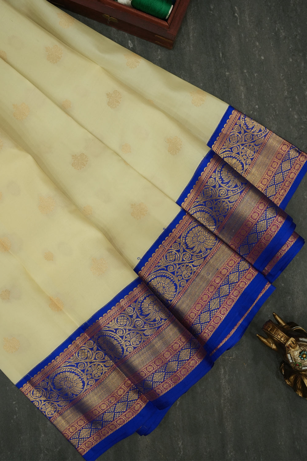 This exquisite silk saree showcases a sophisticated off-white hue with subtle gold floral buttas woven throughout the body. The rich blue border is intricately detailed with traditional gold zari designs, creating a stunning contrast that highlights the saree's traditional craftsmanship. Unstitched blouse attached.