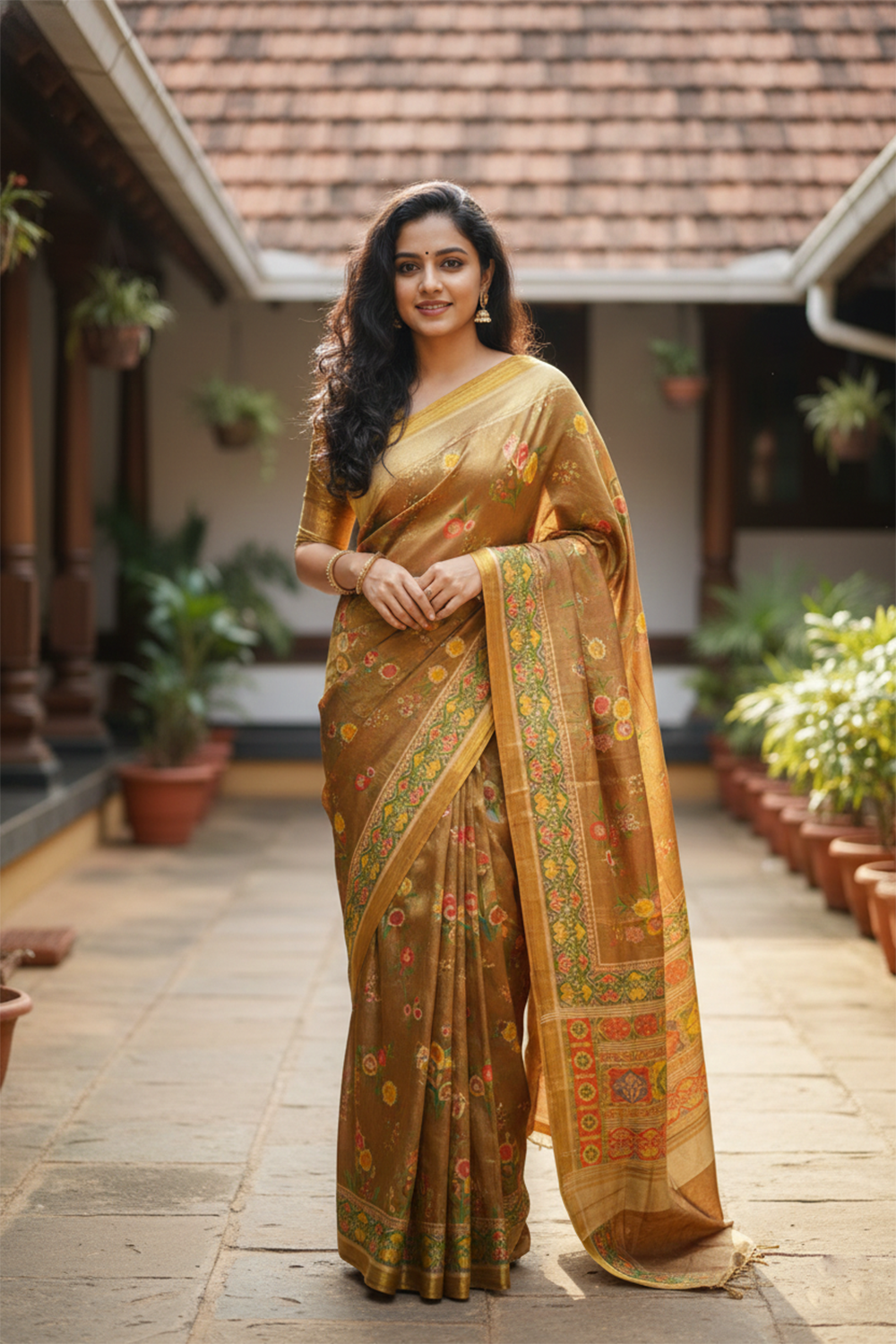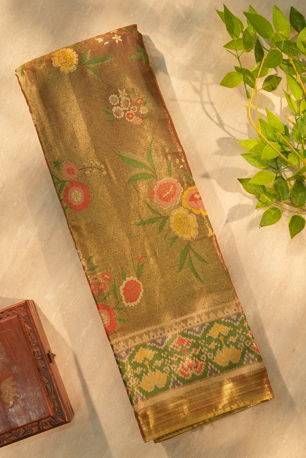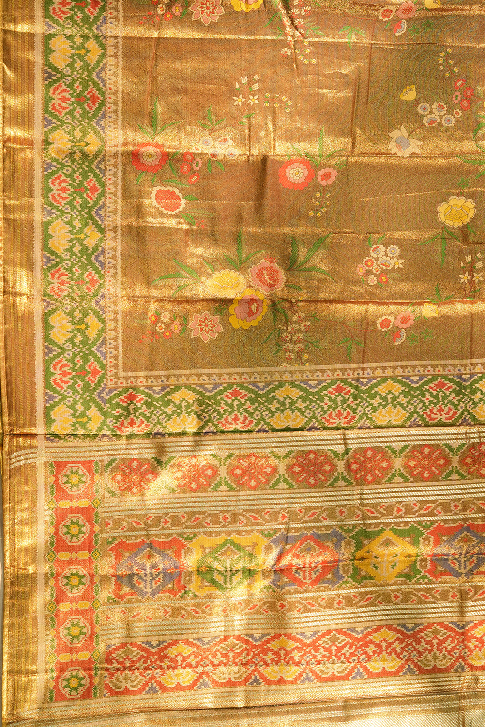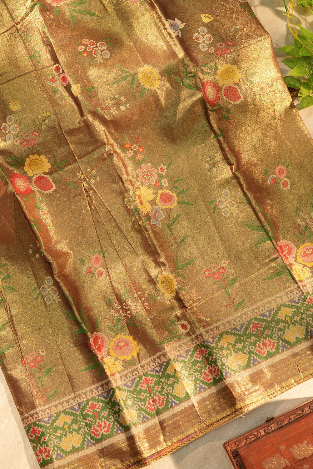 Antique Gold Tissue Silk Saree with Meenakari Florals and Patola Border