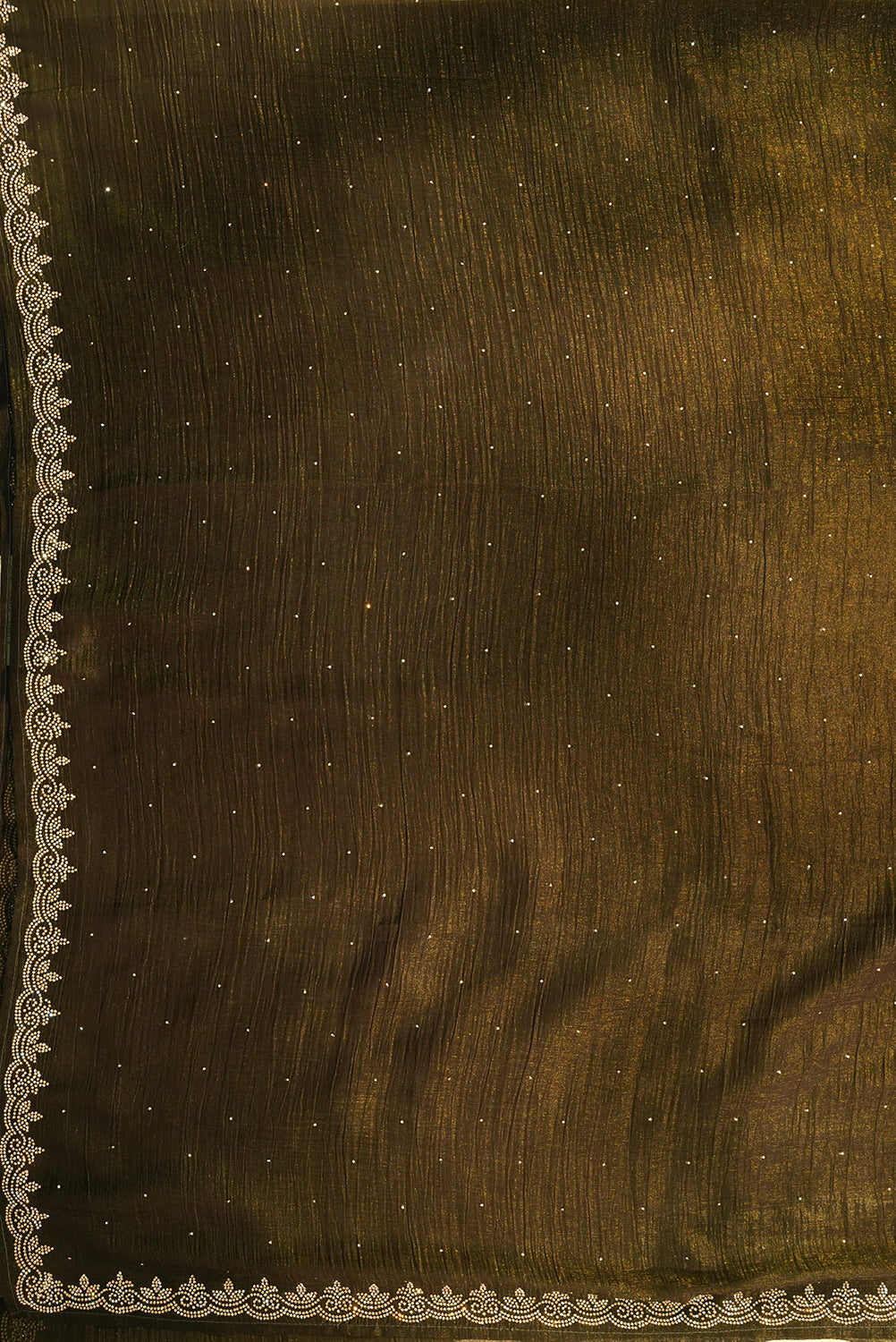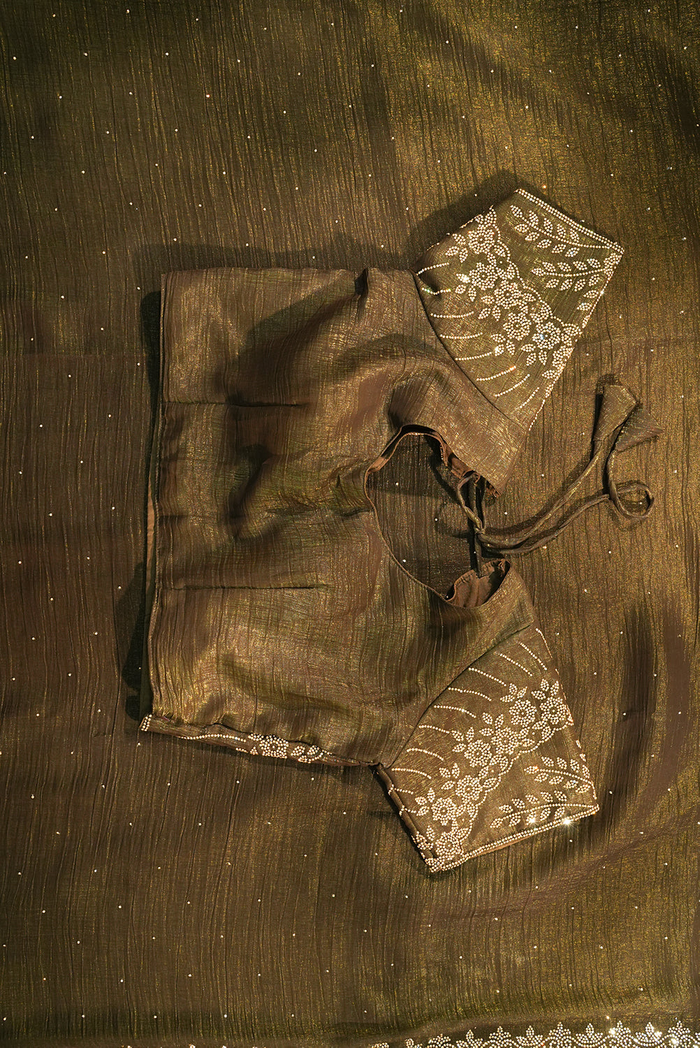 Make a statement in this exquisite Jimmy Choo designer saree in a beautiful shade of forest or deep olive green. The fine embellishments on the saree and the opulent, textured blouse are perfect for a high-fashion, festive occasion