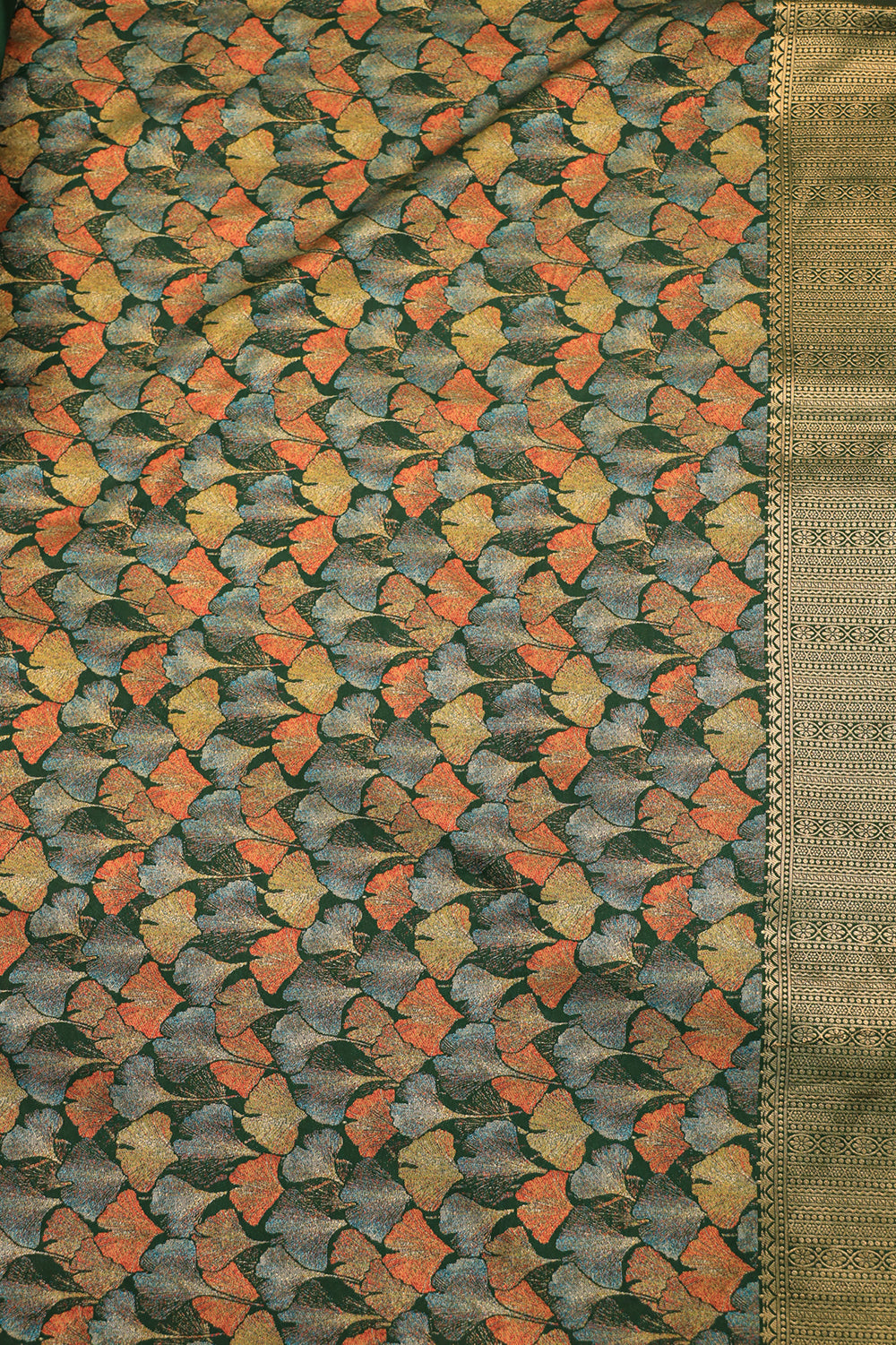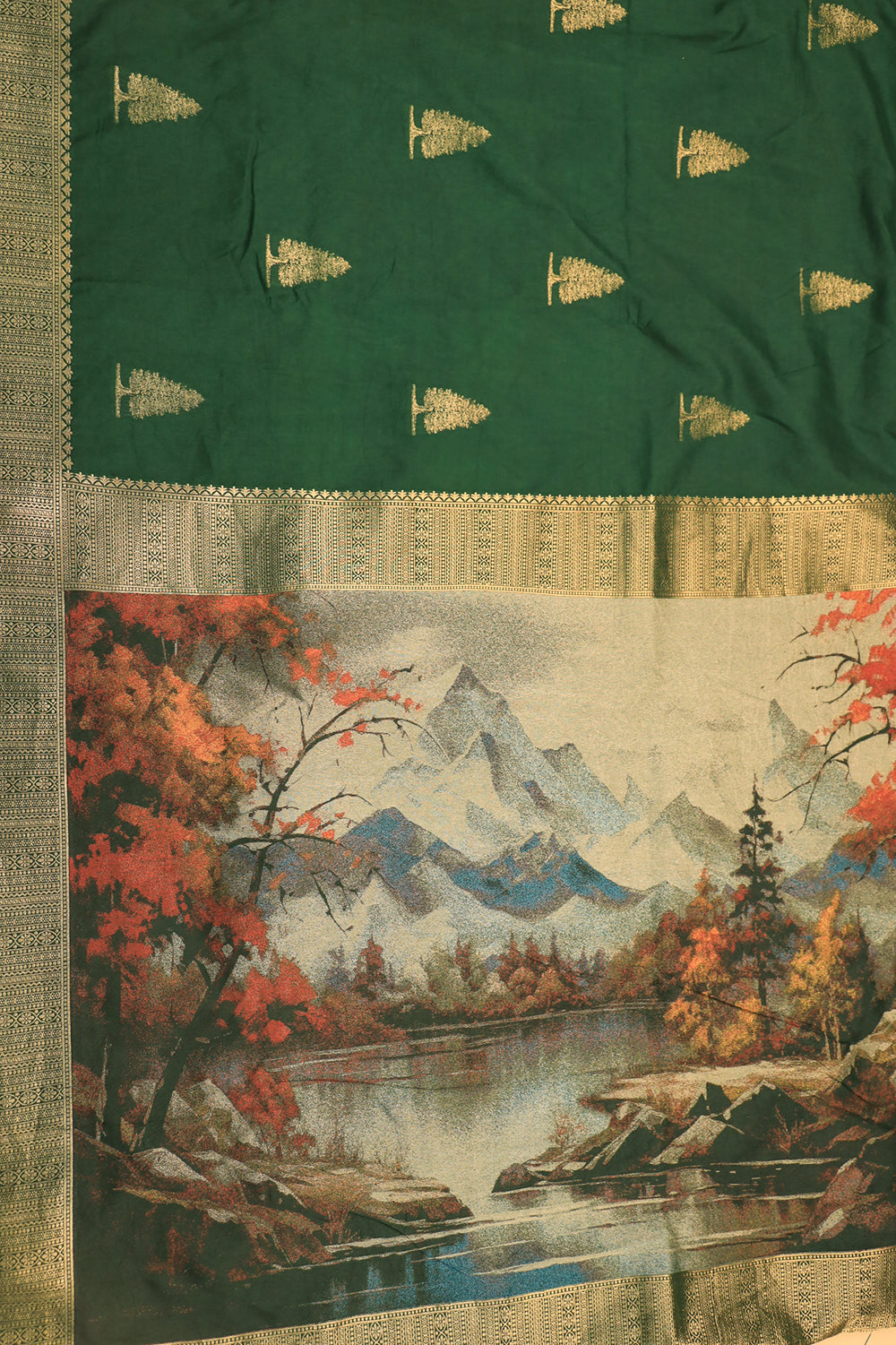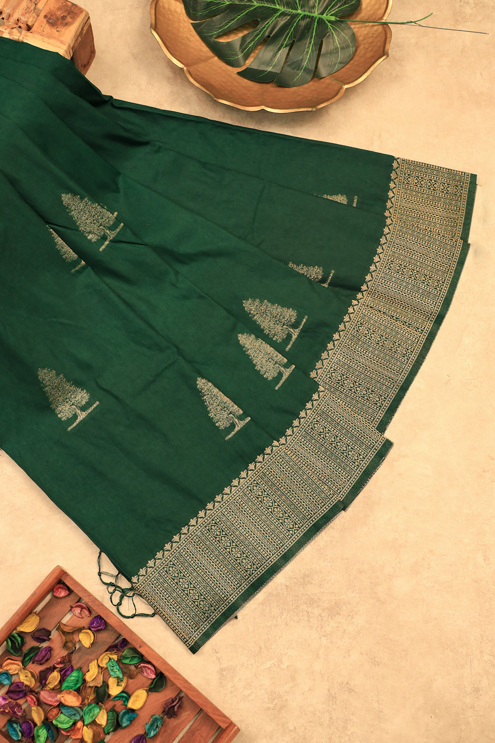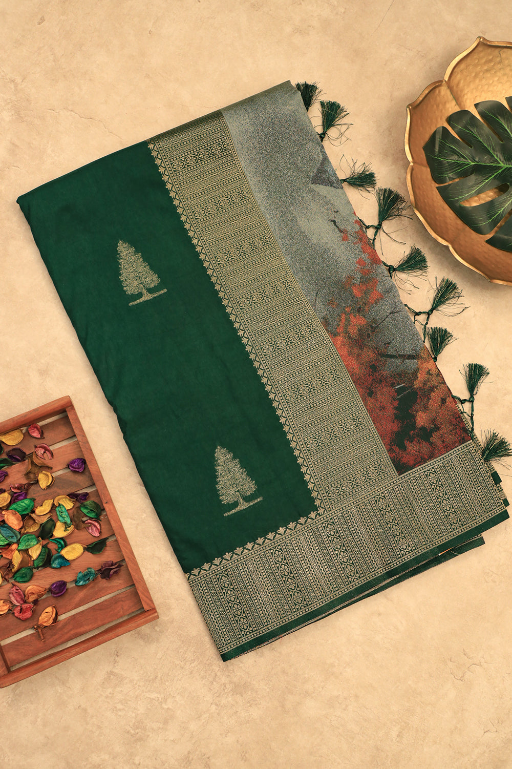 Drape yourself in this stunning raw silk saree showcasing a deep green base and an artistic grey pallu with hints of rust. The saree is finished with a textured border and tassel detailing. Unstitched blouse attached