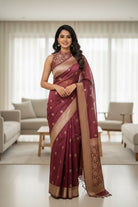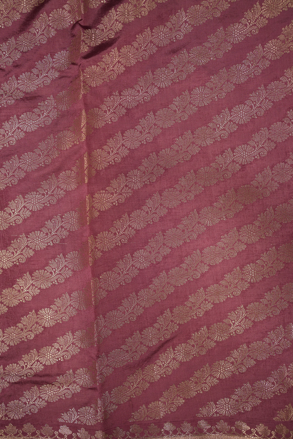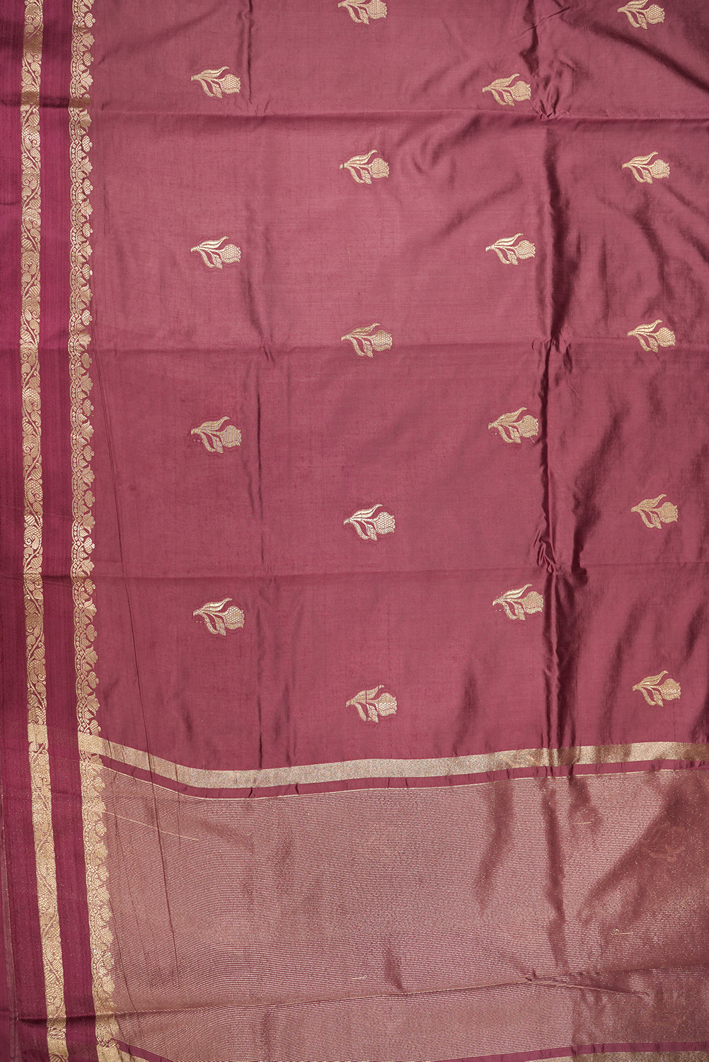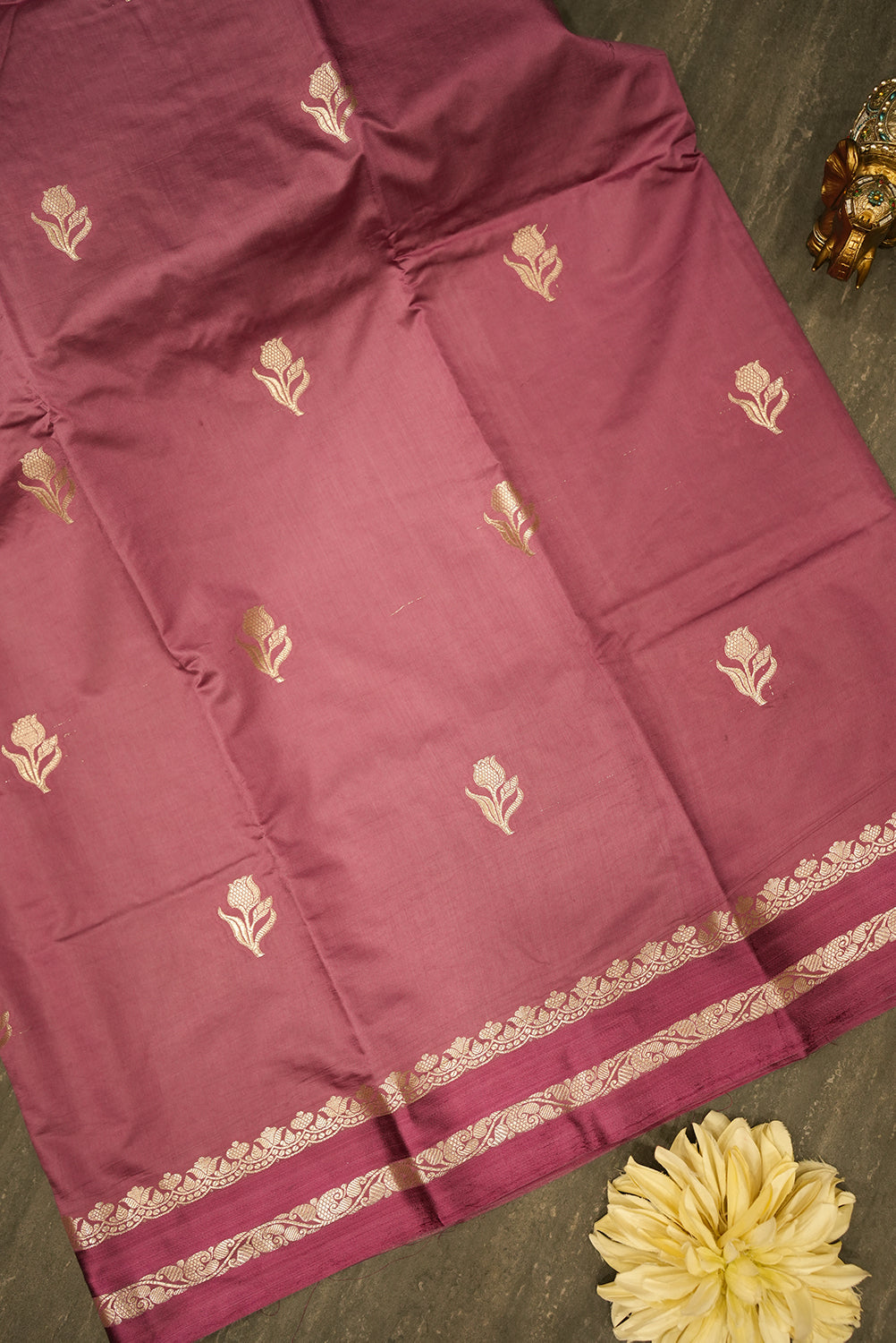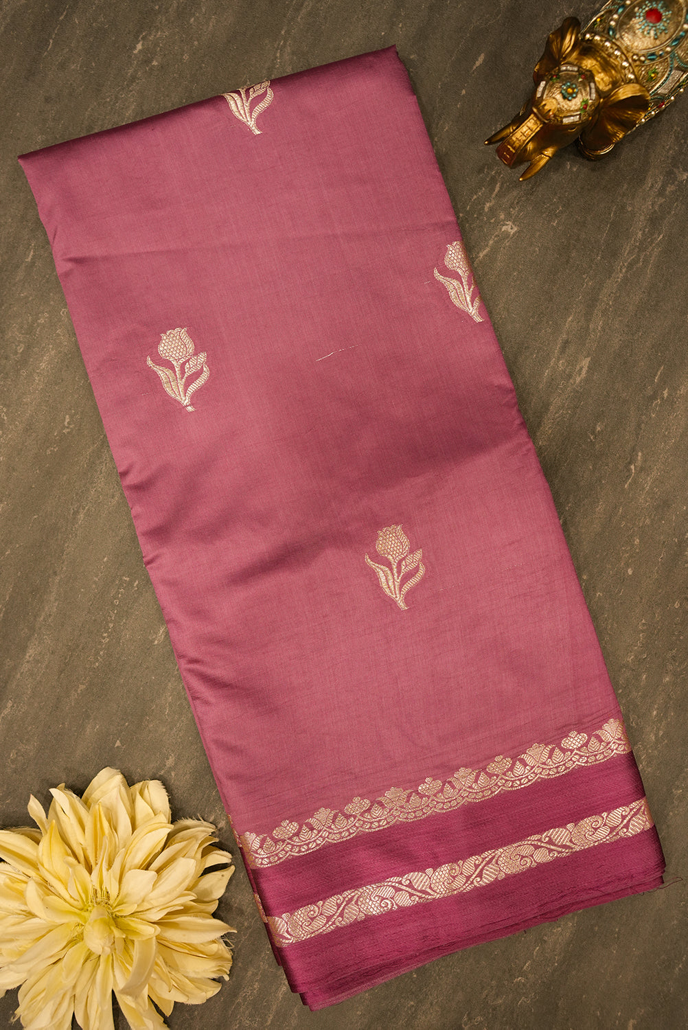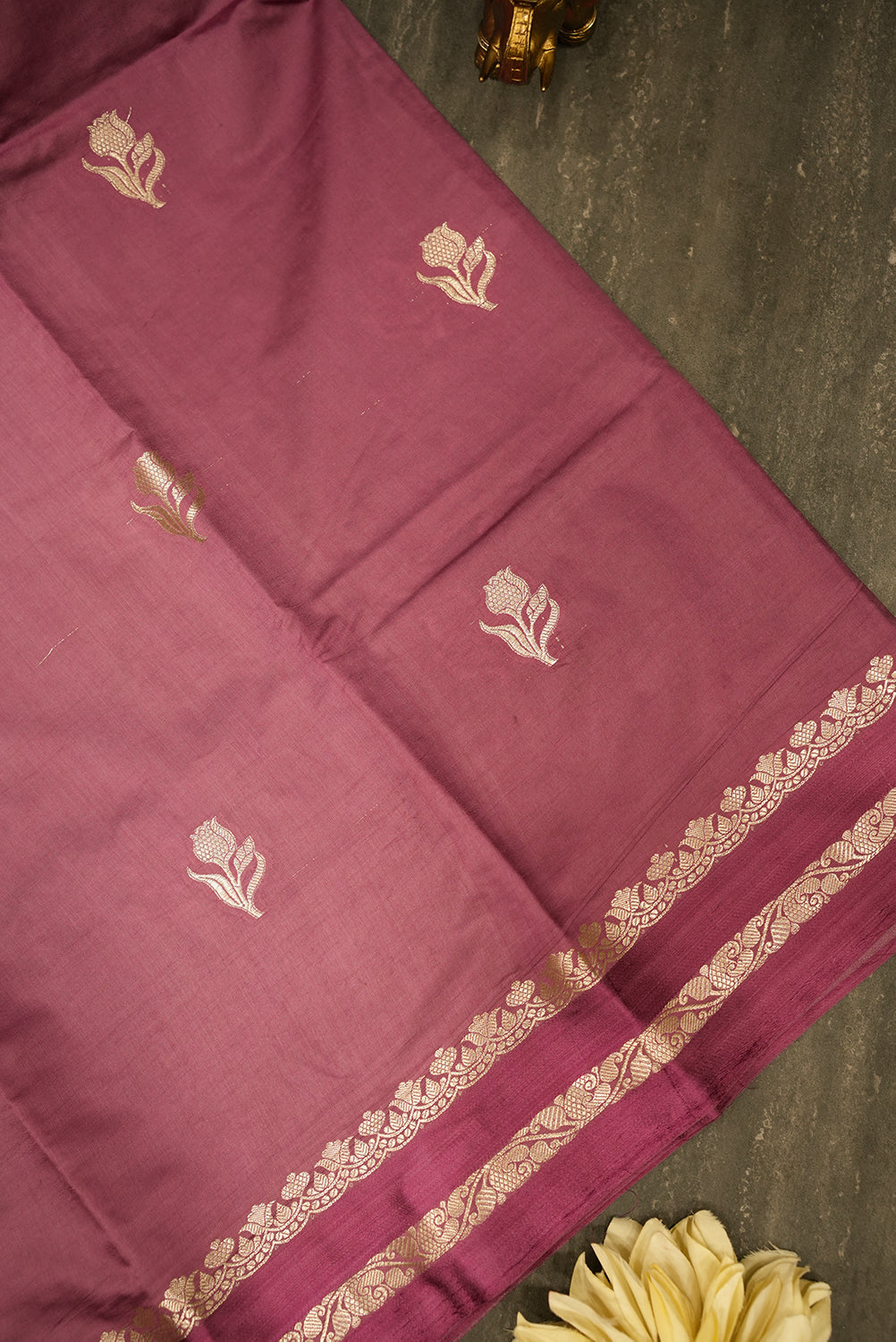 A stunning dusky rose raw silk saree with a captivating sheen. The body is subtly adorned with woven lotus designs, while the contrasting deep mauve border is richly embellished with elaborate silver zari patterns. This saree blends classic elegance with a modern palette. Unstitched blouse attached,