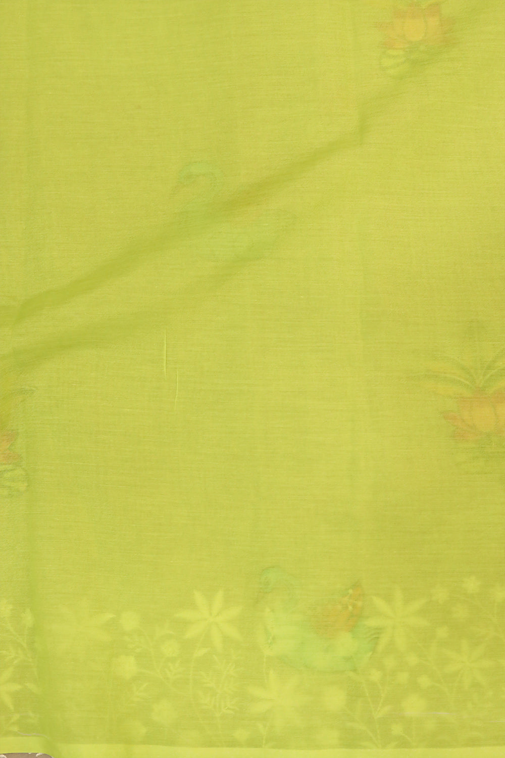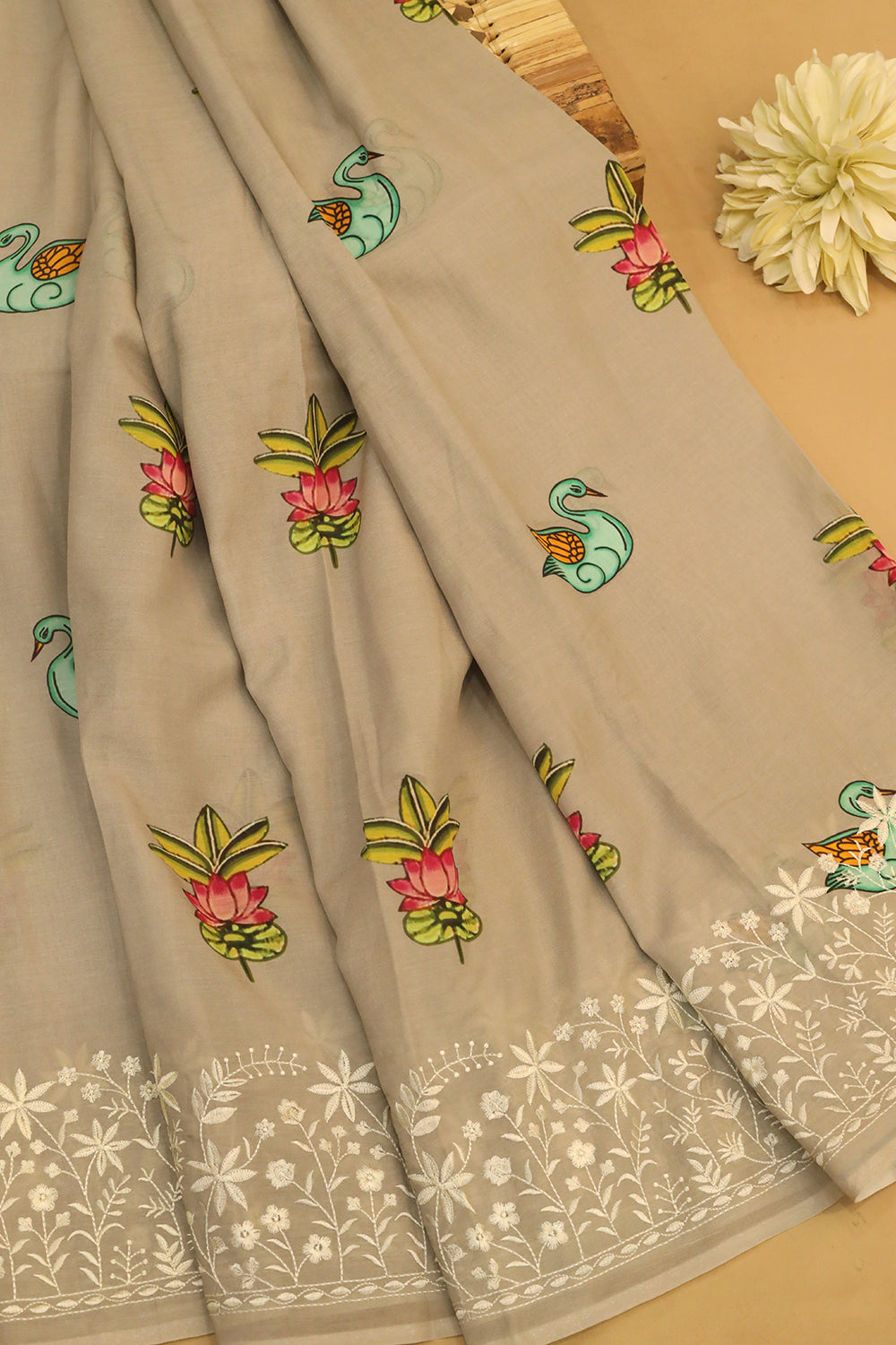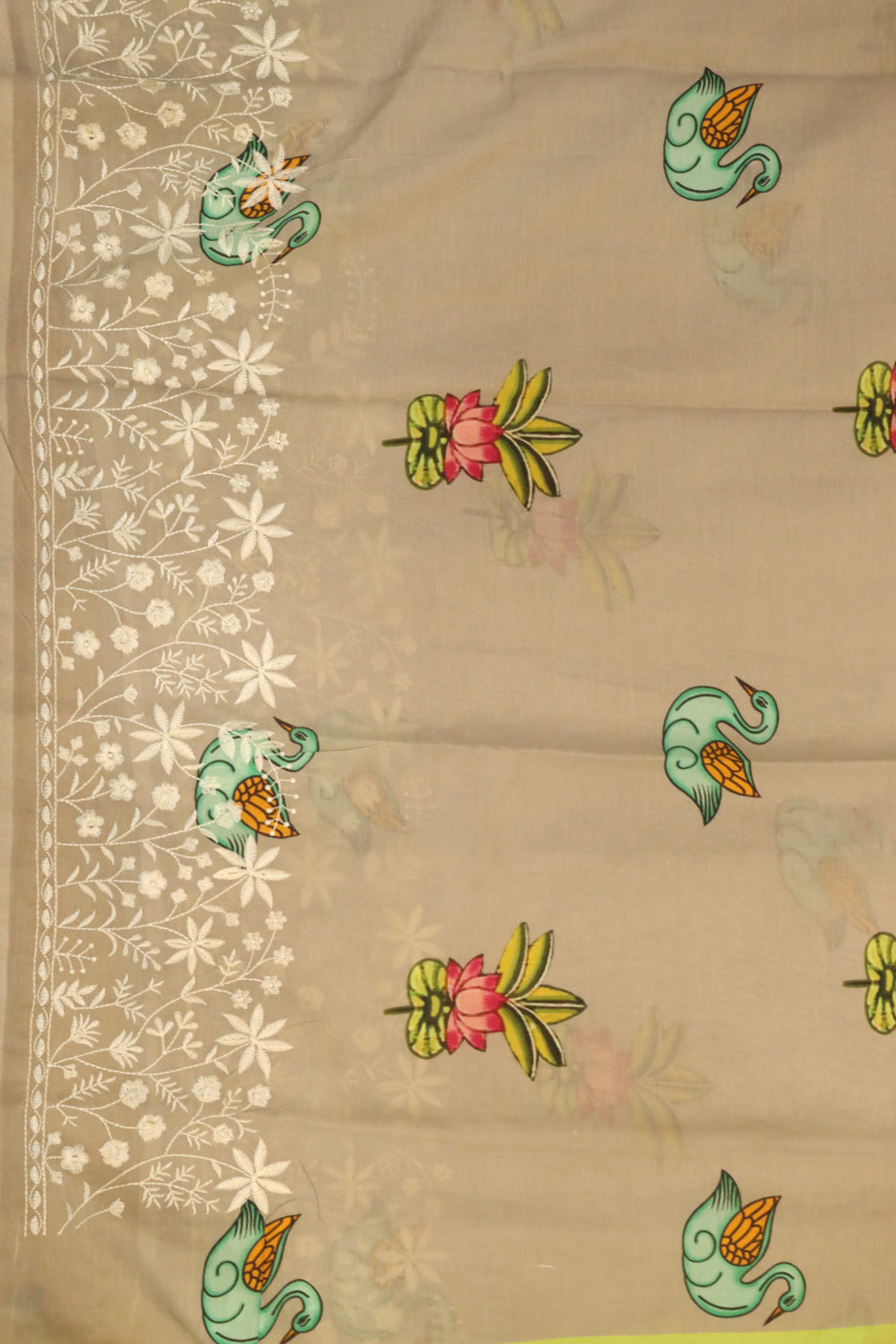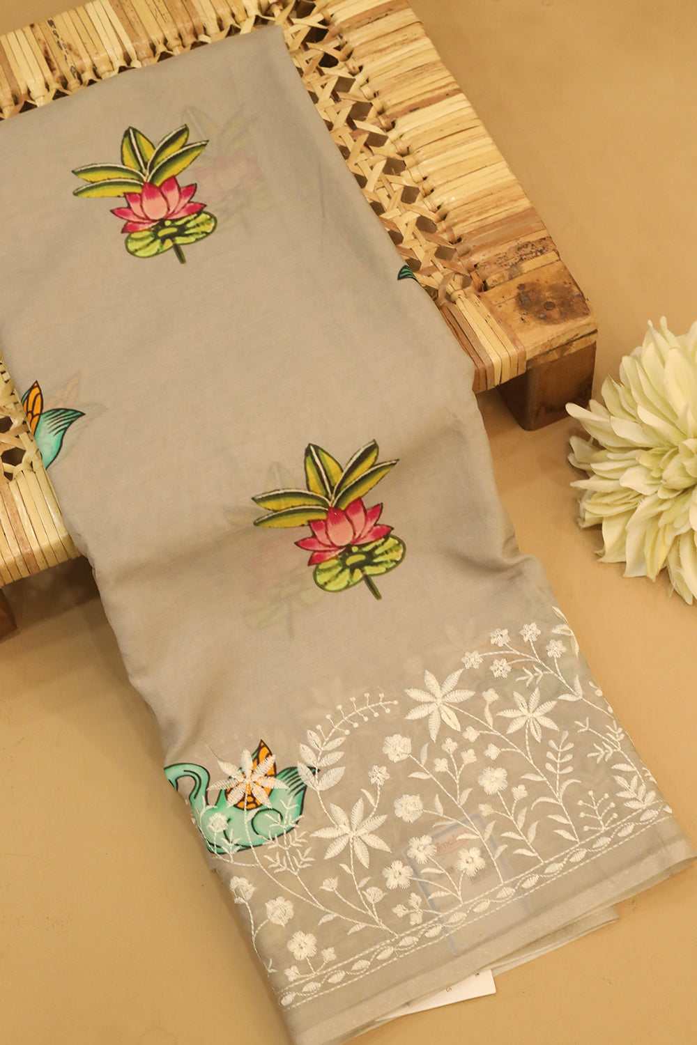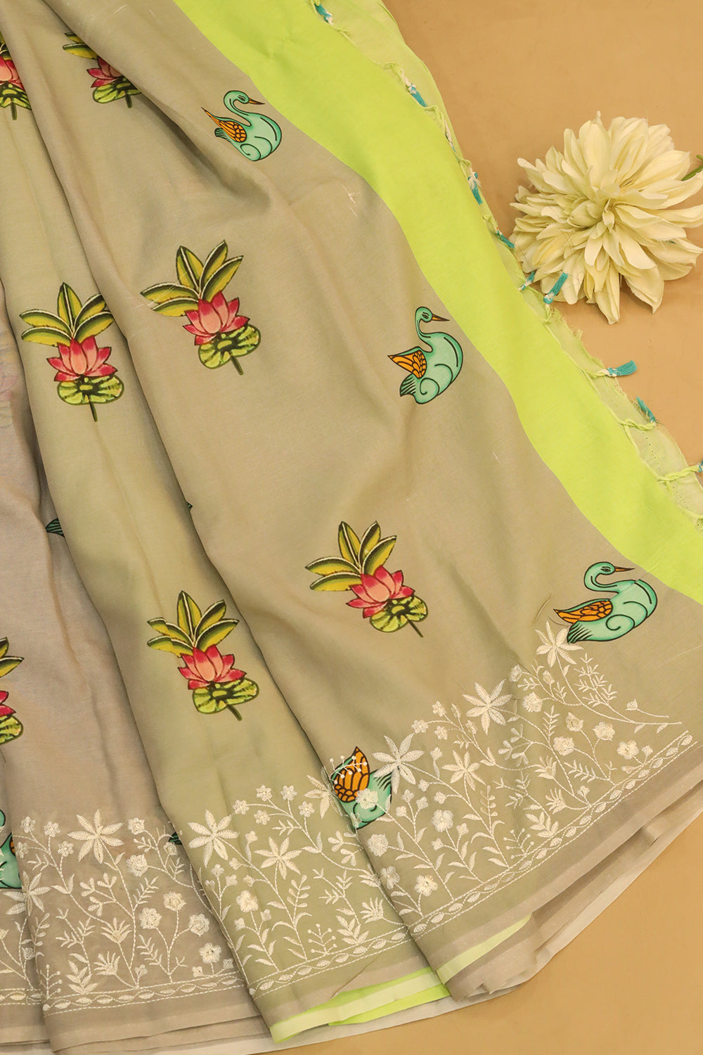 Grey Chanderi Silk Cotton Saree having a beautiful lotus with leaf motifs design all over the body. Embroidered floral pattern with white color and Lime green with copper zari lovely border. Unstitched blouse attached.