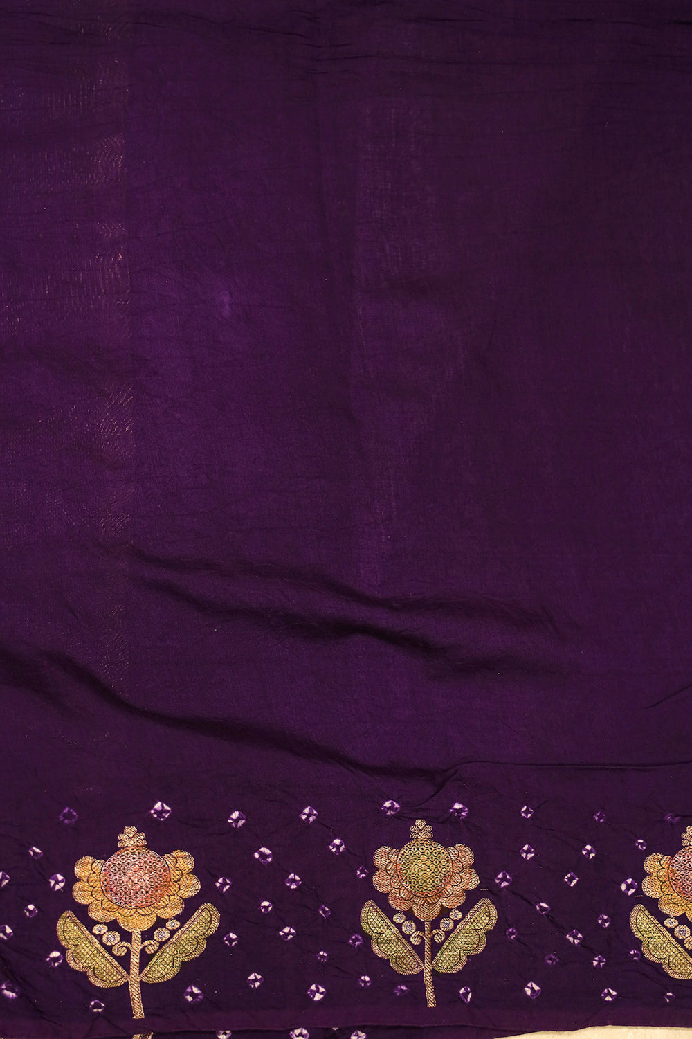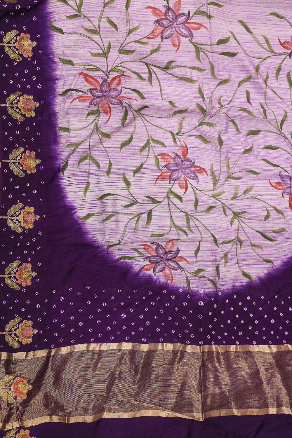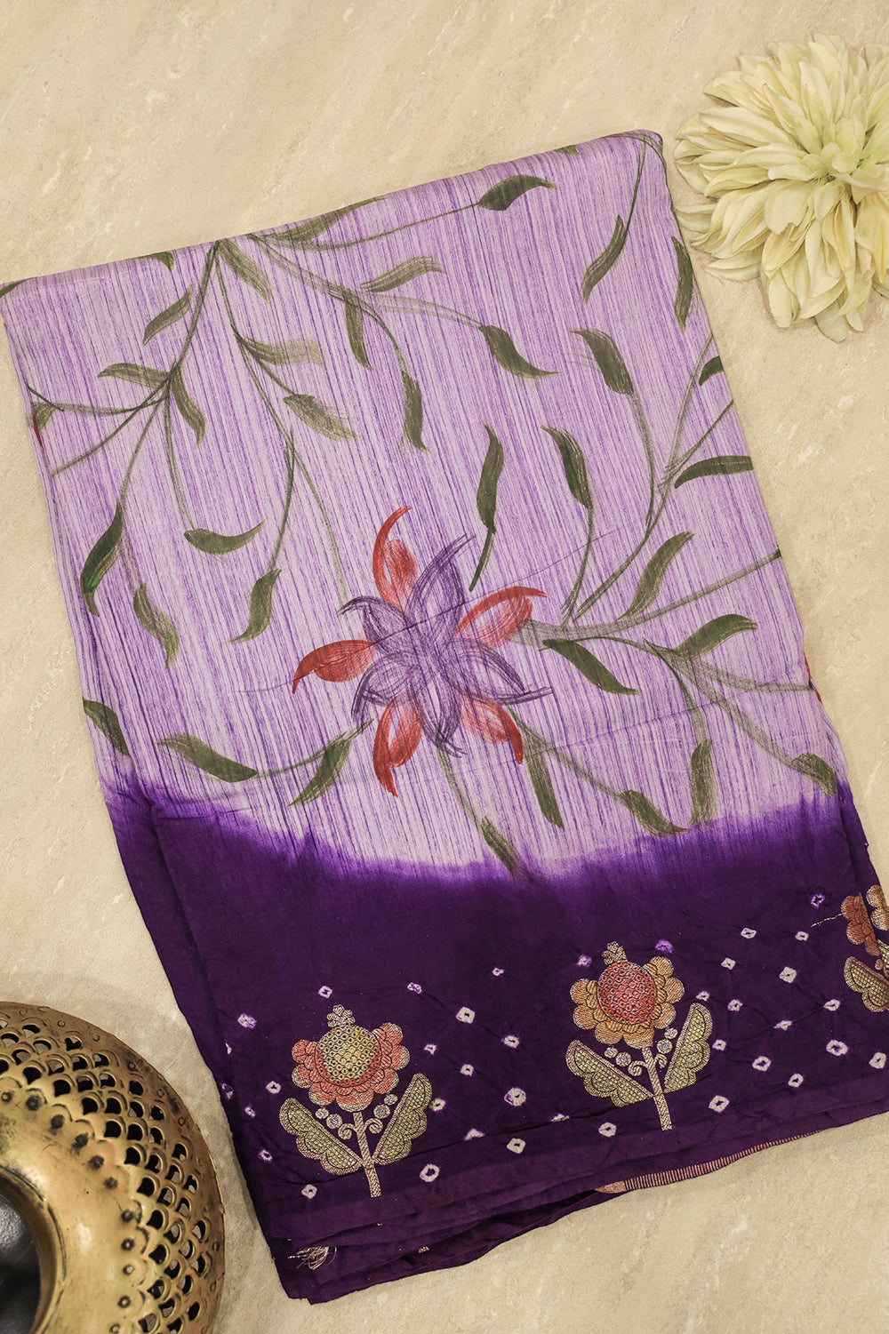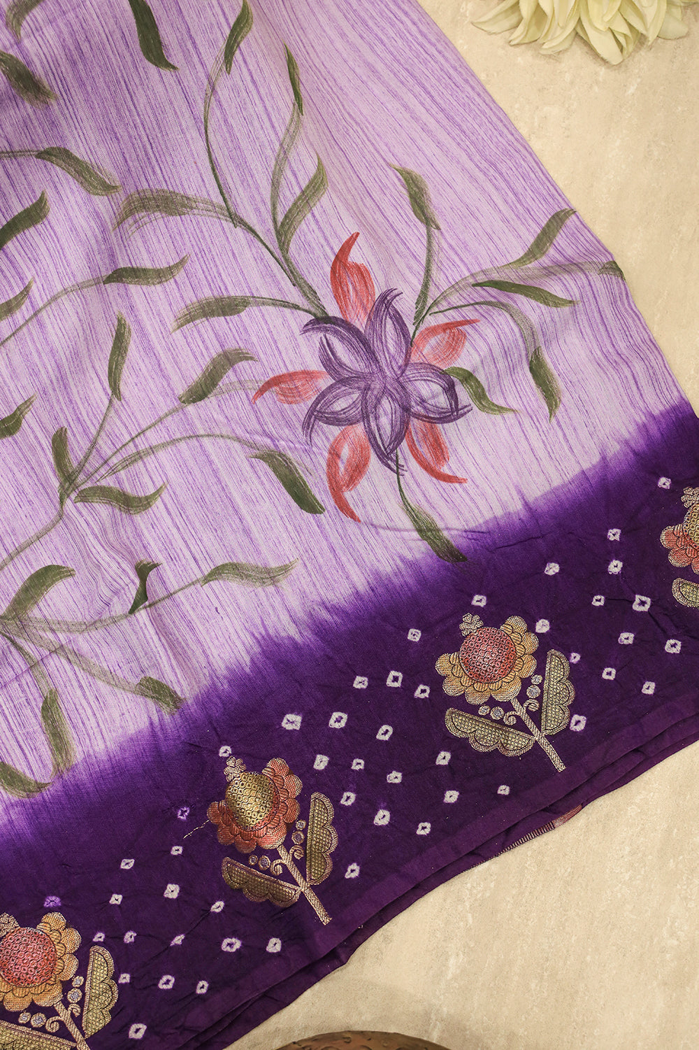 A beautiful lavender Banaras saree featuring a crushed texture and delicate hand-painted floral vines. It is paired with a deep purple border that showcases intricate floral embroidery. The design combines artistic painting with traditional motifs for an elegant look. unstitched blouse attached.