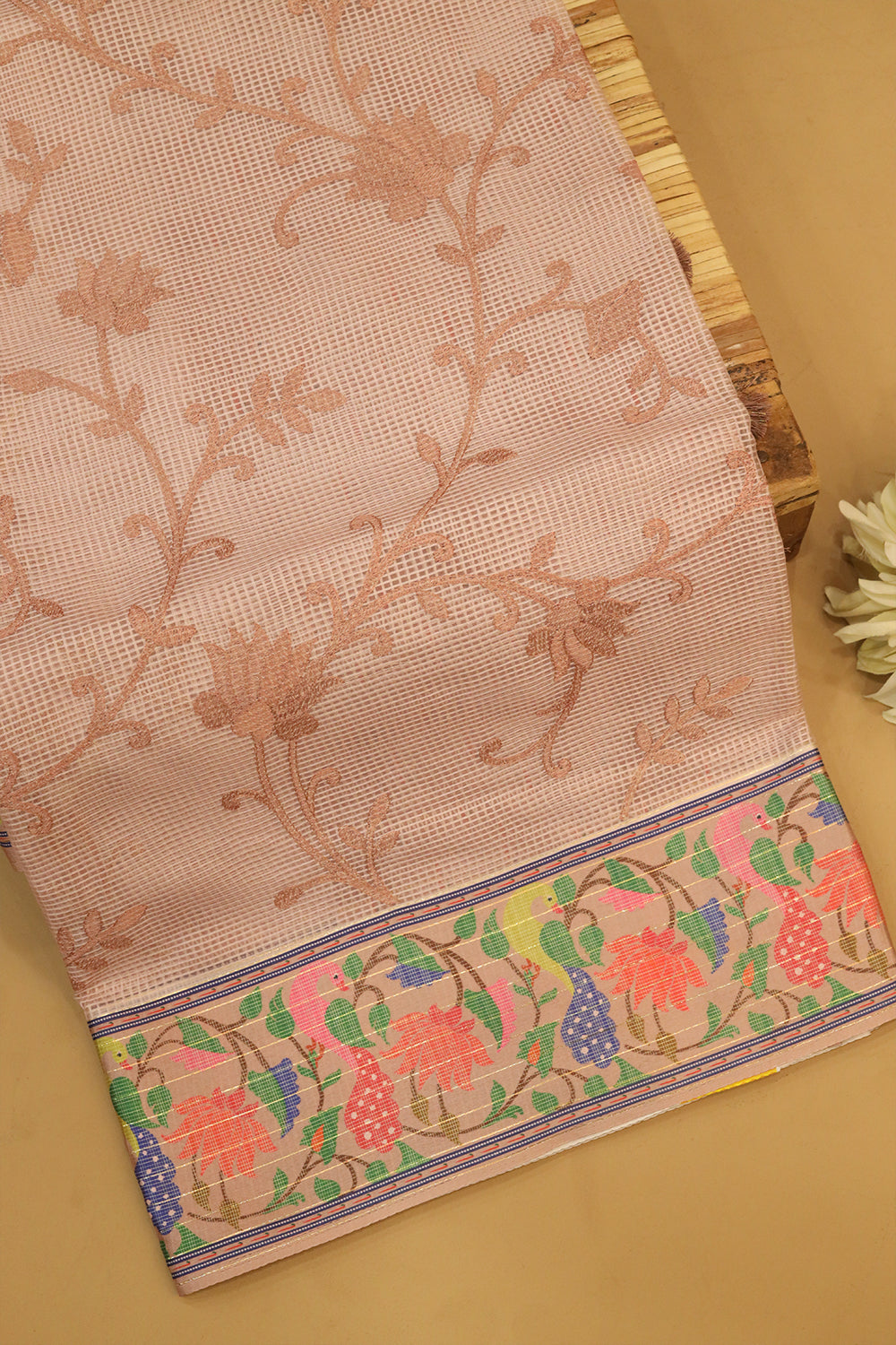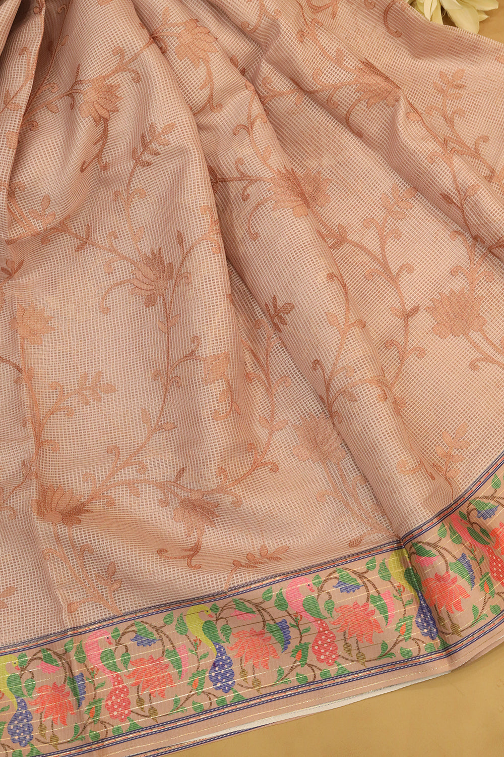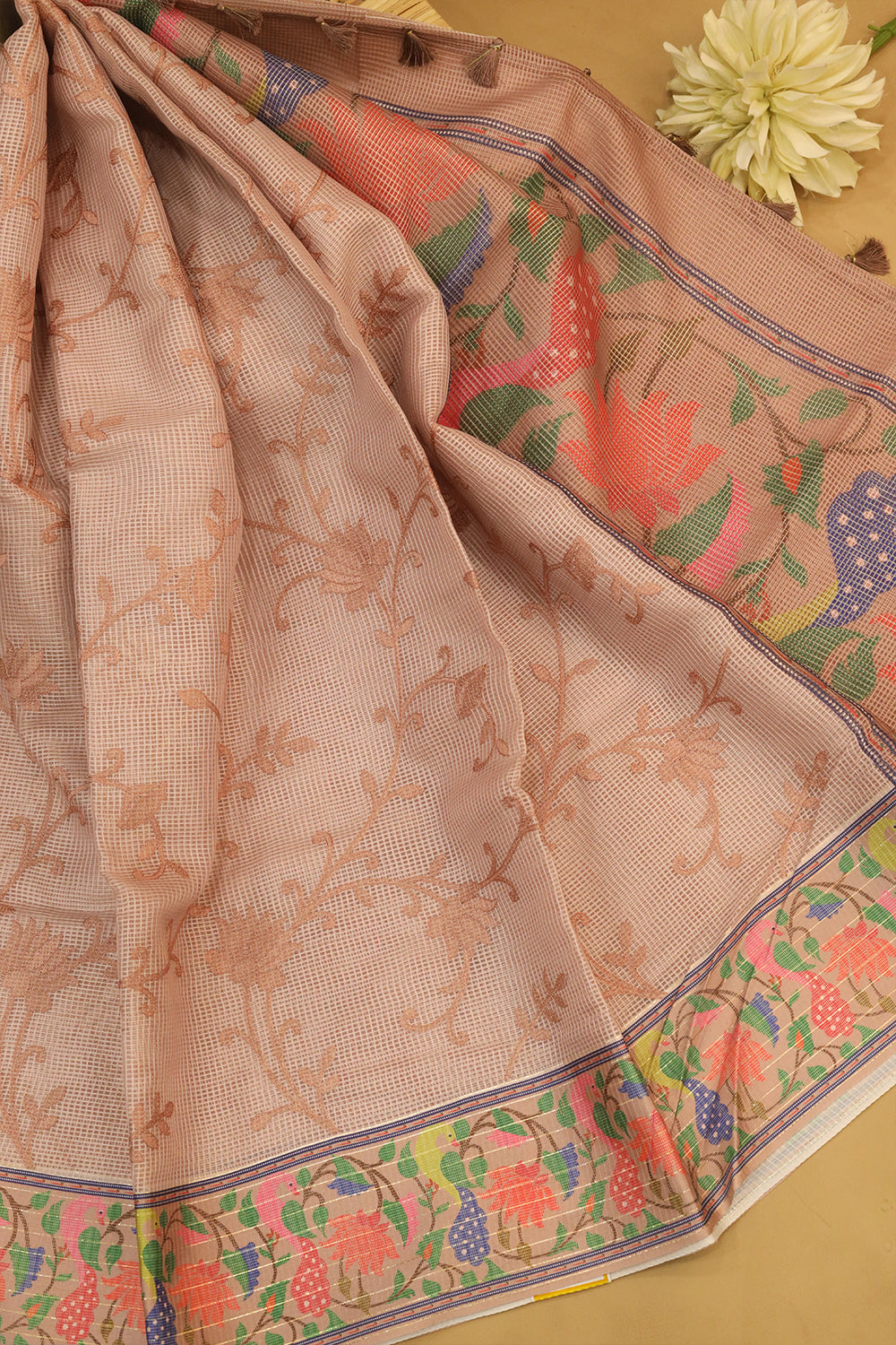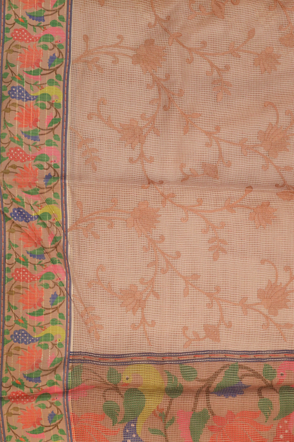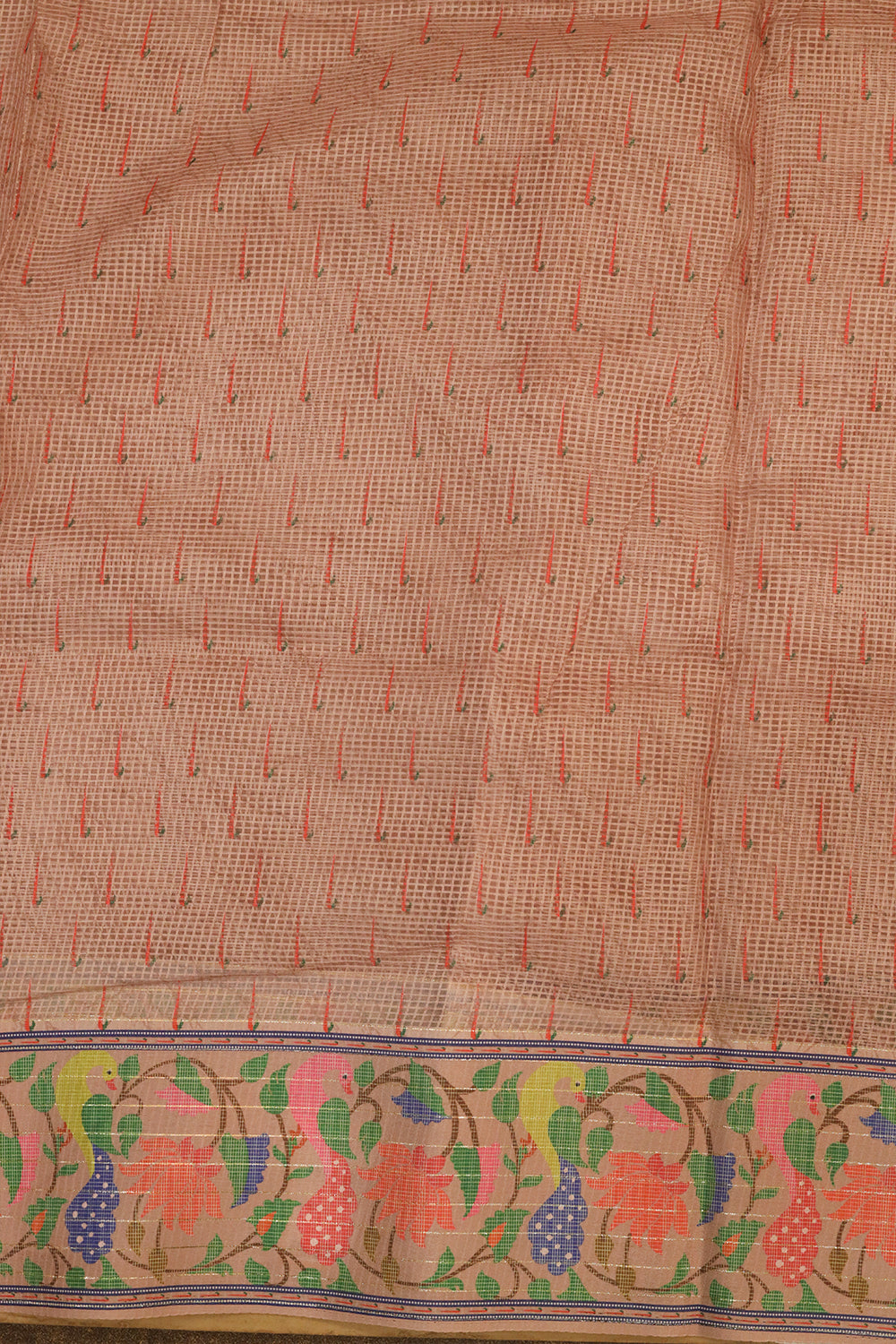Light Brown tissue Organza Saree having a beautiful embroidered design all over the body. Lotus pattern design motifs border. unstitched blouse attached.