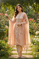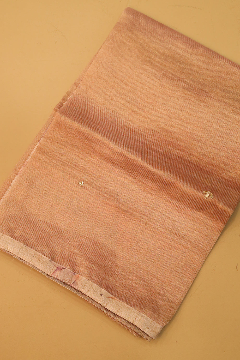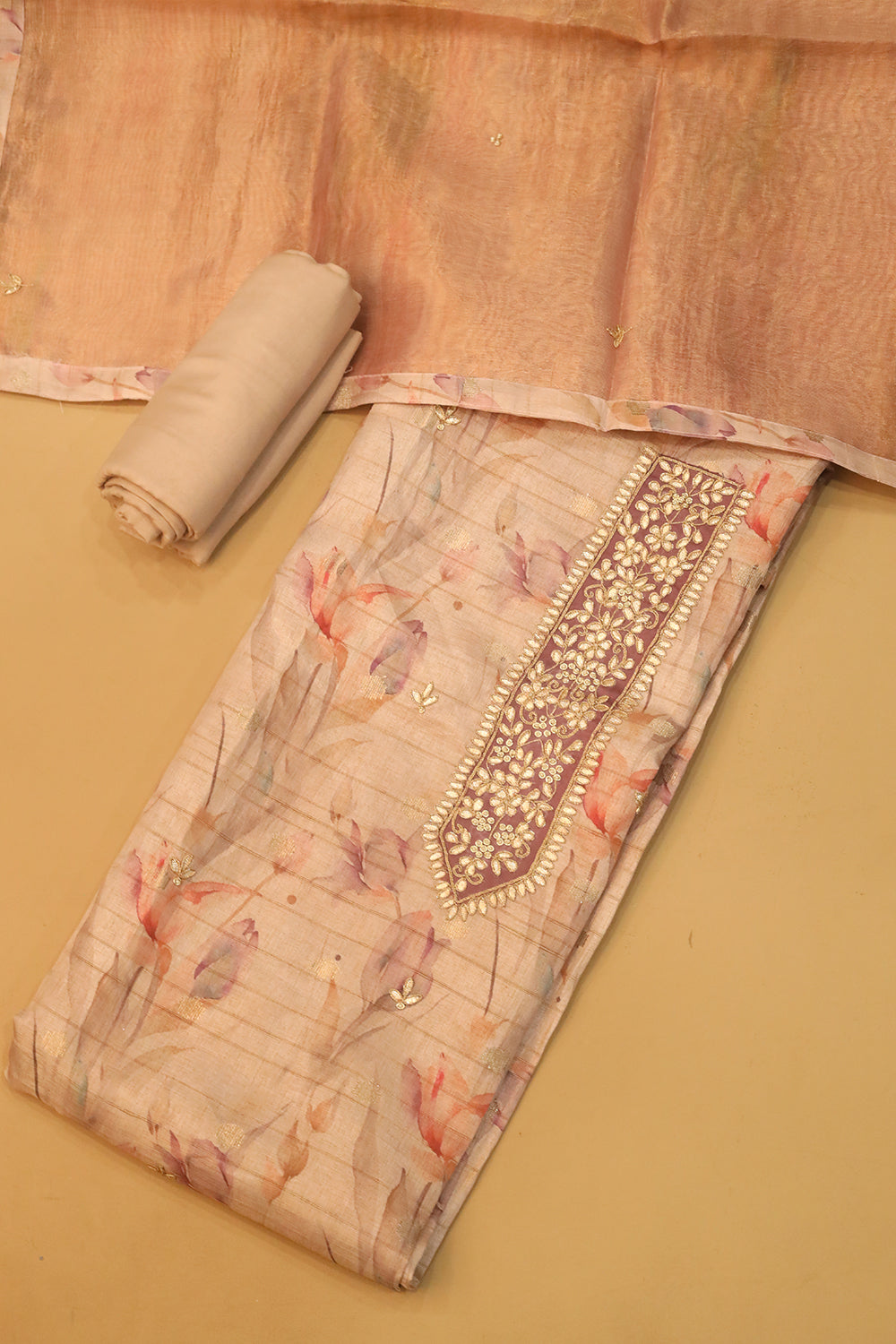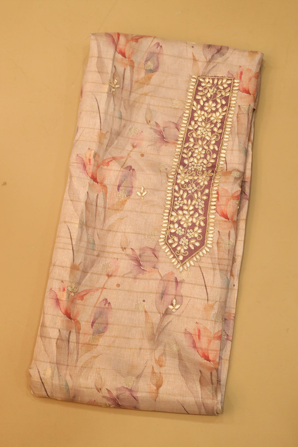 Light Onion Pink Salwar Material having a lovely colorful floral impressions and dots with golden zari design. Light Onion Pink lovely net dupatta.