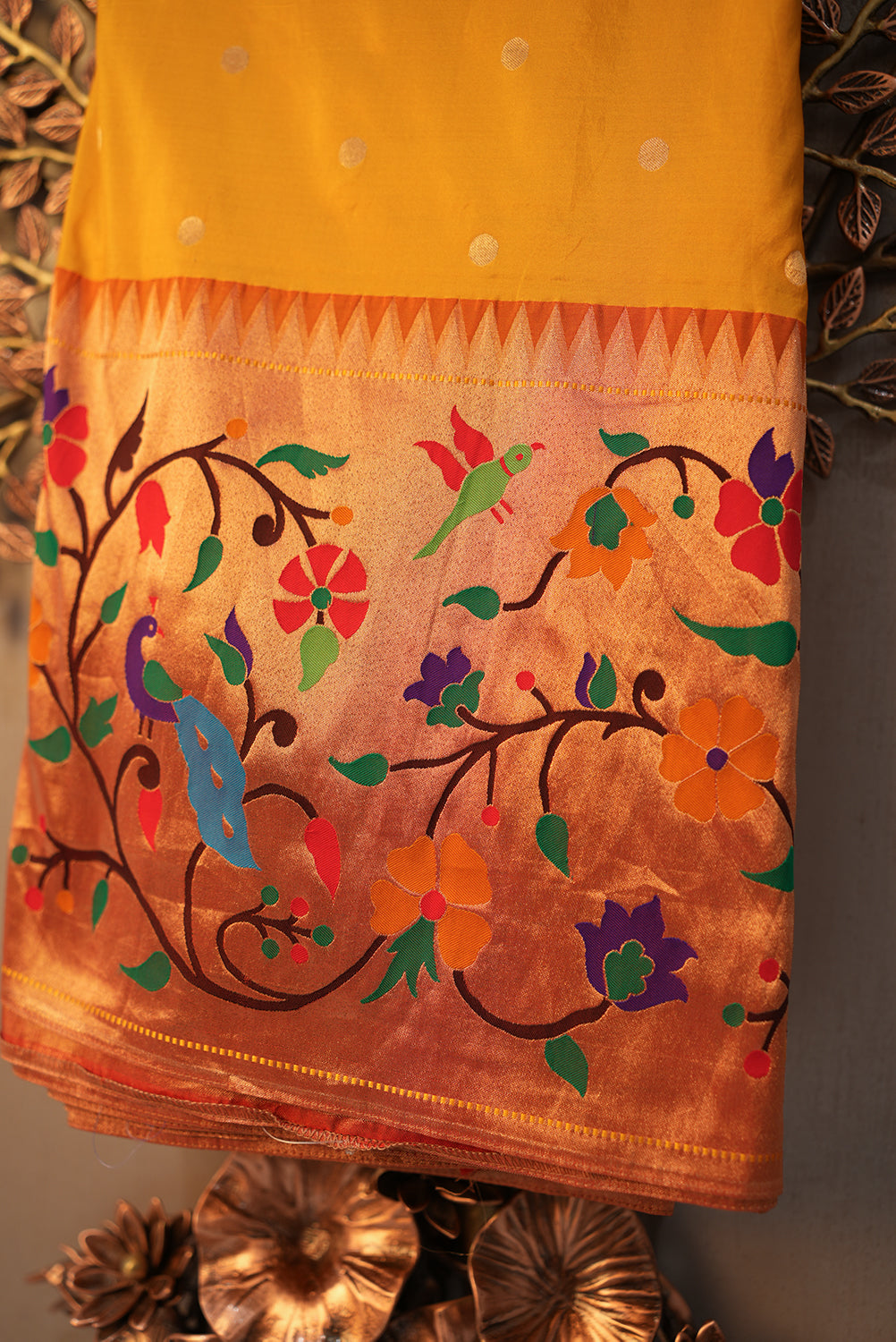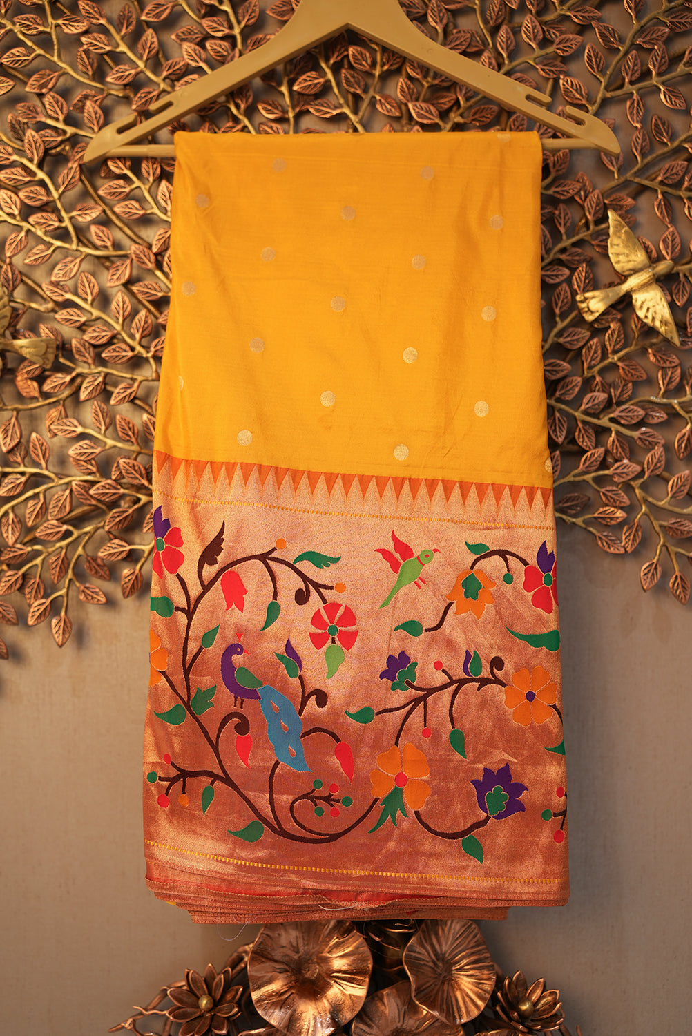 This elegant mustard pure silk fabric is enhanced with a traditional Paithani border featuring intricate floral and peacock motifs, perfect for creating a classic and beautiful ensemble.