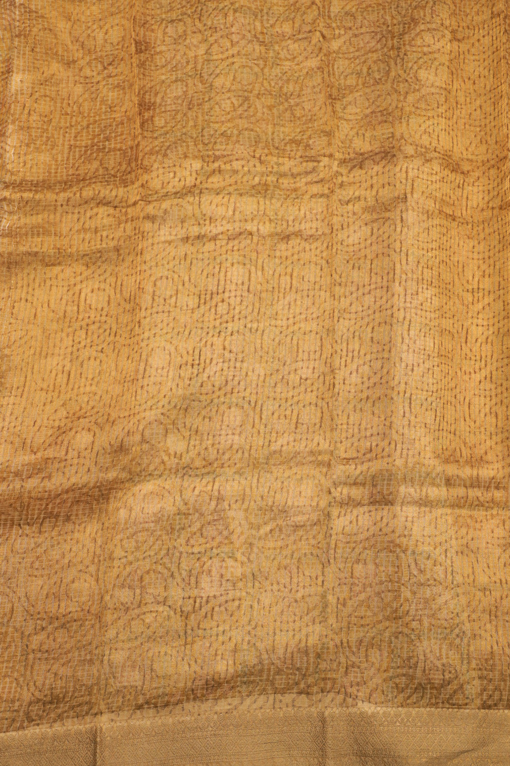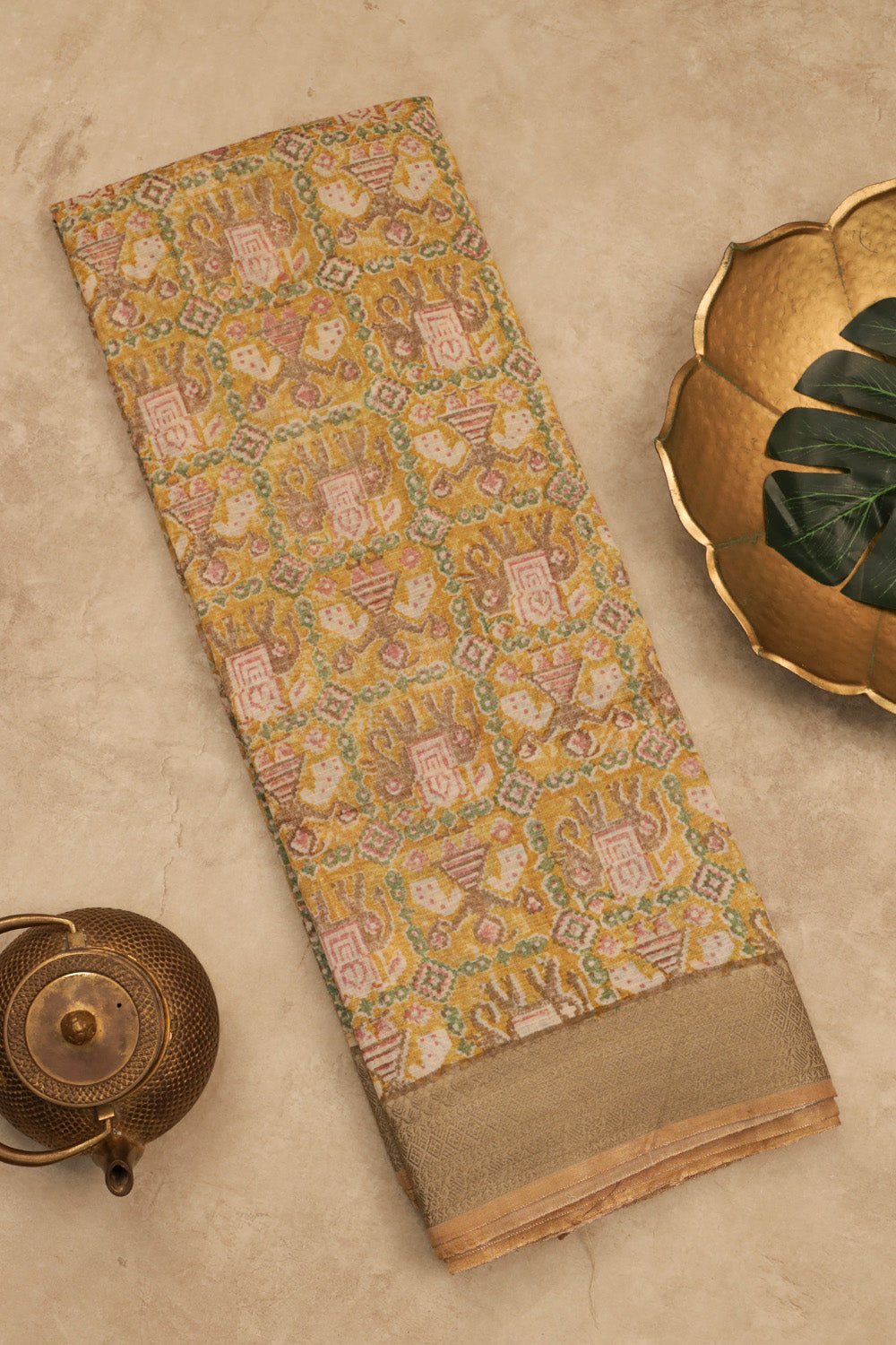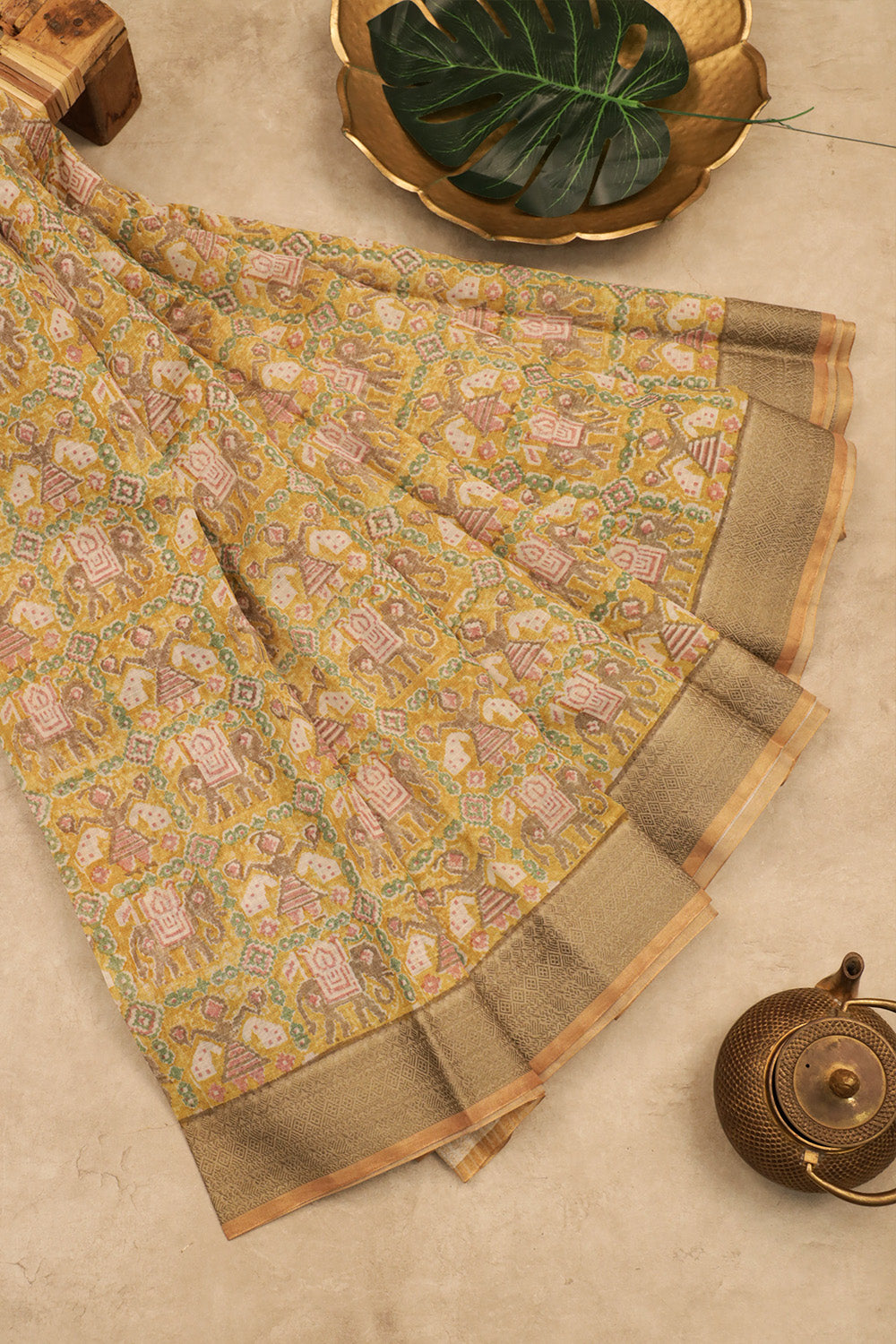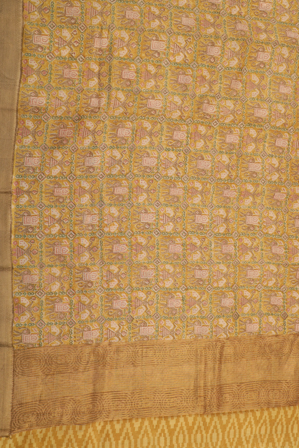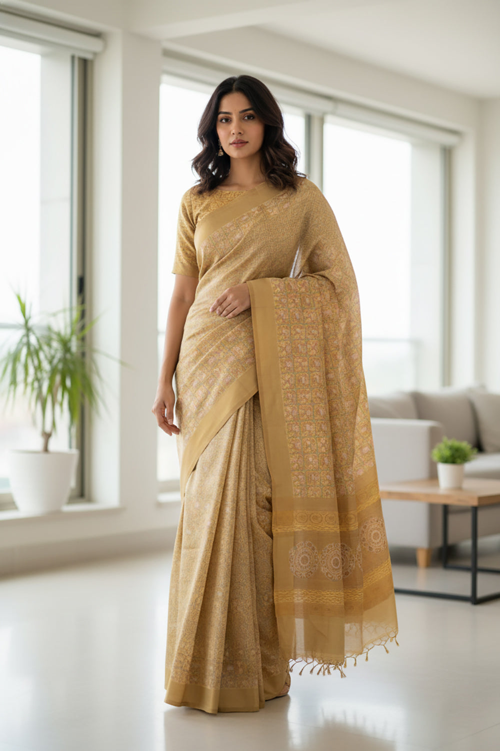 This mustard yellow linen saree features a unique geometric pattern with traditional block print motifs in subtle shades. The saree is finished with a contrasting gold border. Unstitched blouse attached