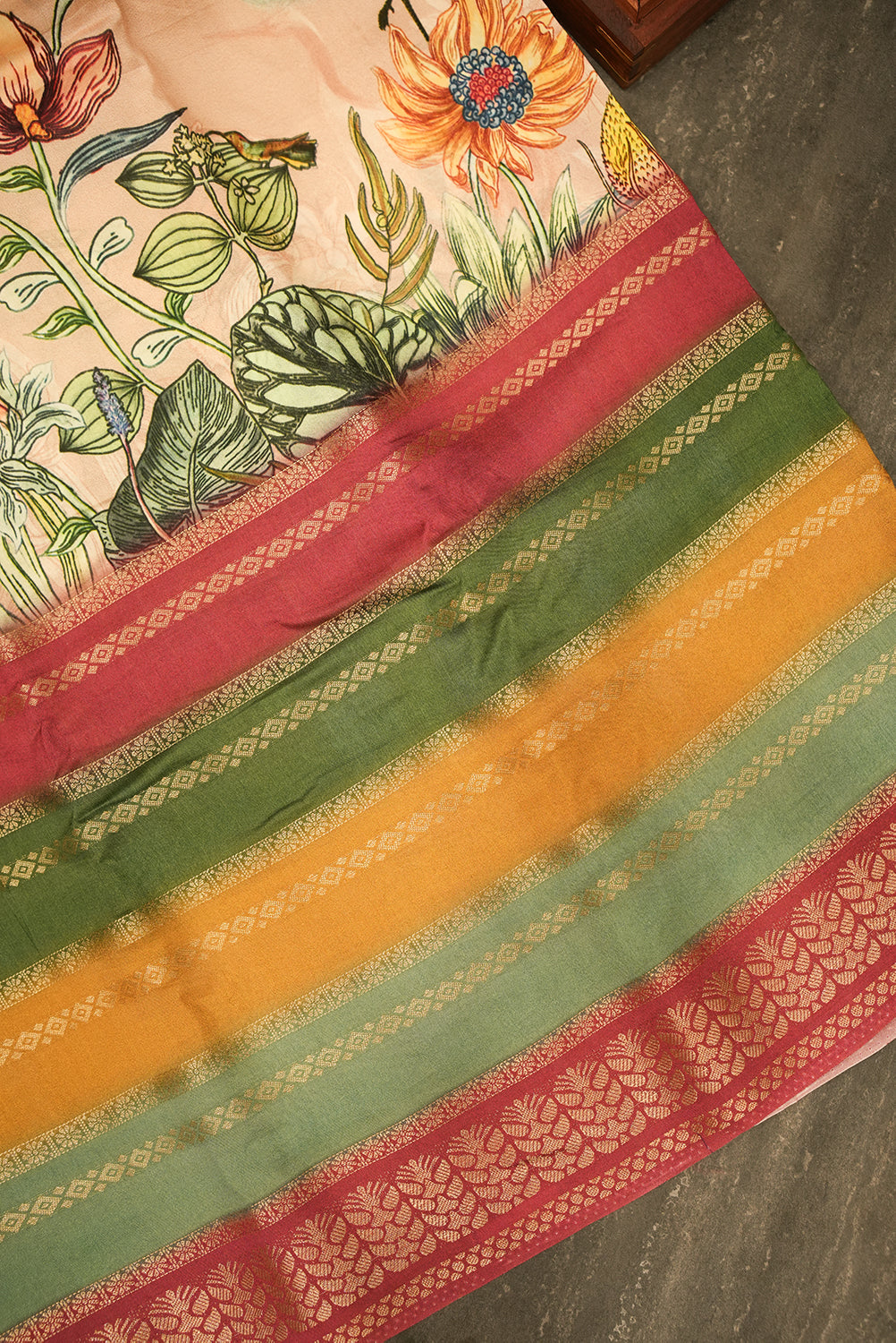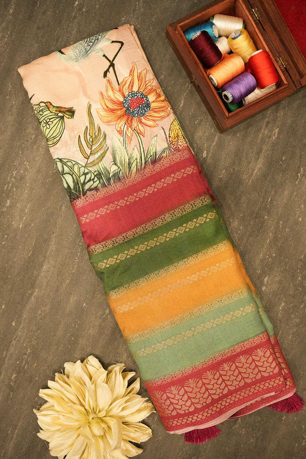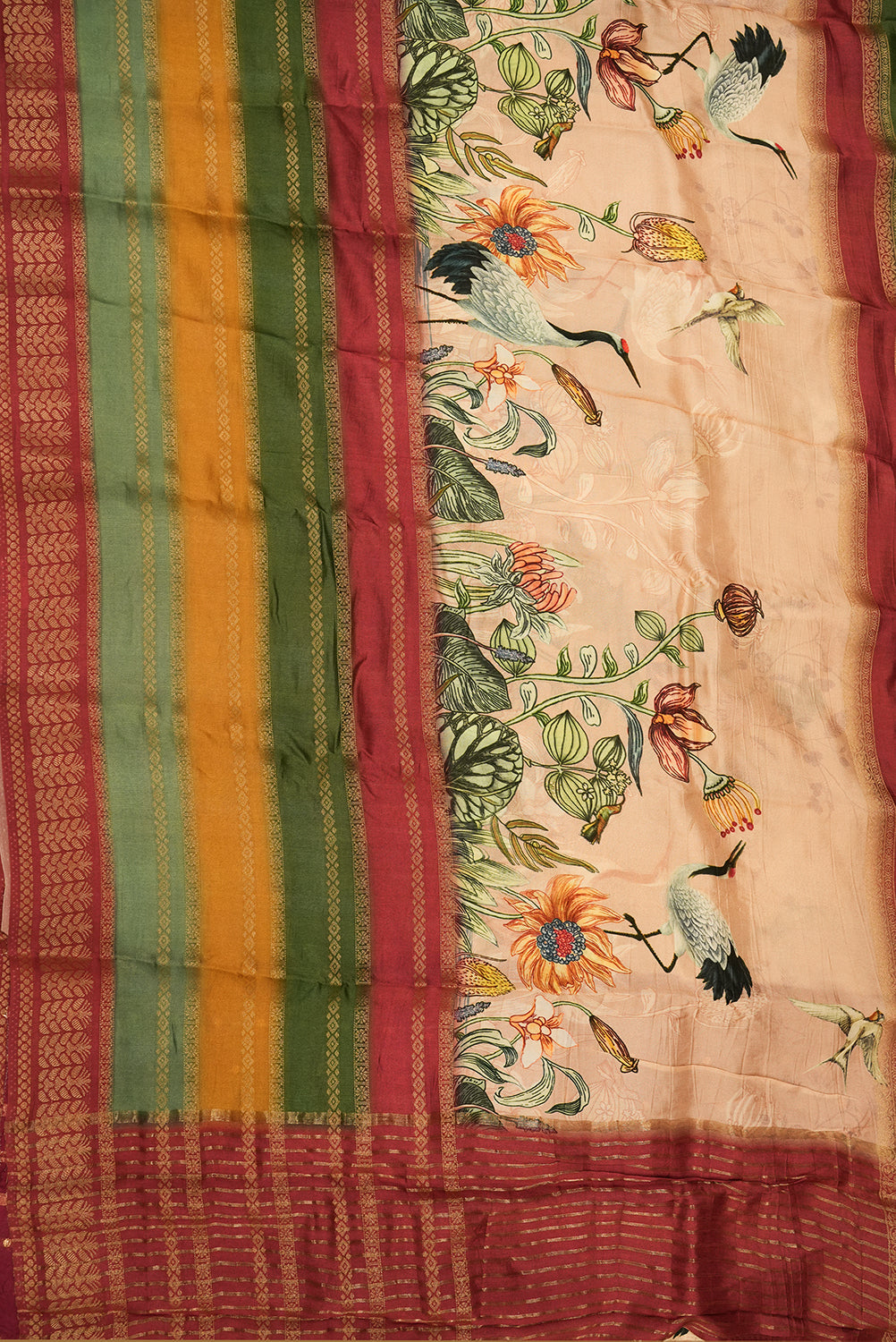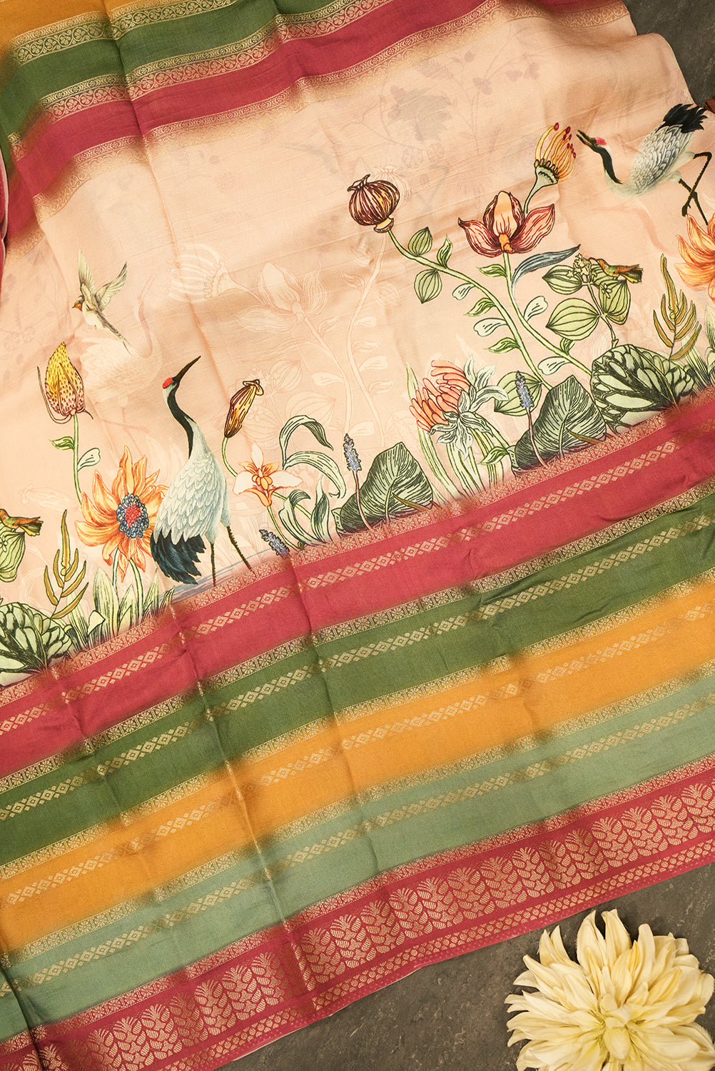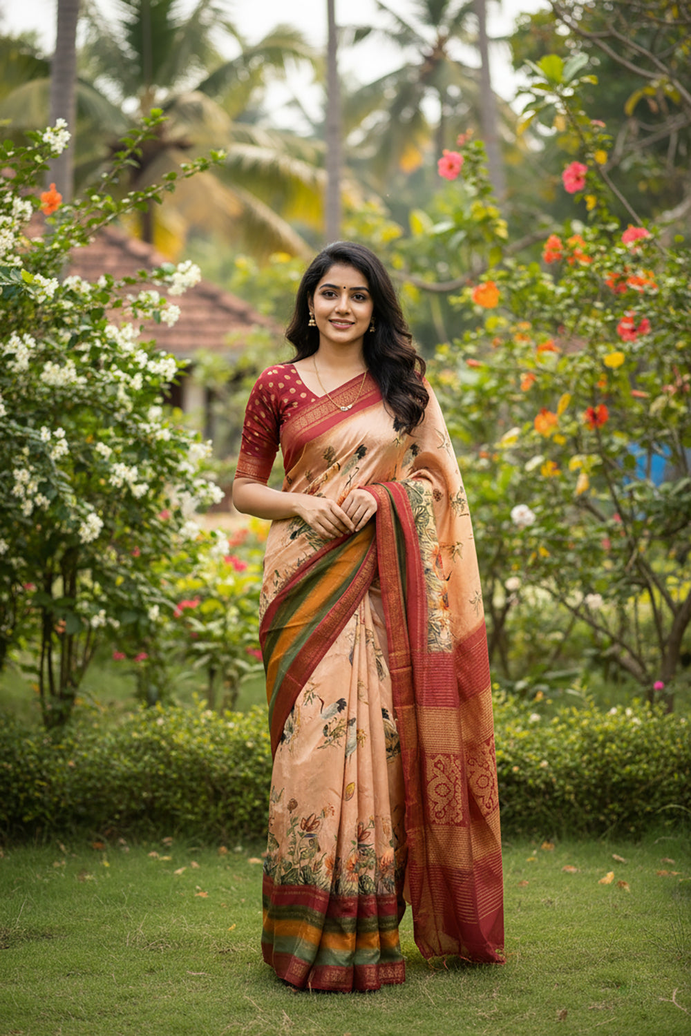 An elegant tussar silk saree featuring a soft pastel peach base adorned with hand-drawn cranes, floral motifs, and lush foliage. The saree is enhanced with dual-tone maroon, moss green, mustard yellow, and sage borders finished with fine zari detailing. Unstitched blouse attached.