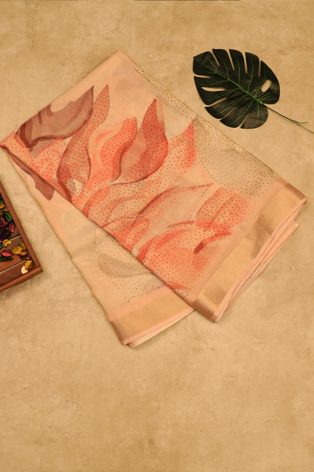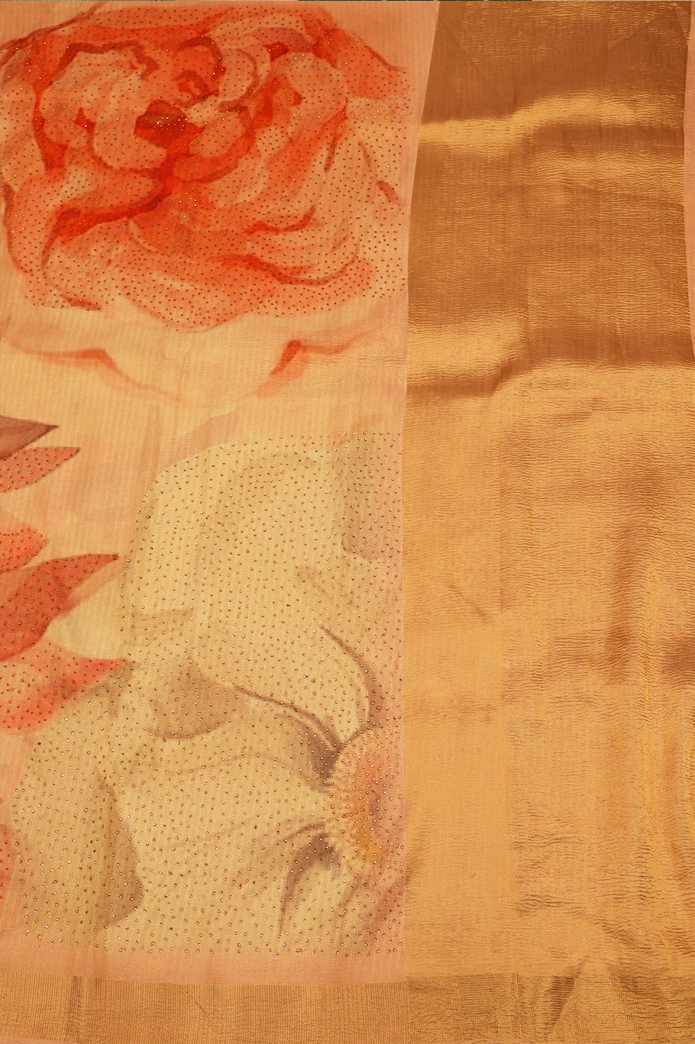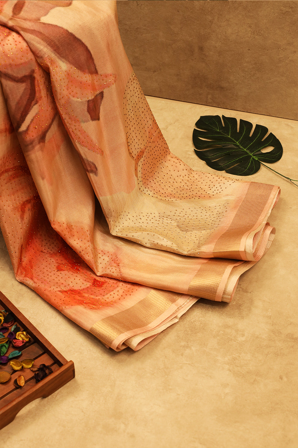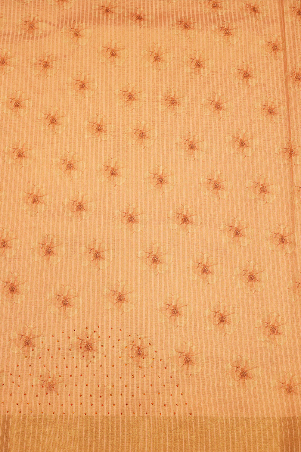 Indulge in the subtle elegance of this peach-toned linen saree, featuring delicate floral motifs in muted shades of coral and brown. Perfect for day time events or intimate gatherings. Unstitched blouse attached