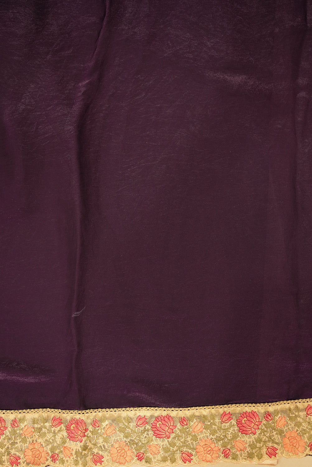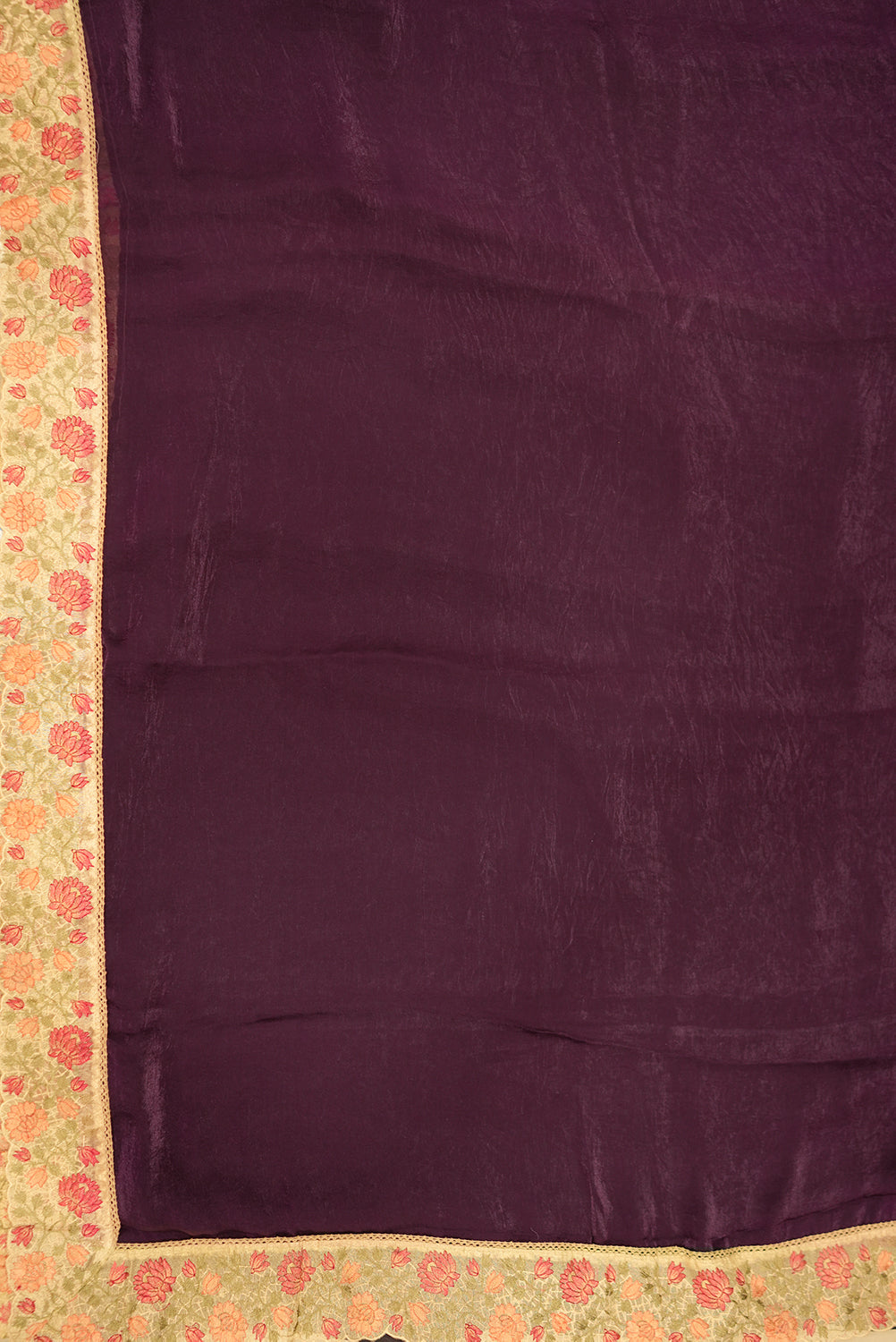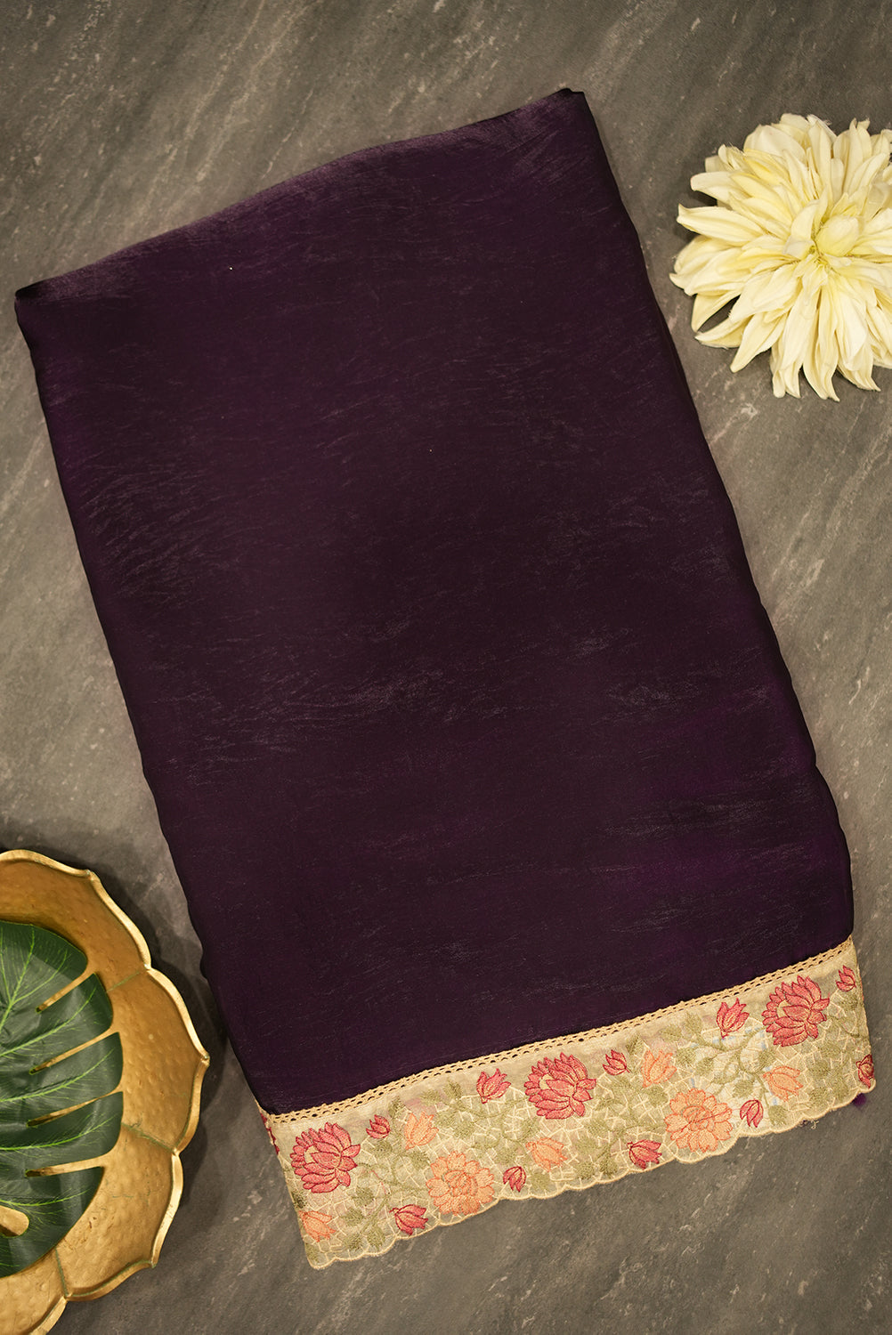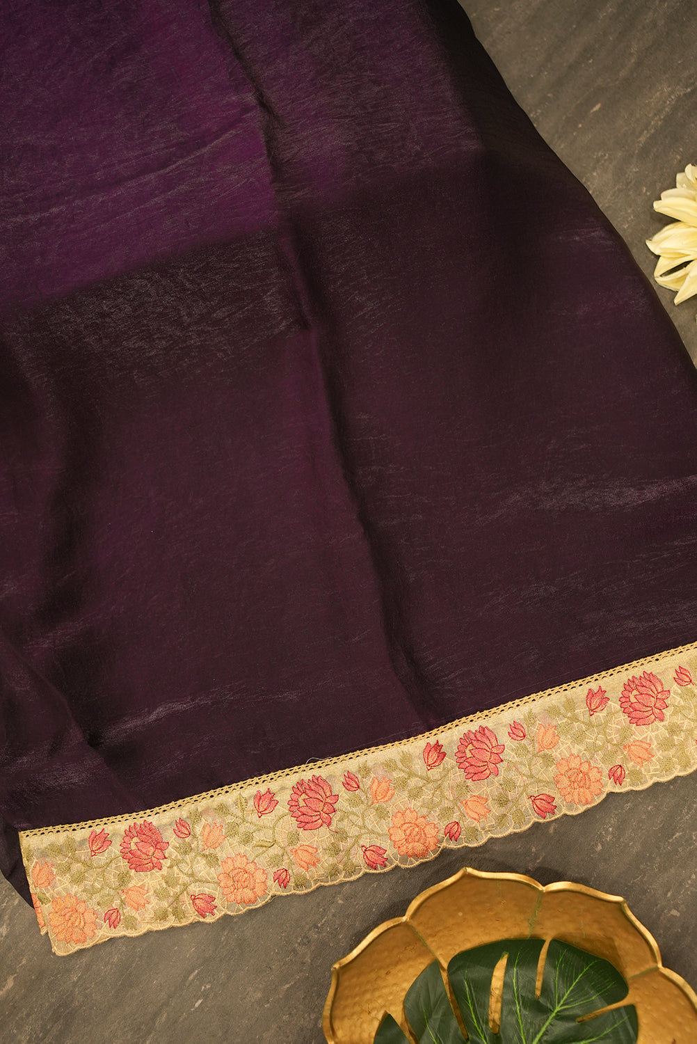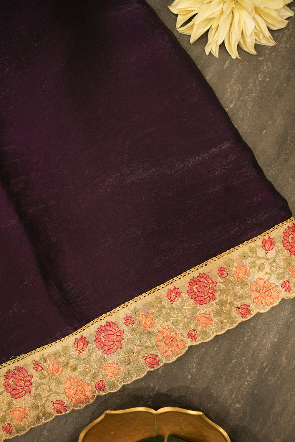 This elegant saree features a deep plum purple body made from crushed Jimmy Choo fabric, giving it a subtle shimmer. The intricate floral lace border in shades of peach, pink, and gold adds a delicate contrast, perfect for any special occasion. Unstitched blouse attached.