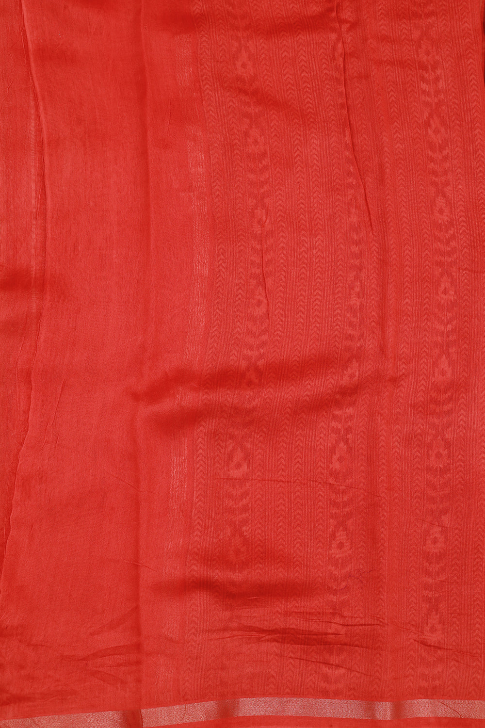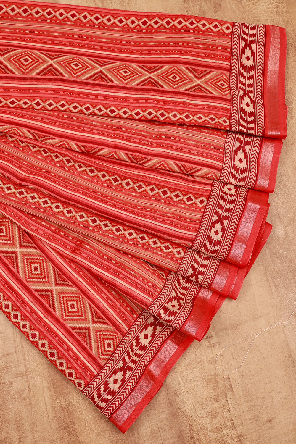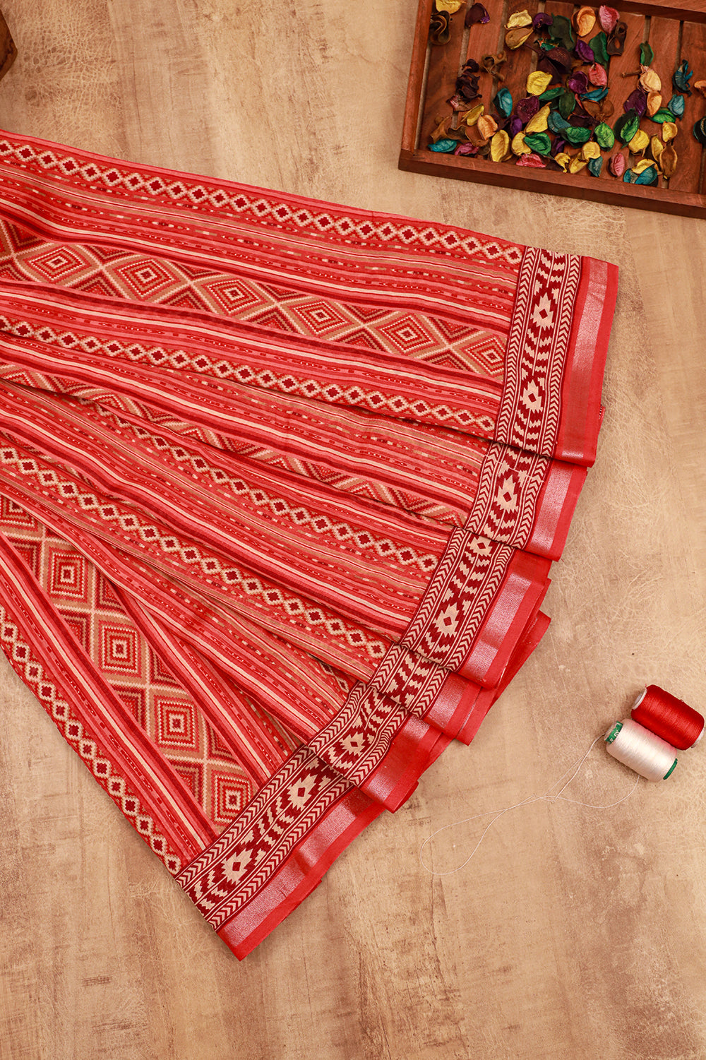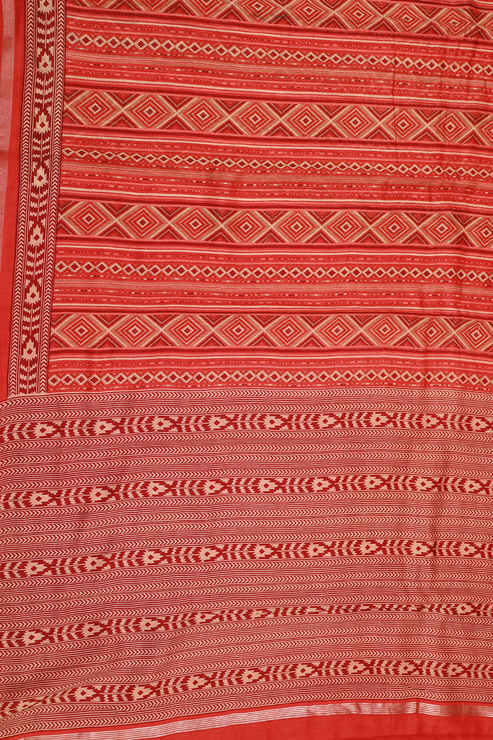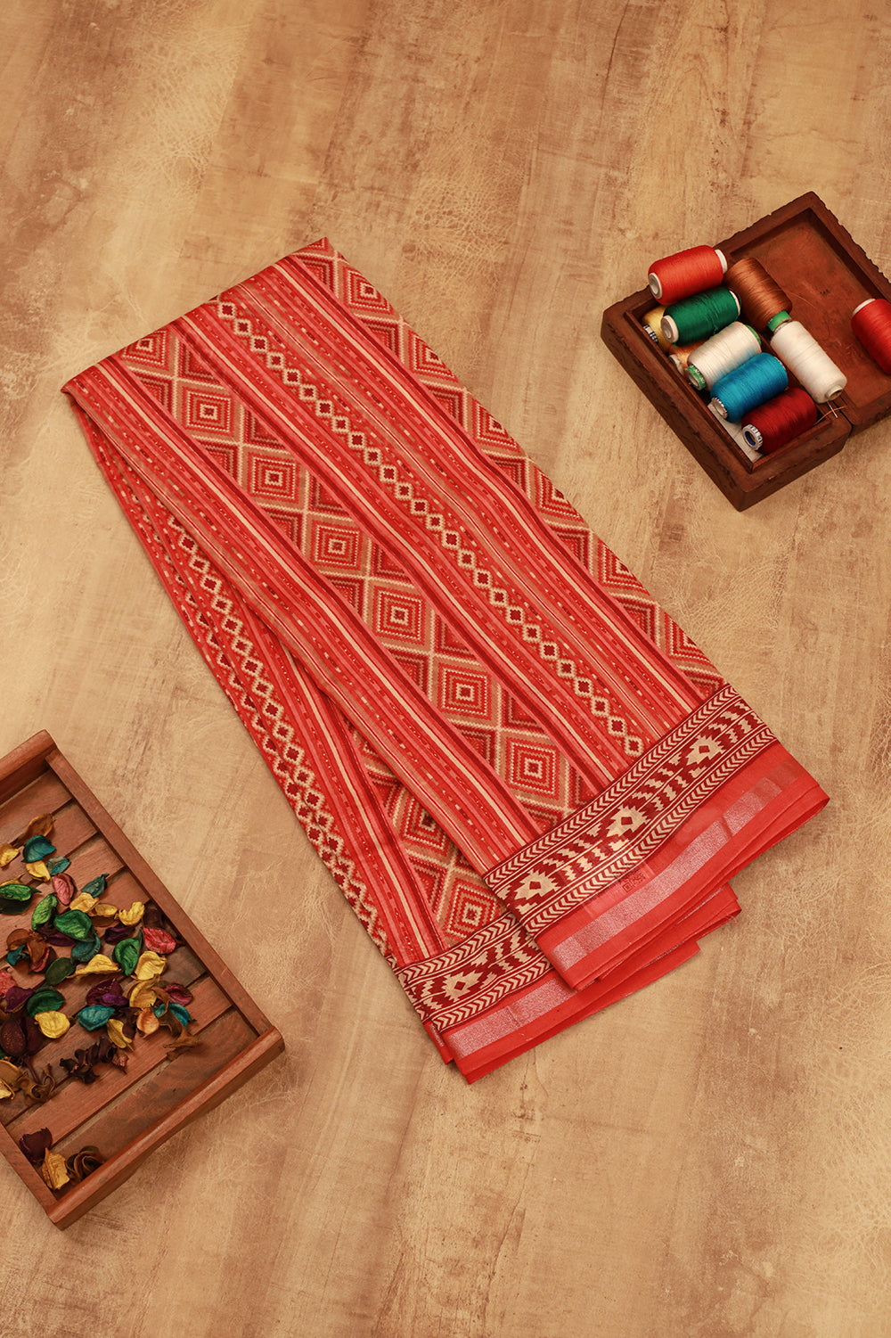 Embrace effortless elegance with this rustic red Chanderi cotton saree. The warm, earthy red base is adorned with a captivating geometric pattern in shades of light beige and cream, creating a visually appealing contrast. Unstitched blouse attached
