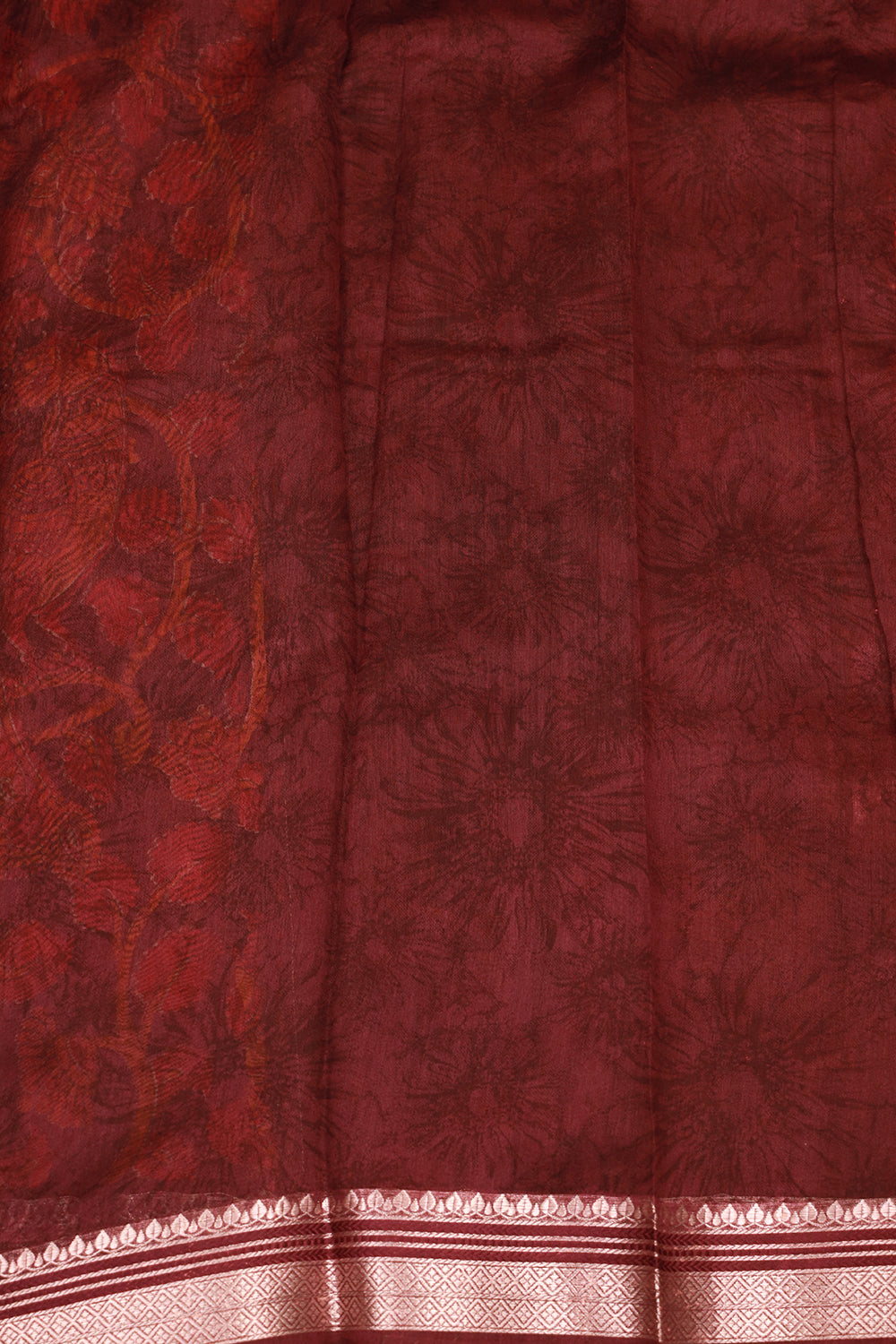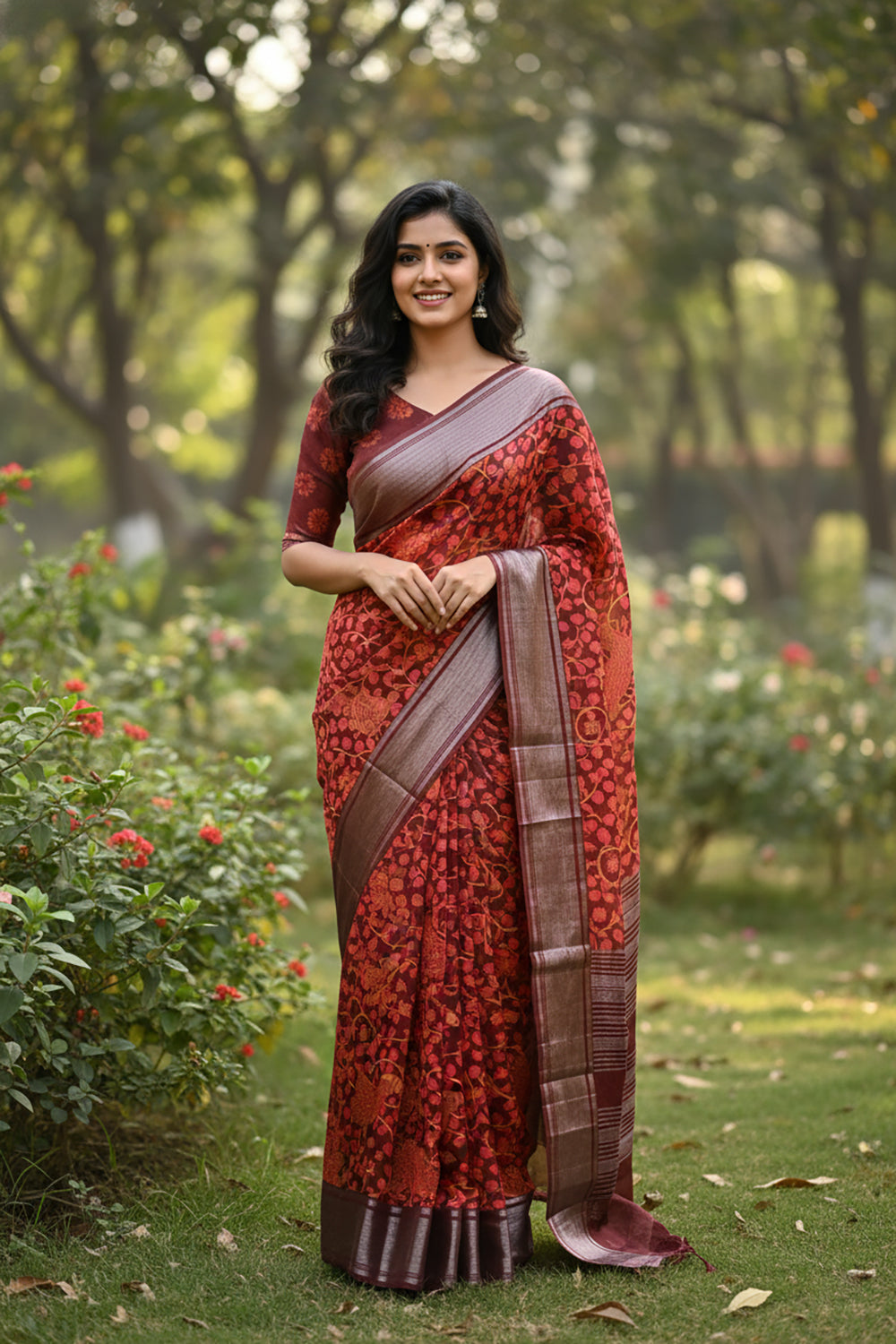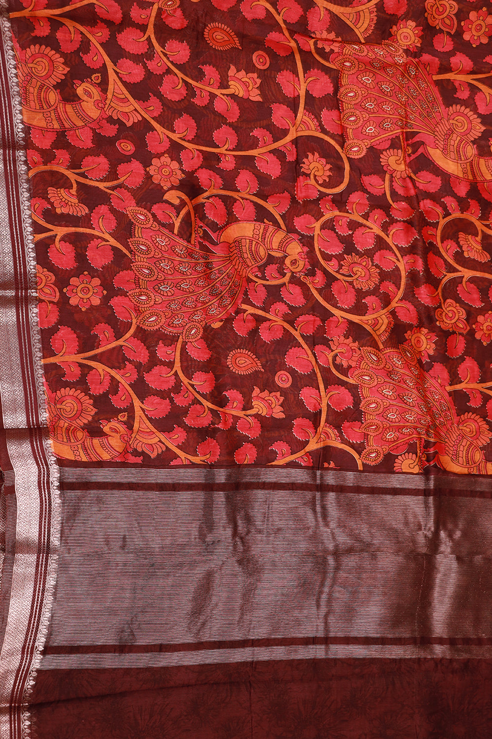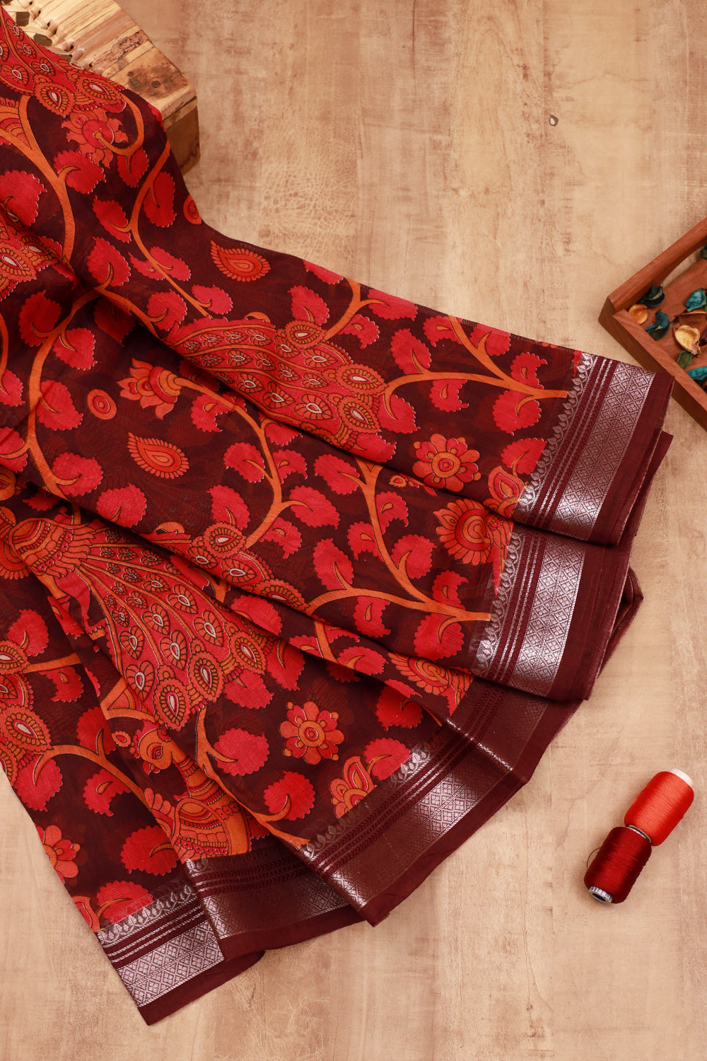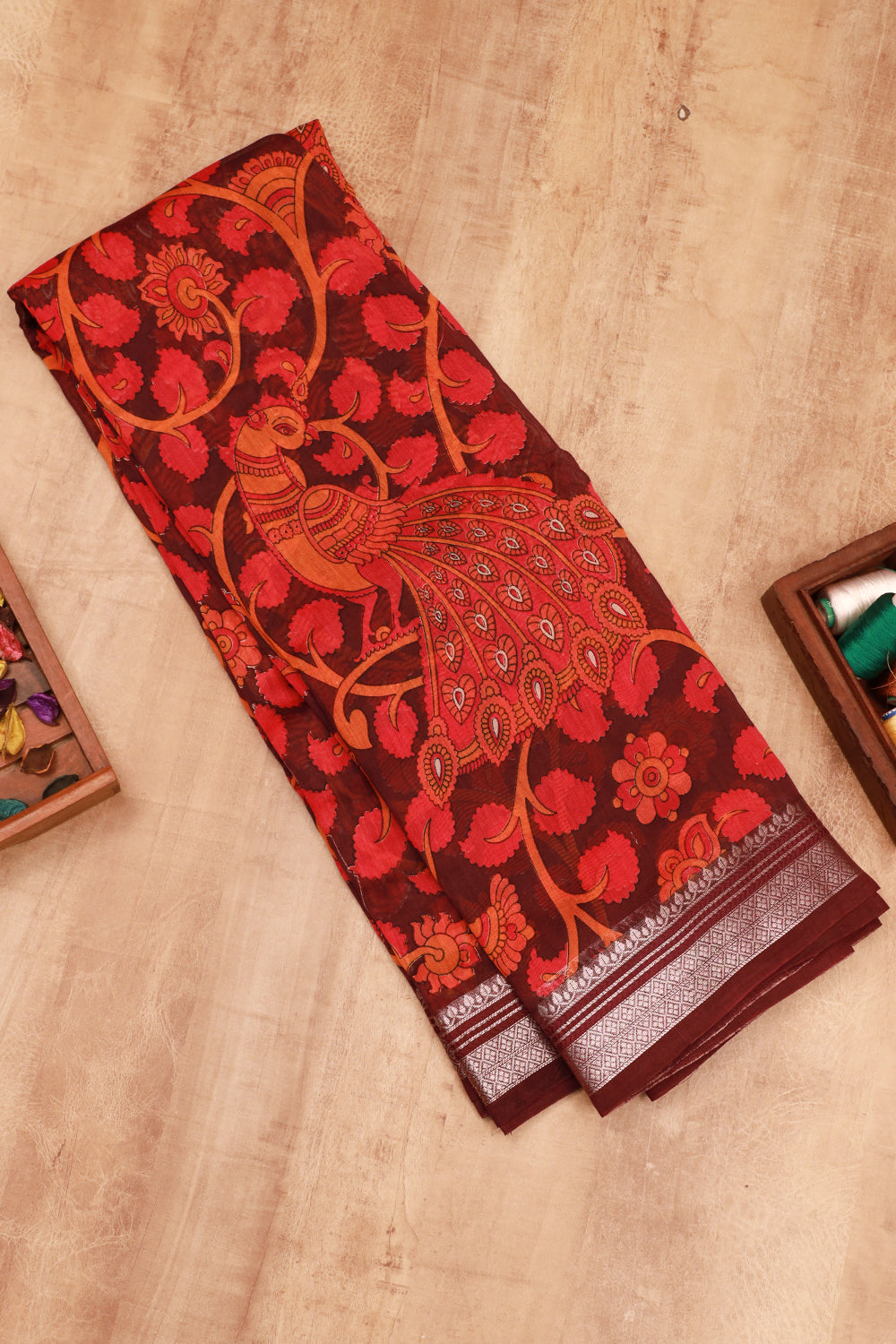 This exquisite cotton saree features a rich, deep red (almost a maroon) base adorned with a captivating hand-painted peacock motif in vibrant shades of orange and red. The intricate design, reminiscent of traditional art, is set against a backdrop of stylized floral and vine patterns. Unstitched blouse attached