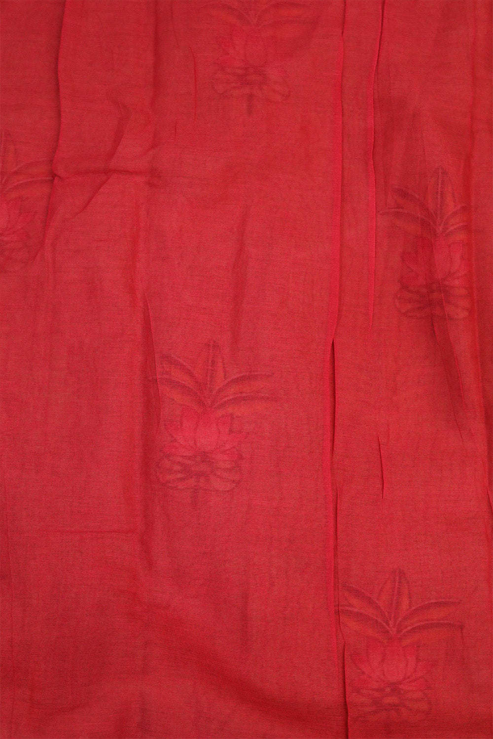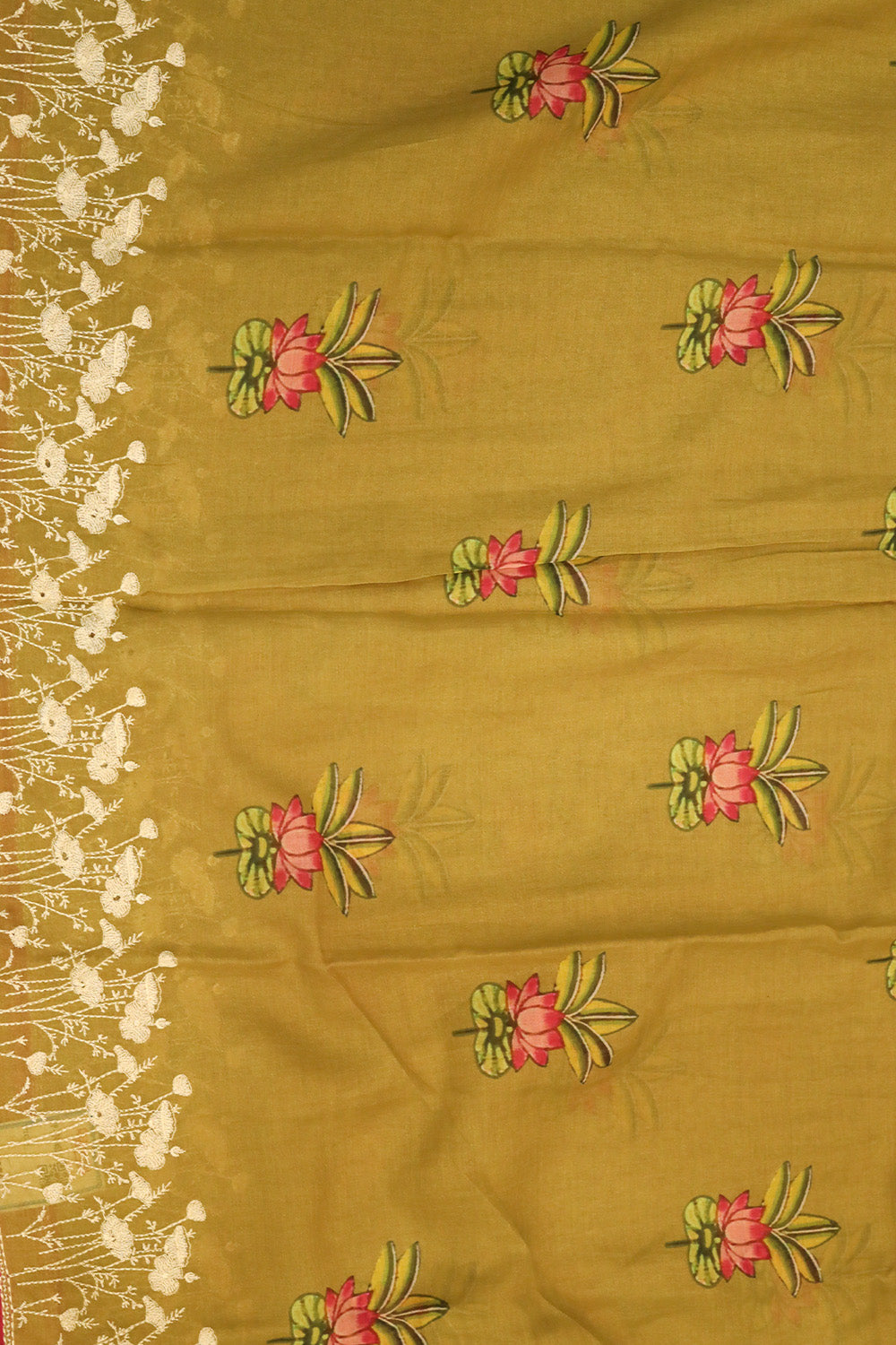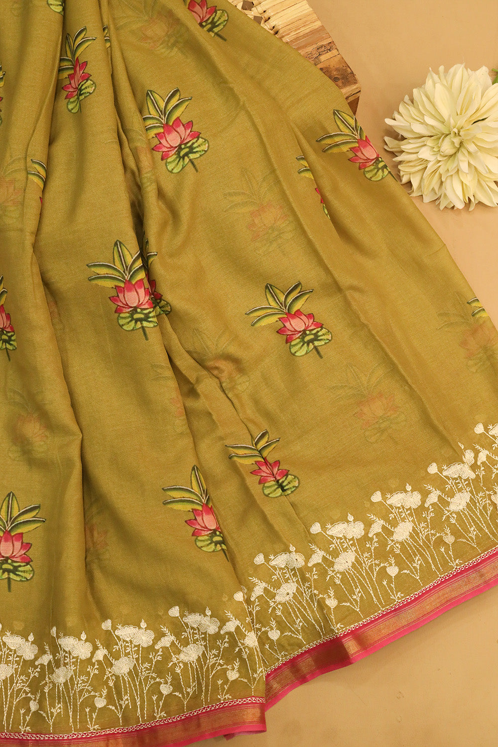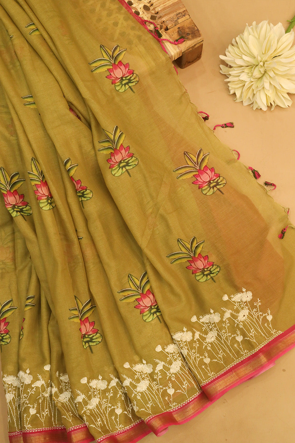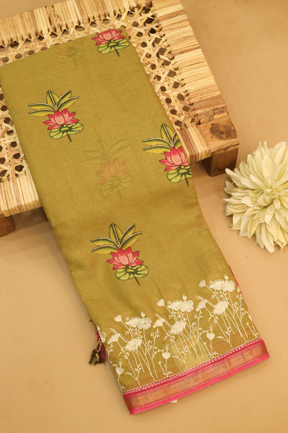 Sage Green Chanderi Silk cotton Saree having a beautiful lotus with leaf motifs design all over the body. Embroidered floral pattern with white color and Pink with copper zari lovely border. Unstitched blouse attached.