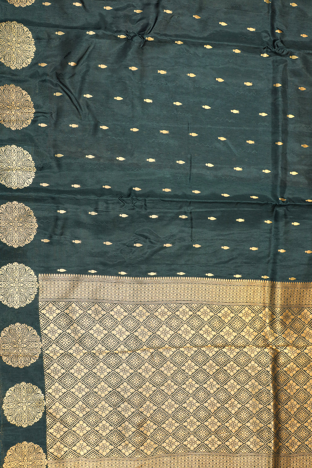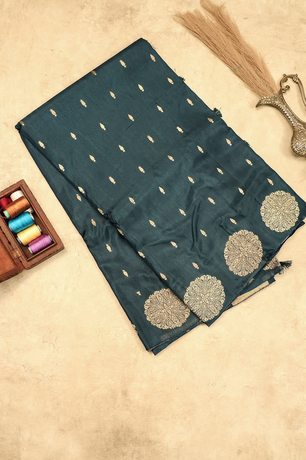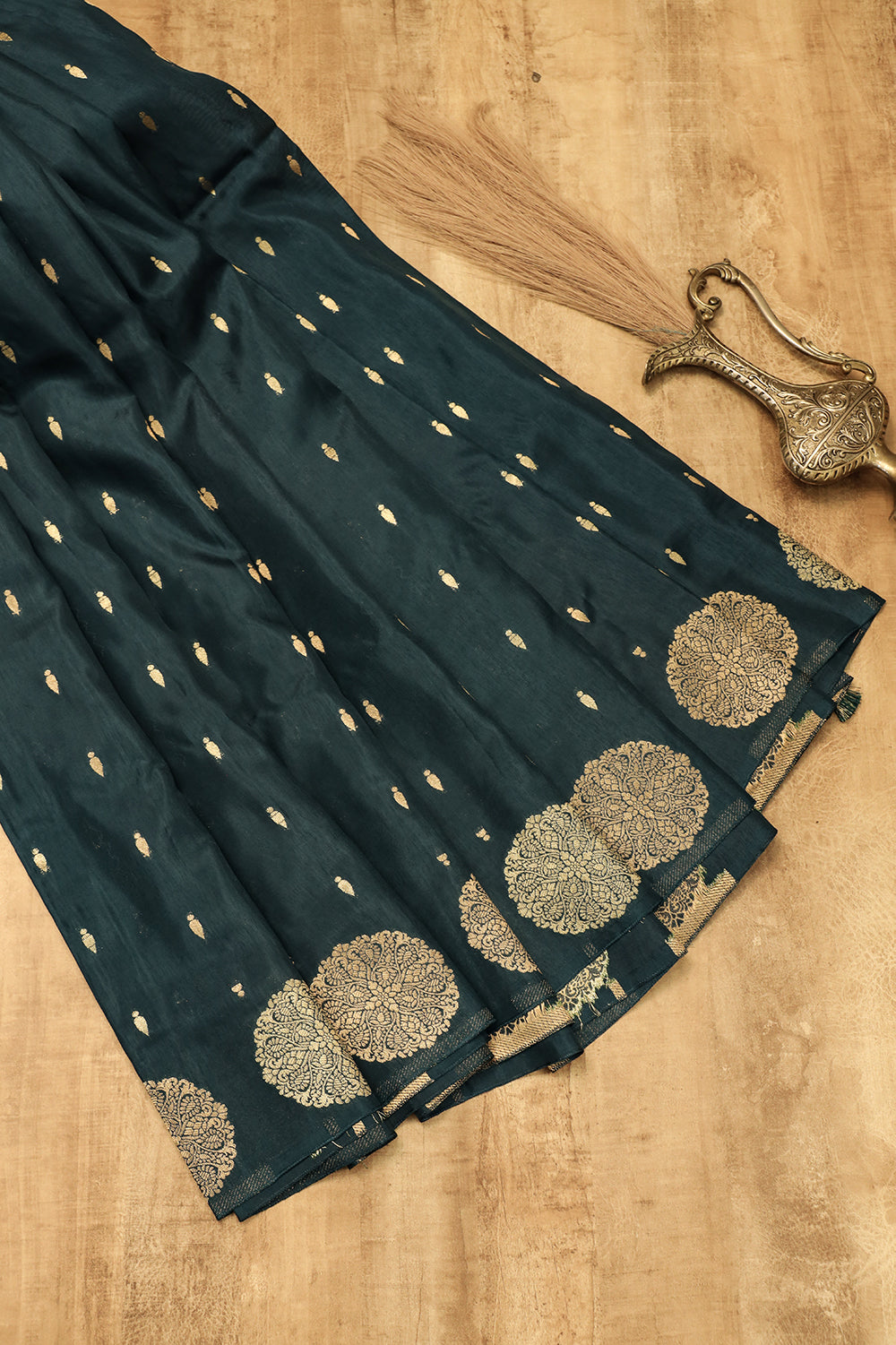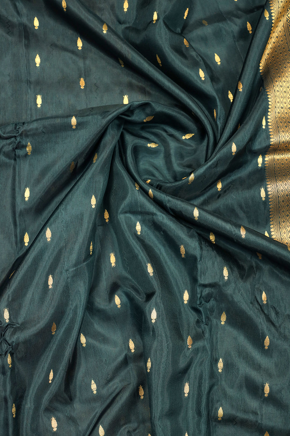 Experience timeless elegance with this teal Banaras saree. Crafted from luxurious silk, it features intricate golden zari work, adding a touch of traditional opulence. Perfect for weddings and special occasions. Unstitched blouse attached