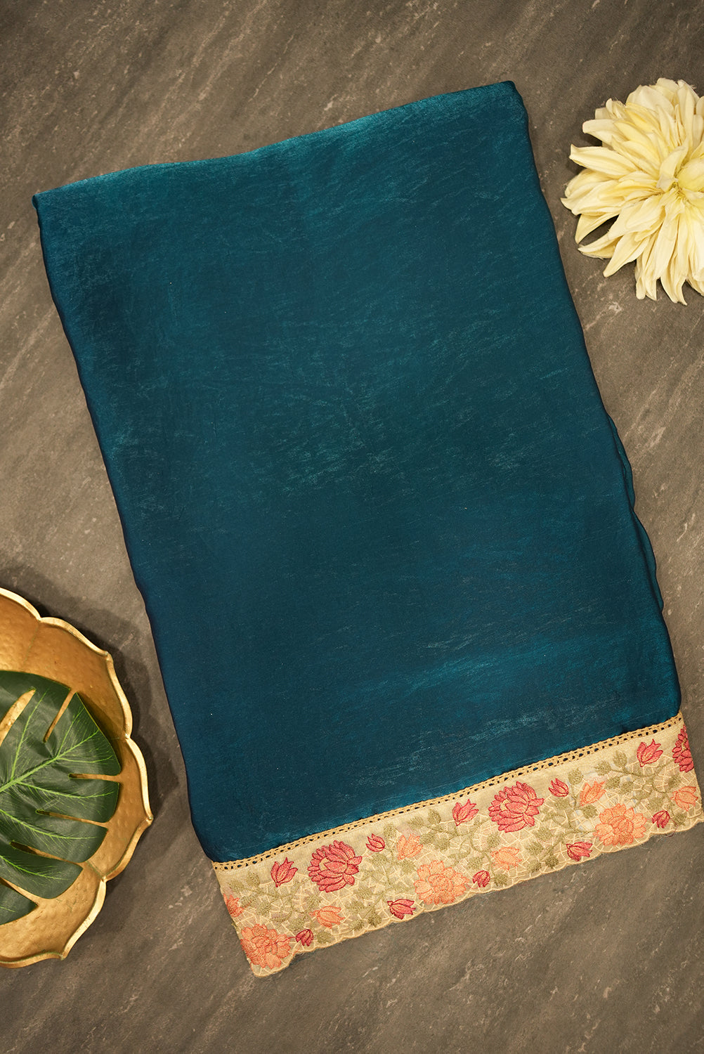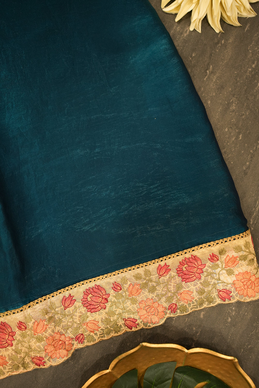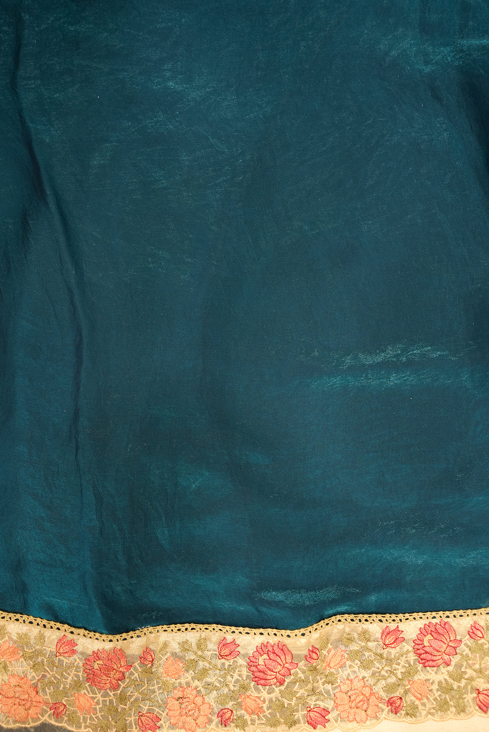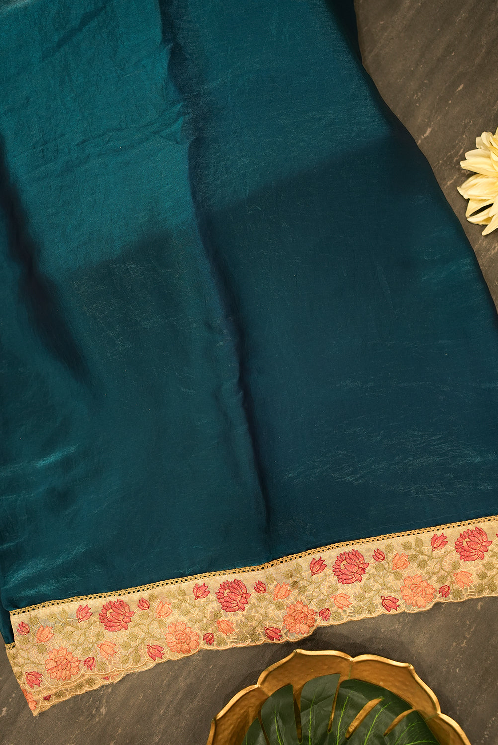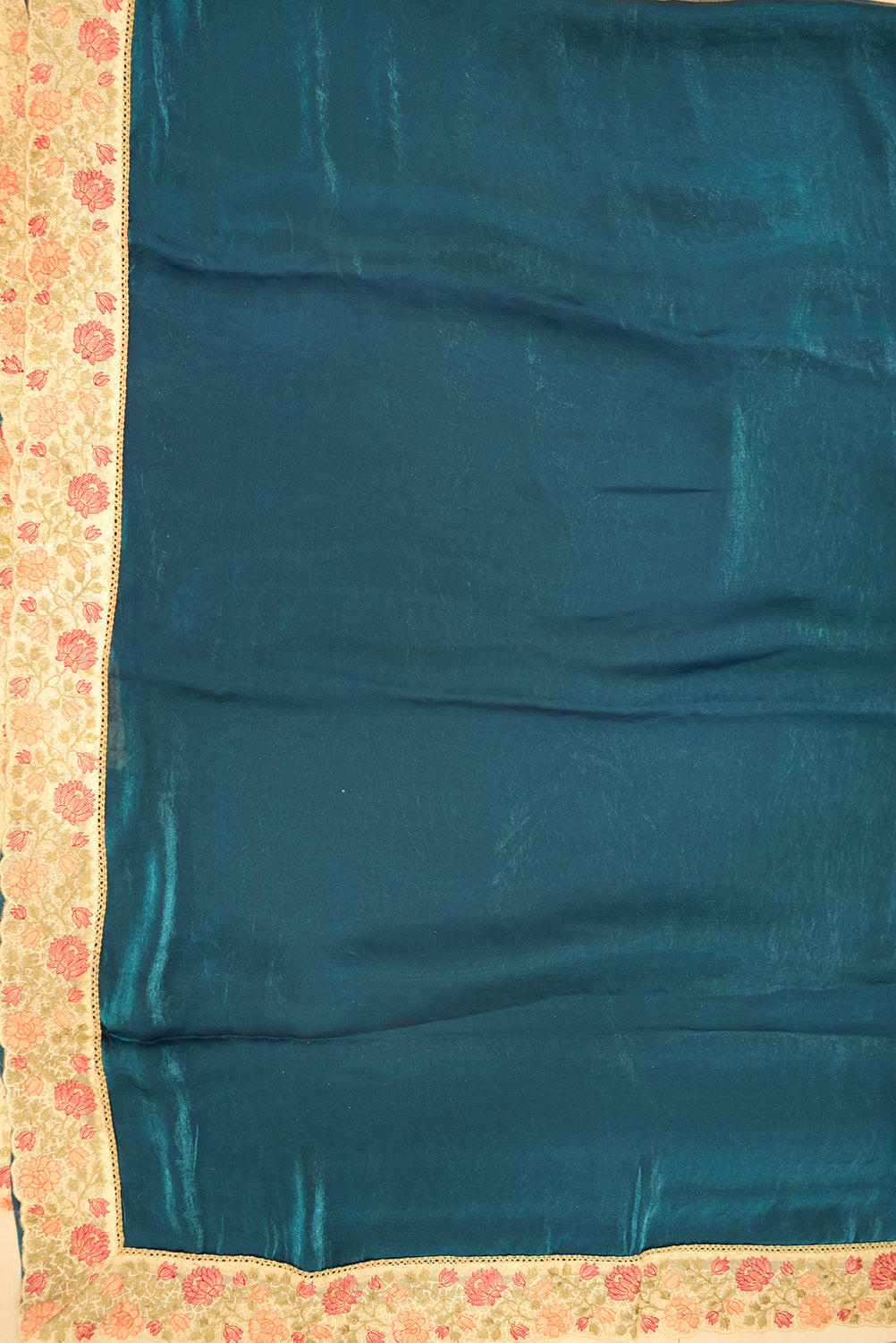 Discover the perfect blend of modern and traditional with this stunning teal crushed Jimmy Choo saree. It features a detailed border with intricate floral embroidery in a soft palette of peach and coral. This piece is a perfect choice for any special occasion. Unstitched blouse attached.