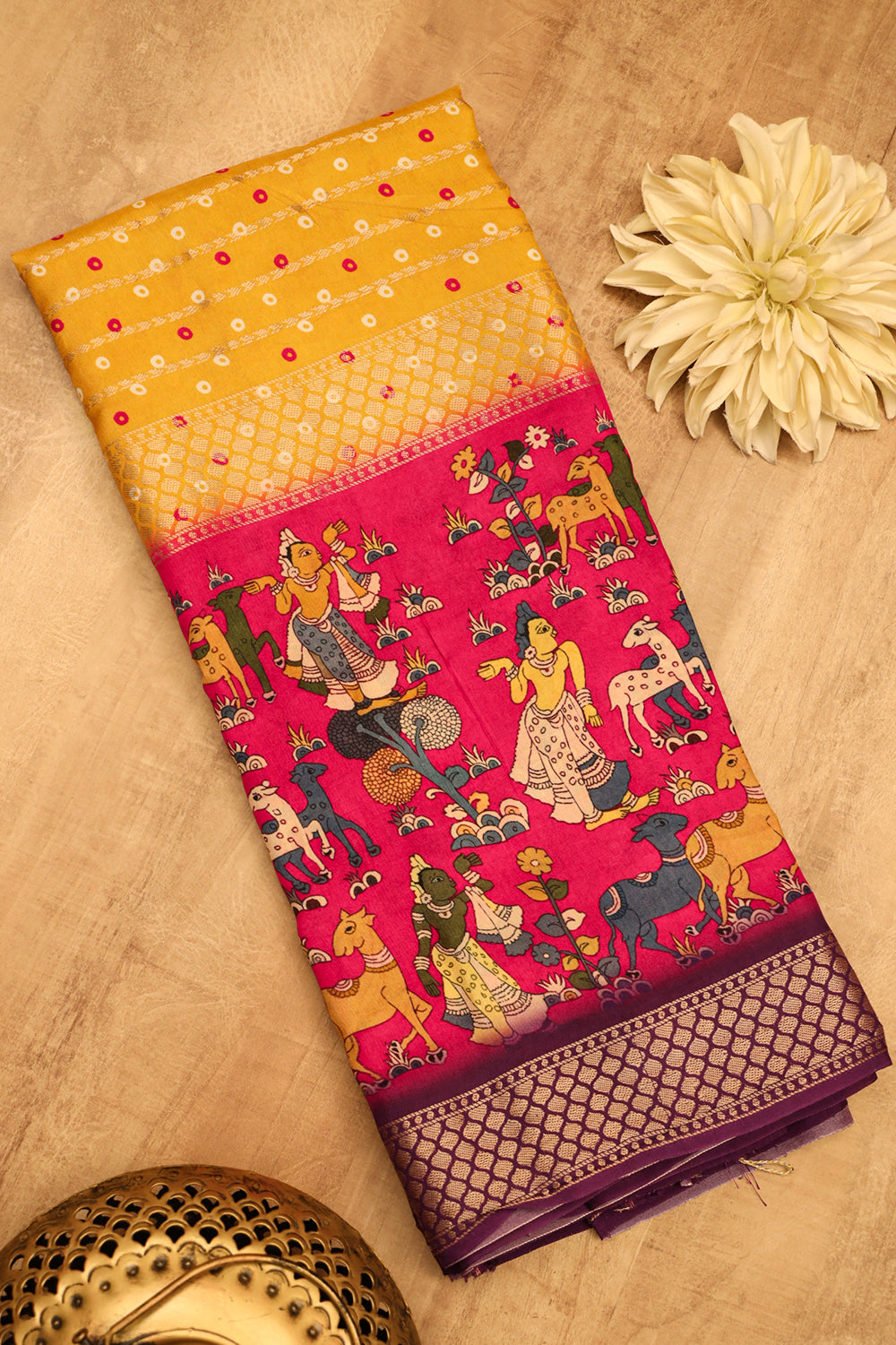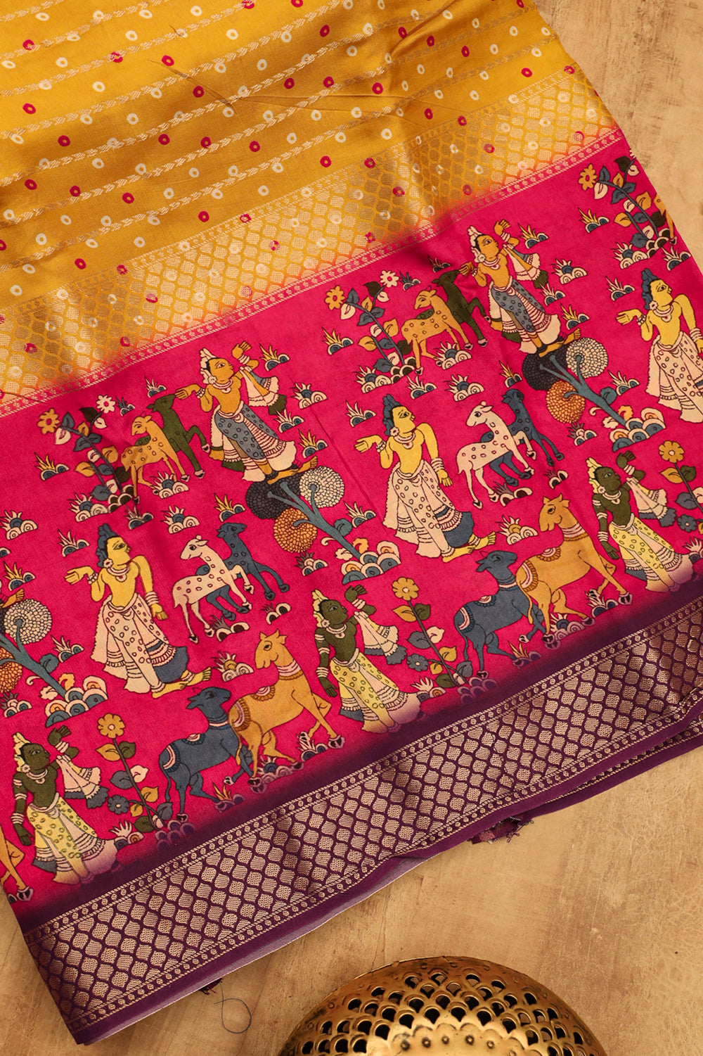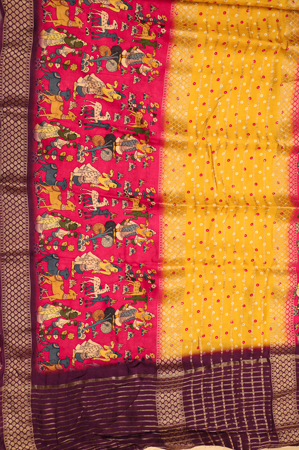 This exquisite Tussar silk saree showcases a captivating yellow hue throughout its body, embellished with vibrant multi-color Kalamkari designs. It's perfectly contrasted by a cheerful Magenta border. Unstitched blouse attached.