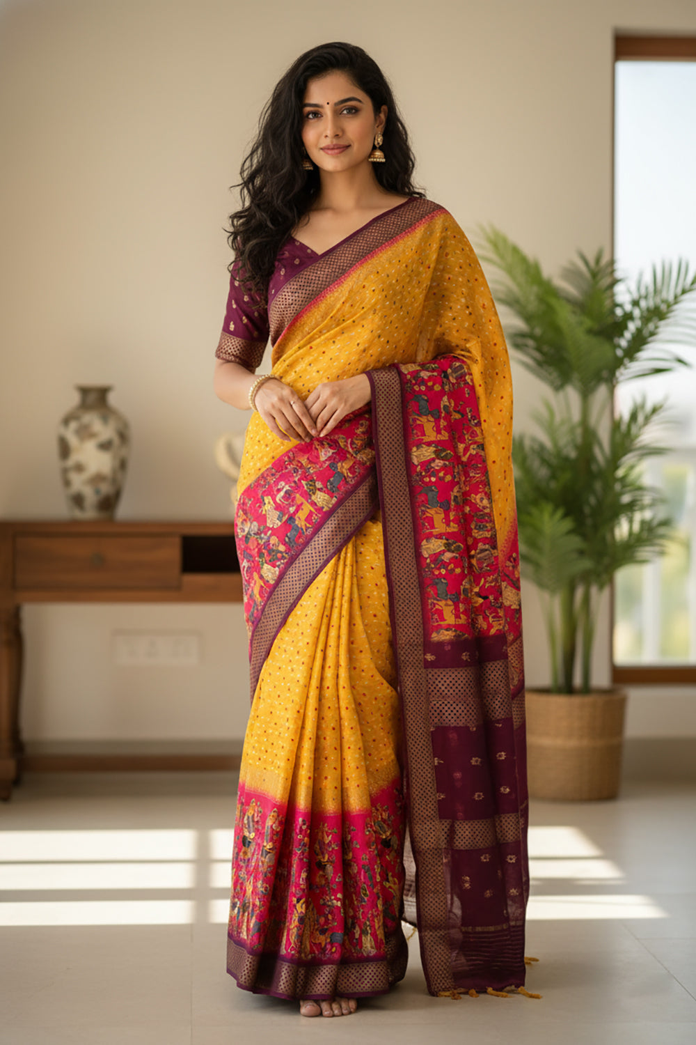 Yellow and Magenta Tussar Saree