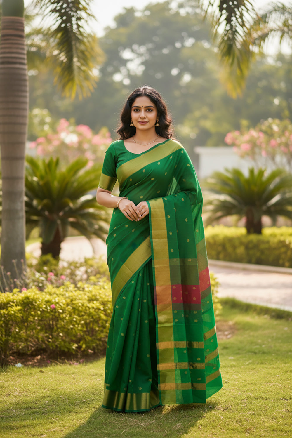 Red and Green Silk Cotton Saree with Gold Zari