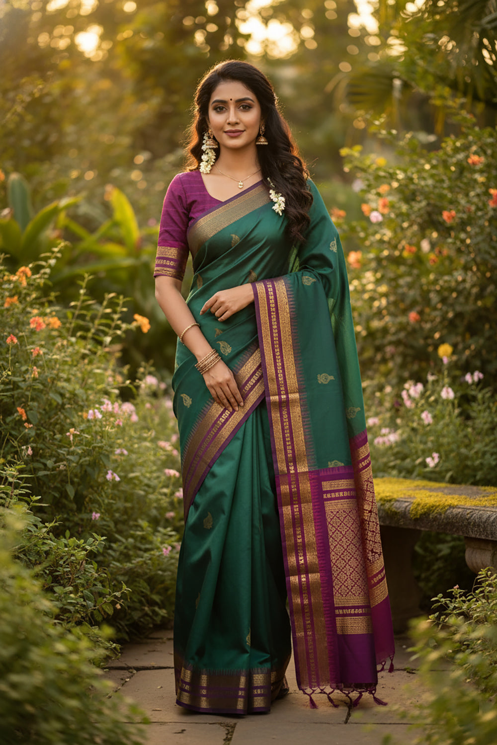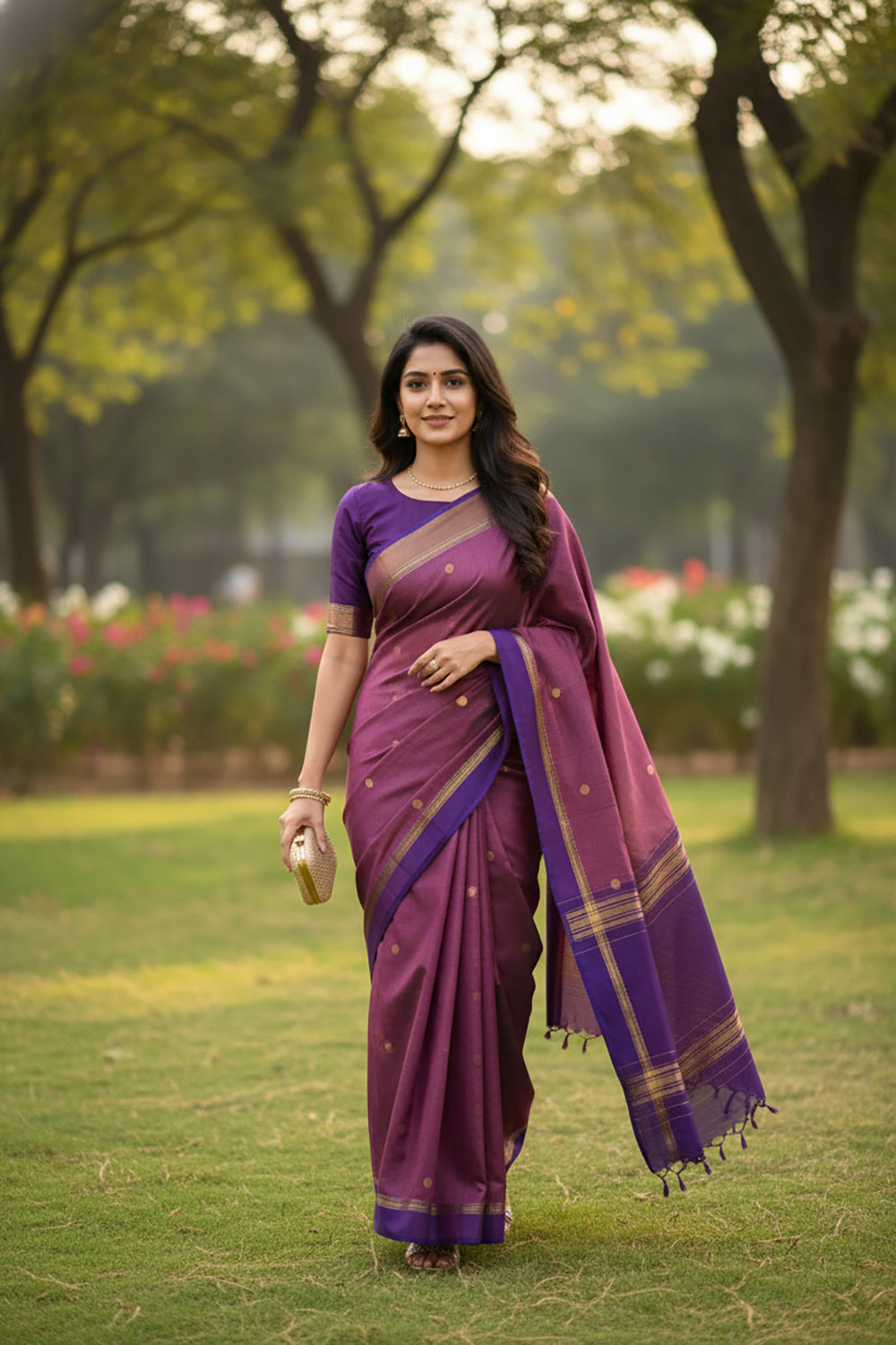 Majestic Violet Silk Saree with Intricate Gold Zari Border