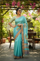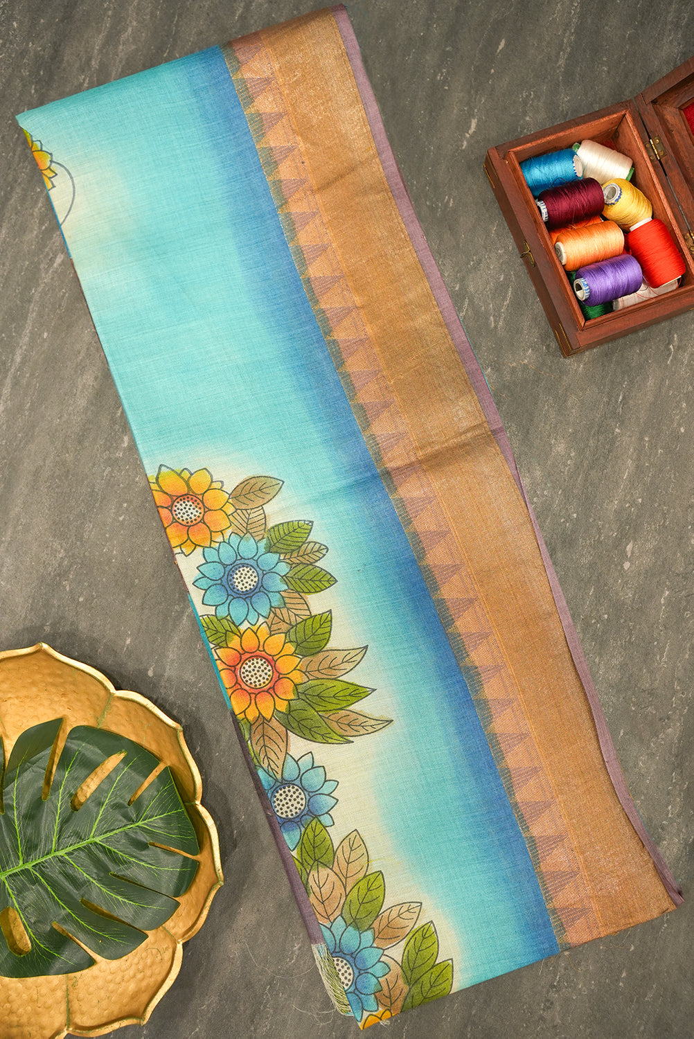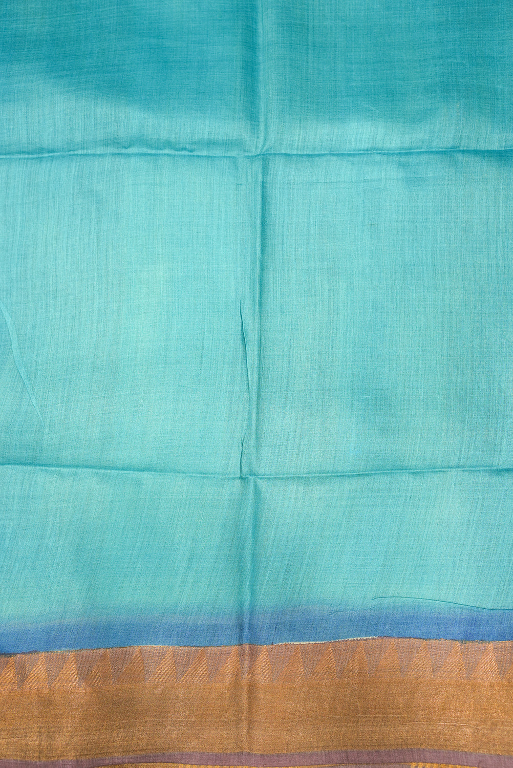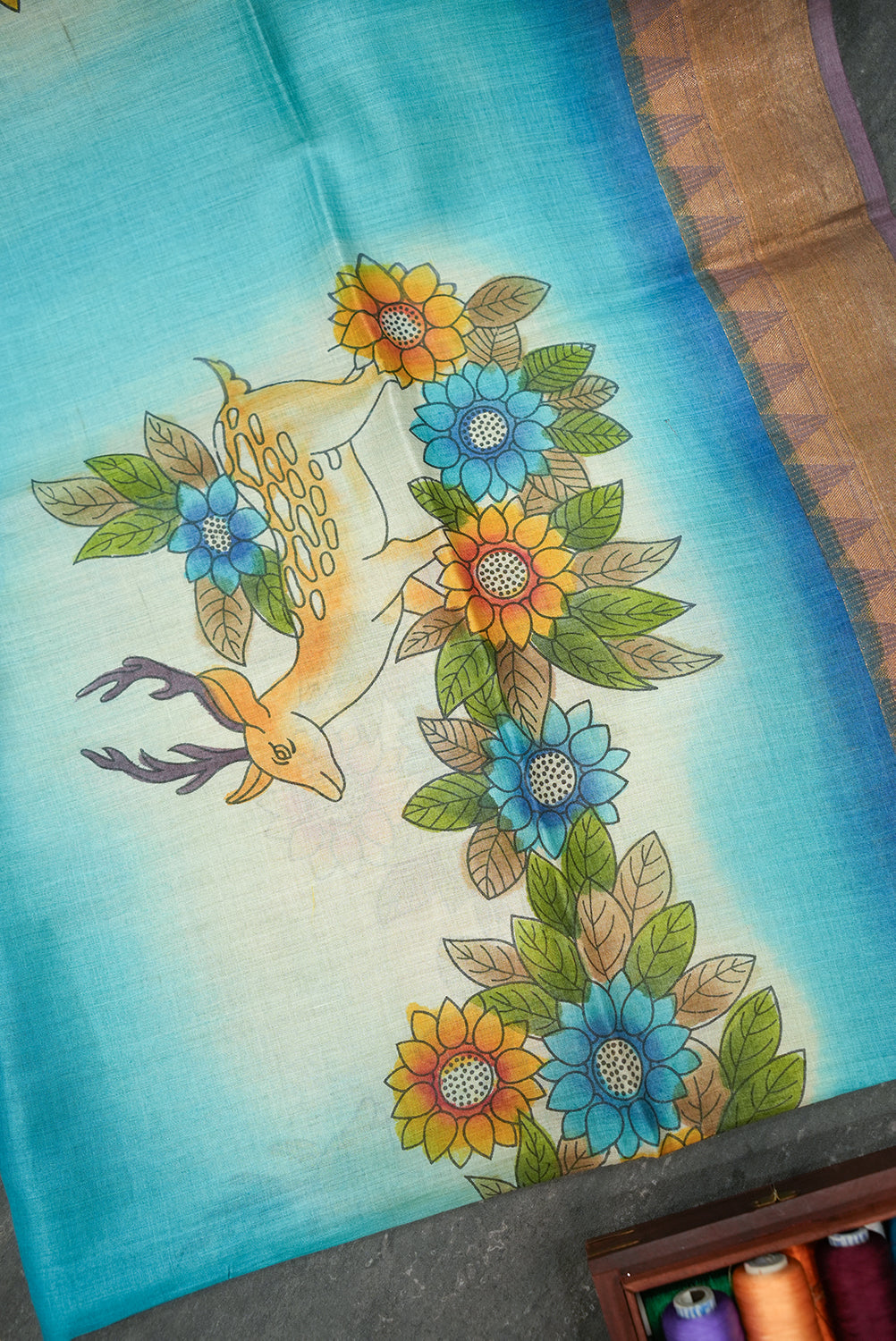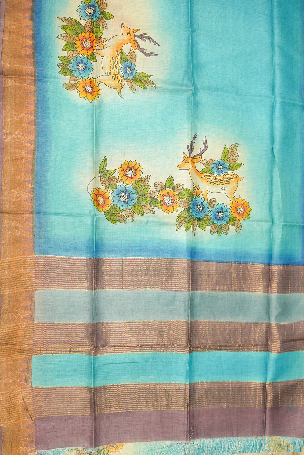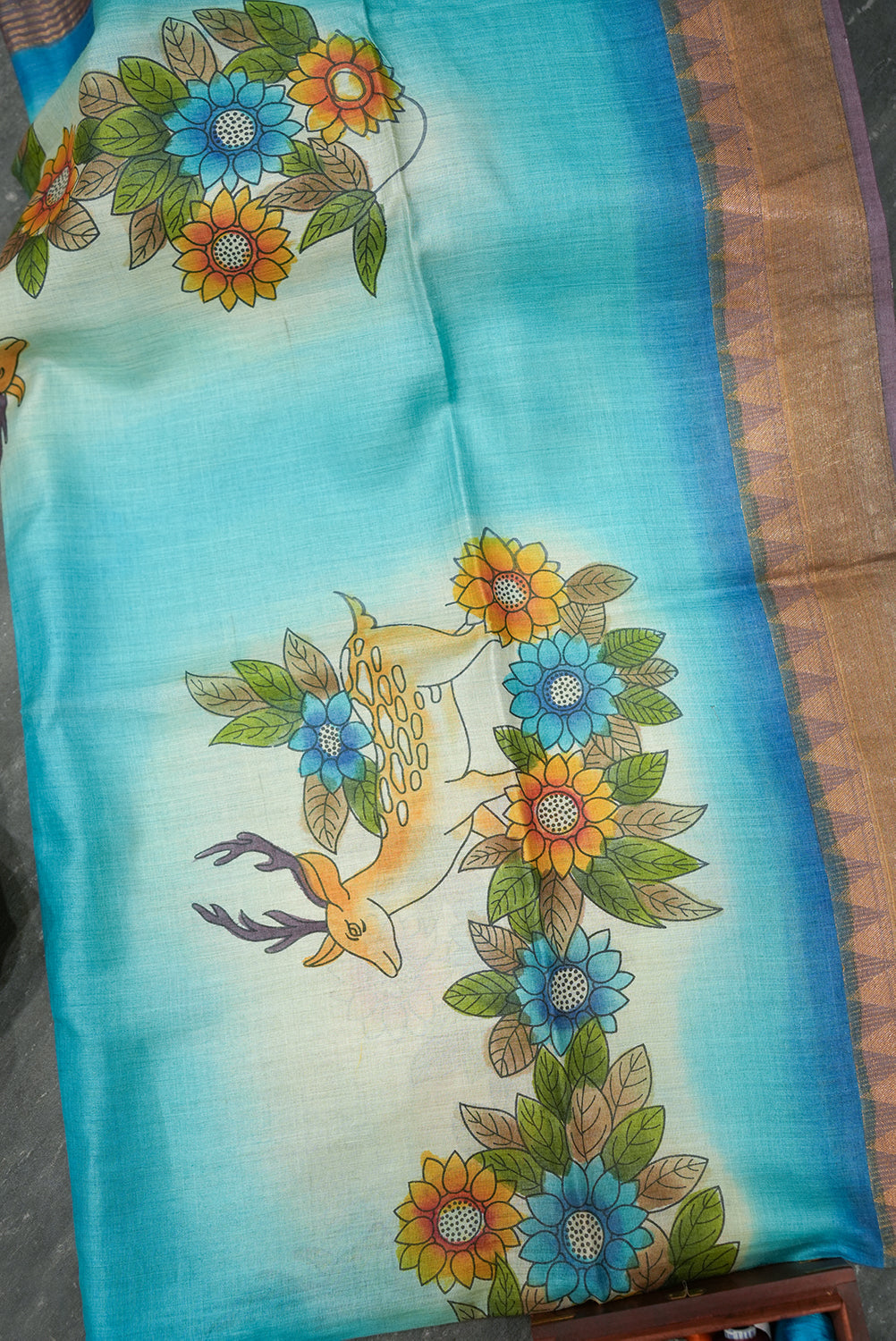 This stunning Tussar silk saree features a vibrant aqua blue base with beautiful, hand-painted artwork. The body of the saree is adorned with charming deer and floral motifs, adding a touch of nature-inspired elegance. The rustic charm of the tussar fabric is complemented by a classic border in shades of brown, copper, and blue, making it a perfect blend of traditional and contemporary design. Unstitched blouse attached.