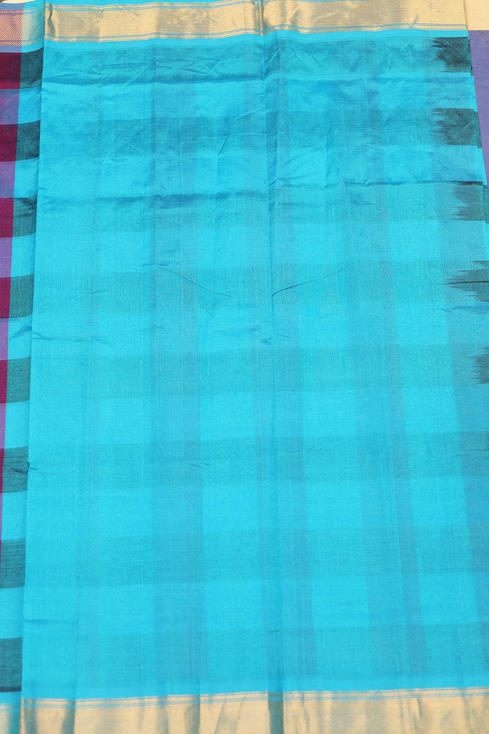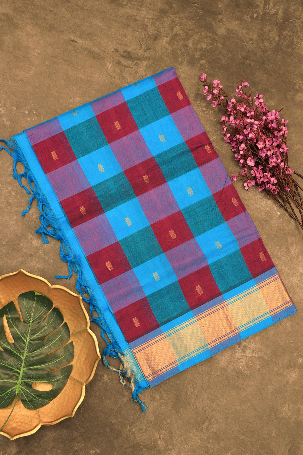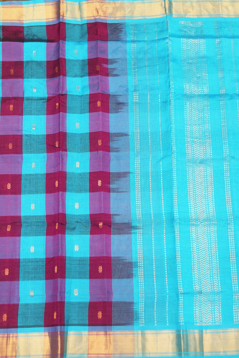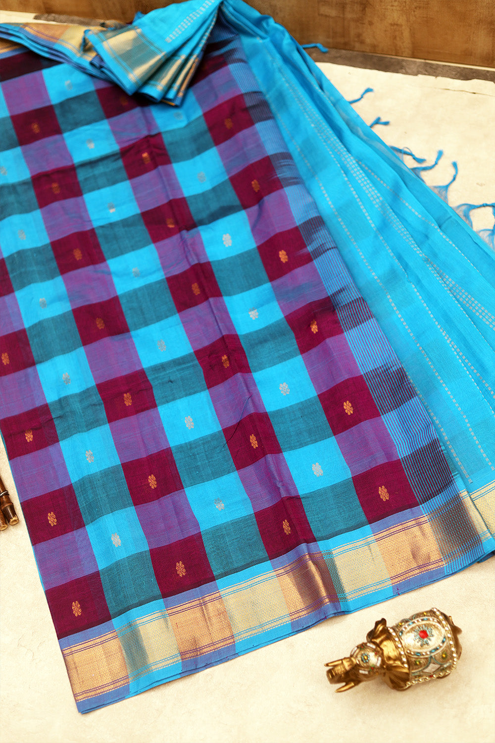 This captivating saree features a mesmerizing checkered pattern in two contrasting shades of blue and maroon. The soft cotton silk fabric drapes beautifully, while the golden zari border adds a touch of opulence. This saree is a perfect blend of tradition and contemporary style, making it a versatile choice for any occasion.