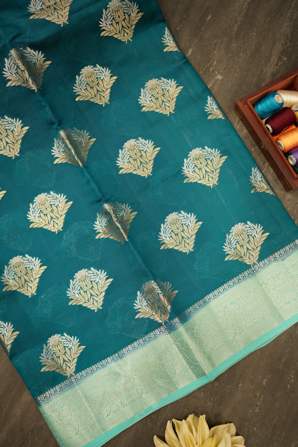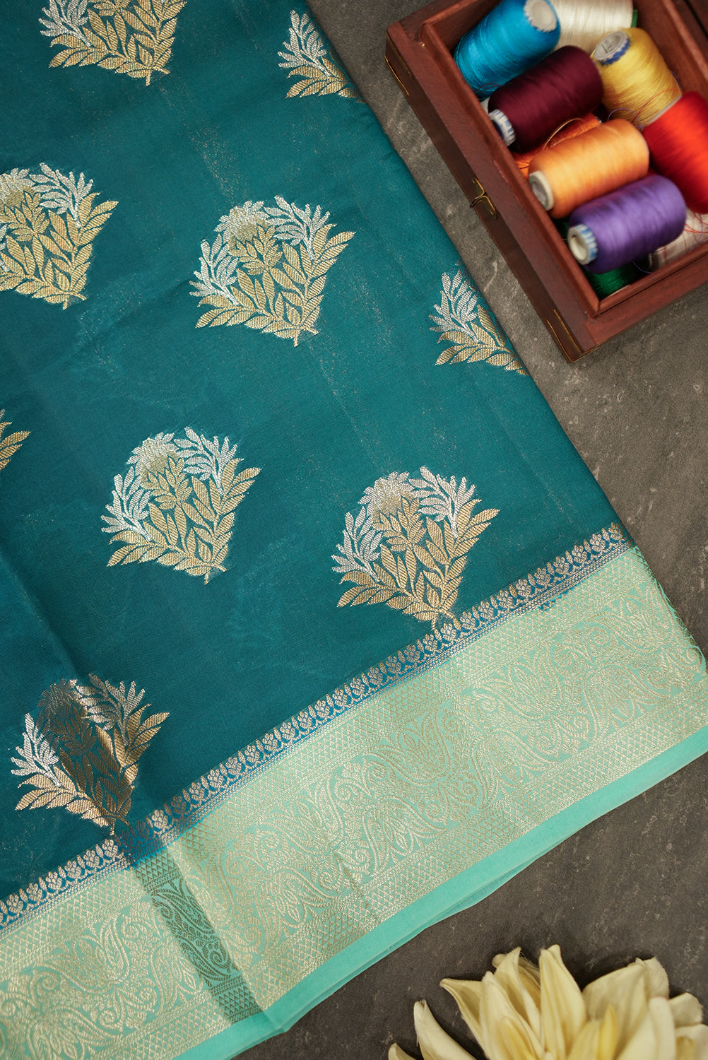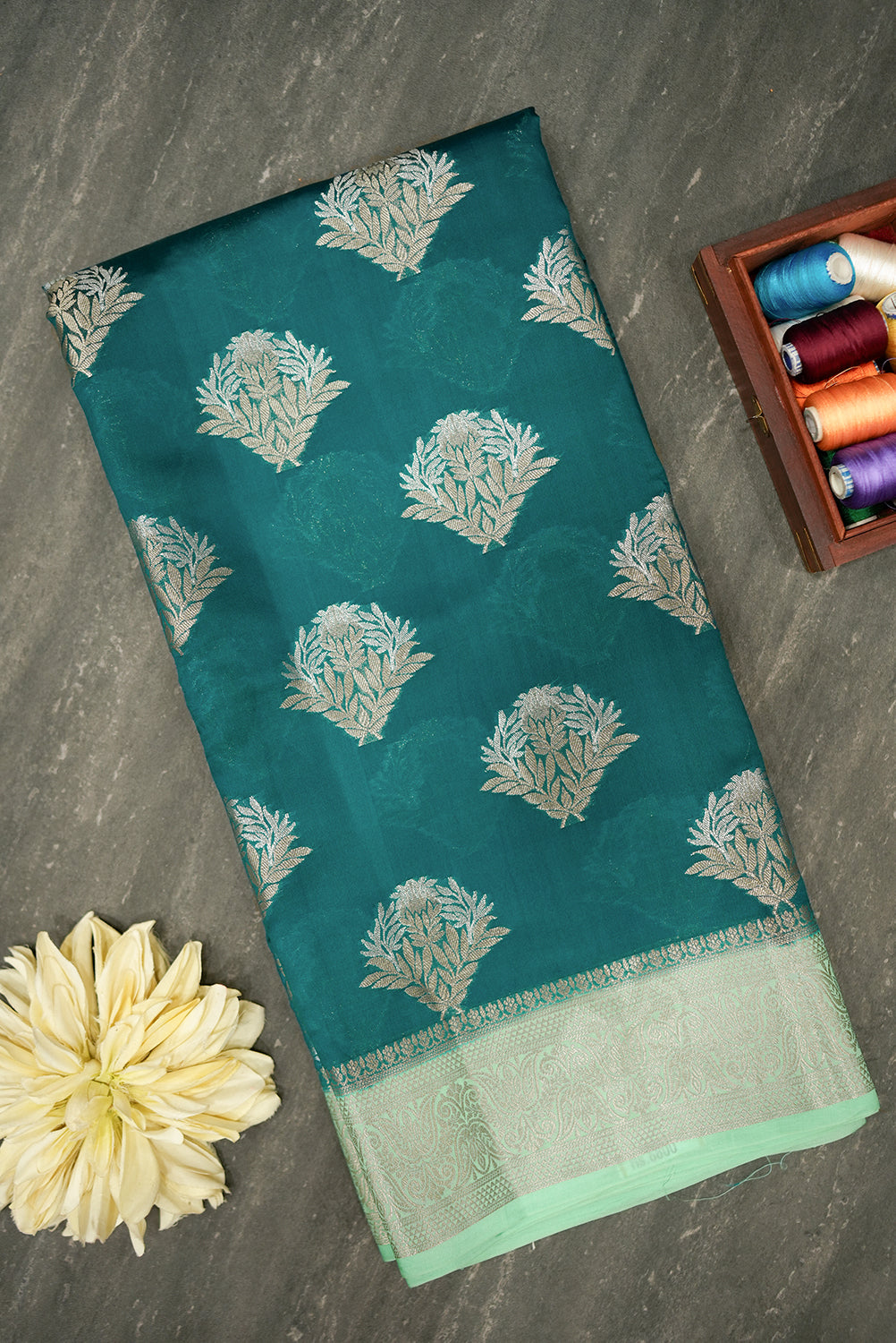 This elegant raw silk saree features a stunning emerald green body. The saree is adorned with intricate silver zari floral motifs woven all over. A beautiful mint green border with detailed designs complements the body, adding a touch of sophistication to this graceful drape.