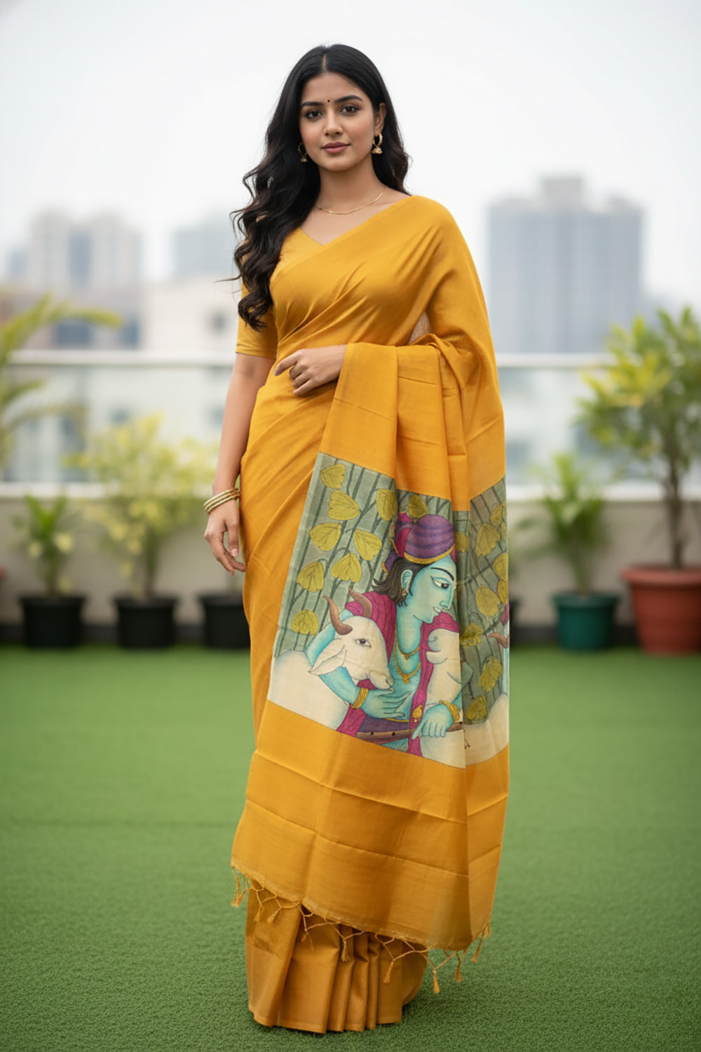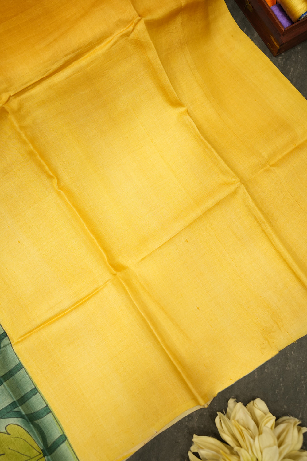 This elegant tussar saree features a rich, solid golden yellow body that drapes beautifully. The saree is enhanced by a striking pallu with an abstract leaf print in shades of teal green and pastel blue. This lightweight saree is a perfect blend of modern and traditional styles, making it an excellent choice for special occasions.