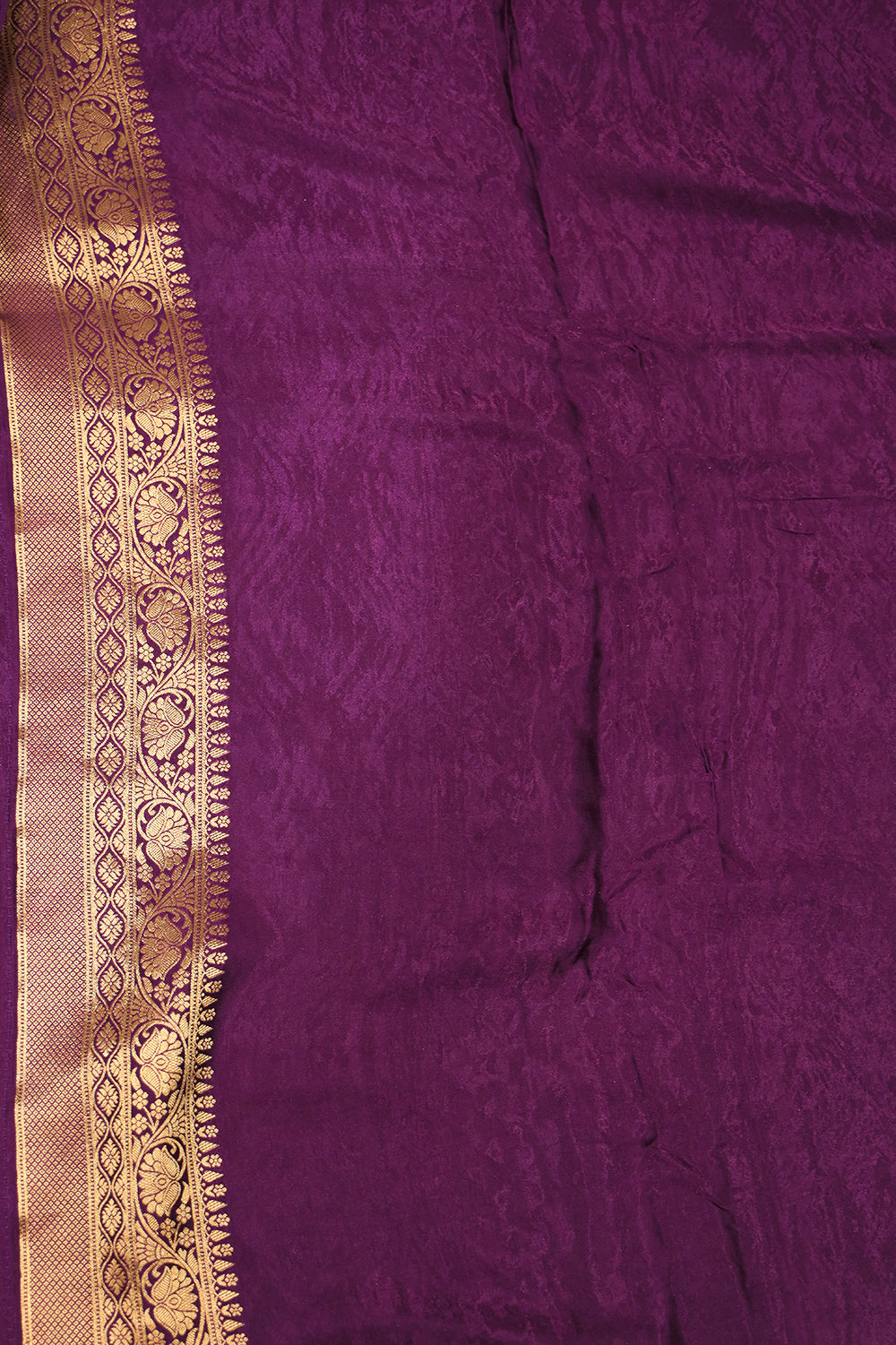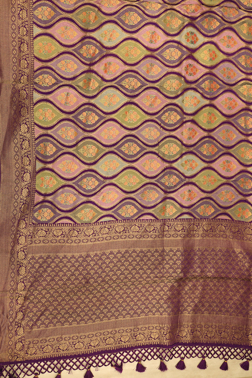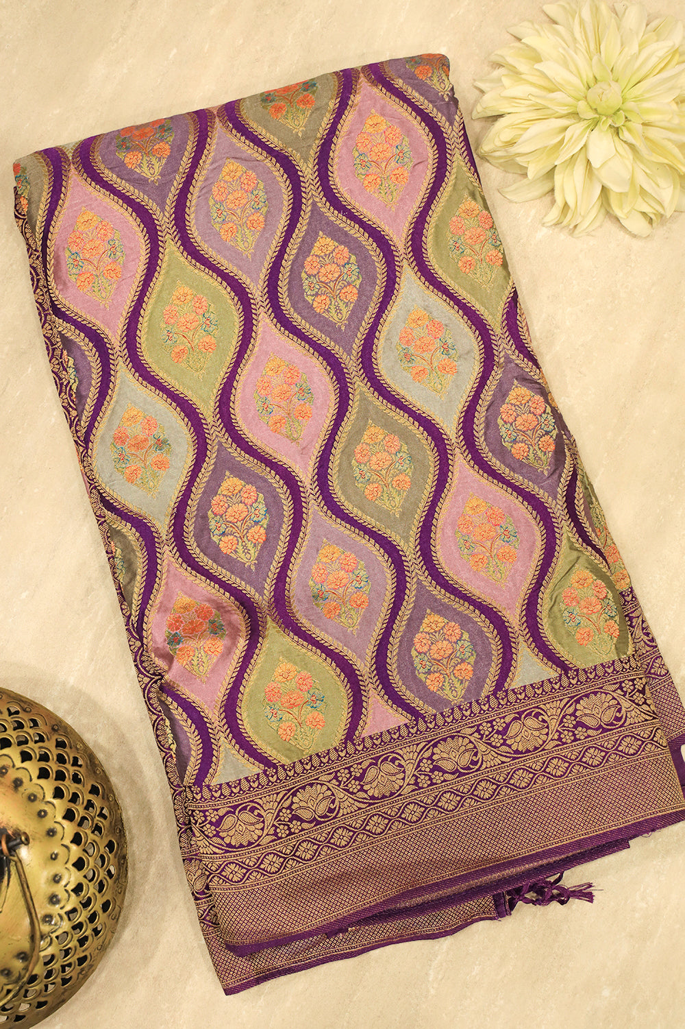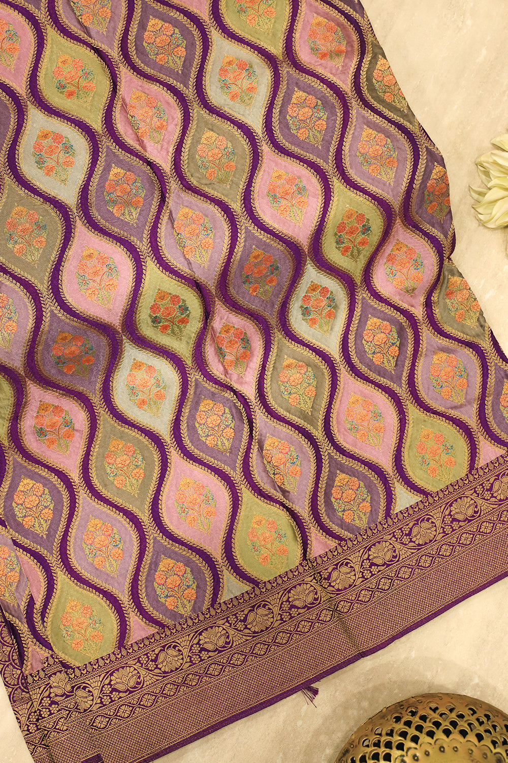 A stunning Banarasi silk saree featuring a beautiful wavy pattern. It showcases a lovely palette of soft lilac, sage green, and peach within deep purple outlines. Unstitched blouse attached.