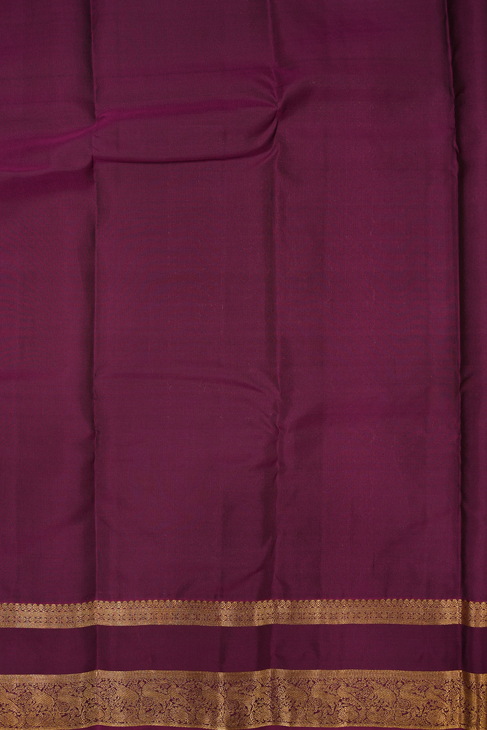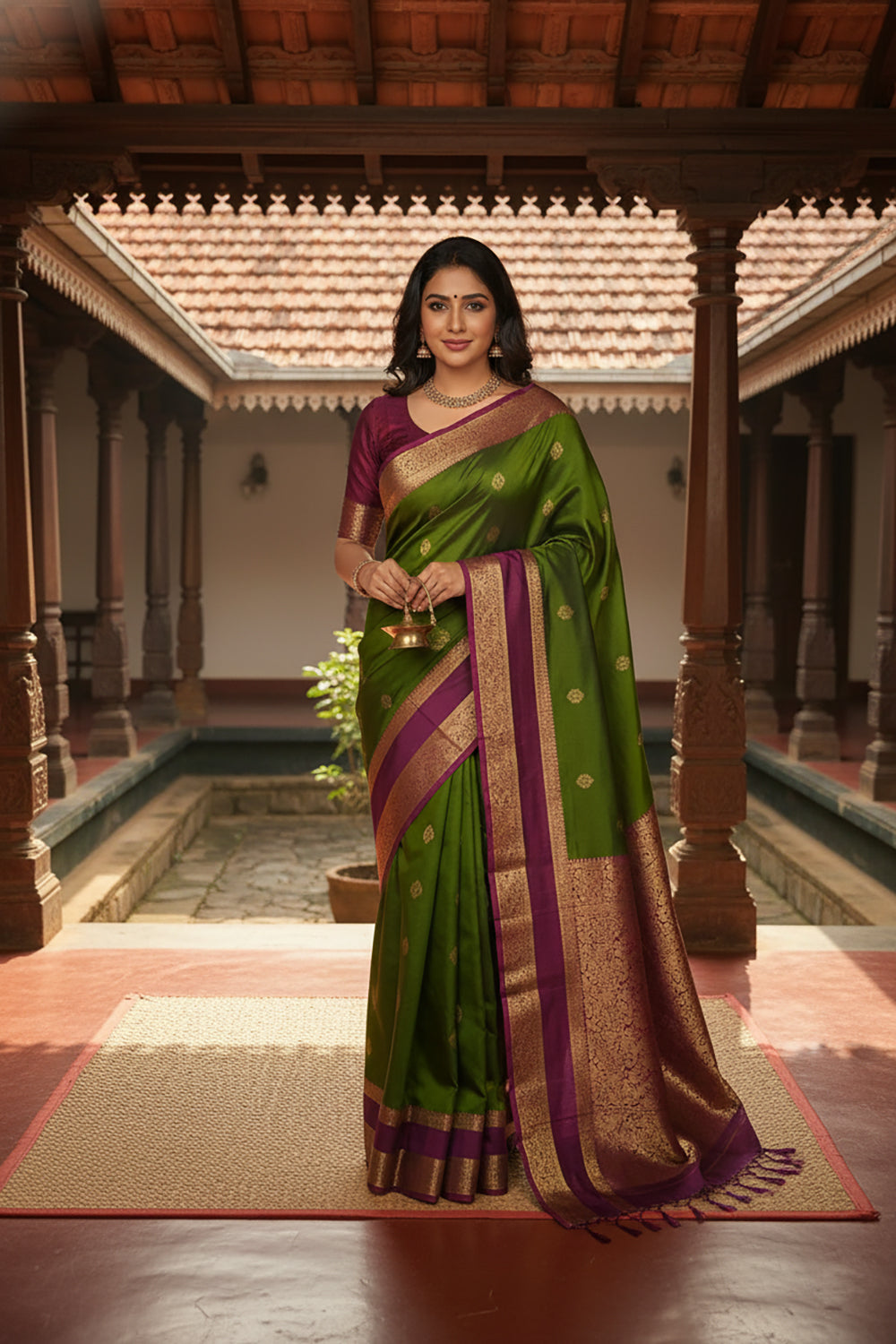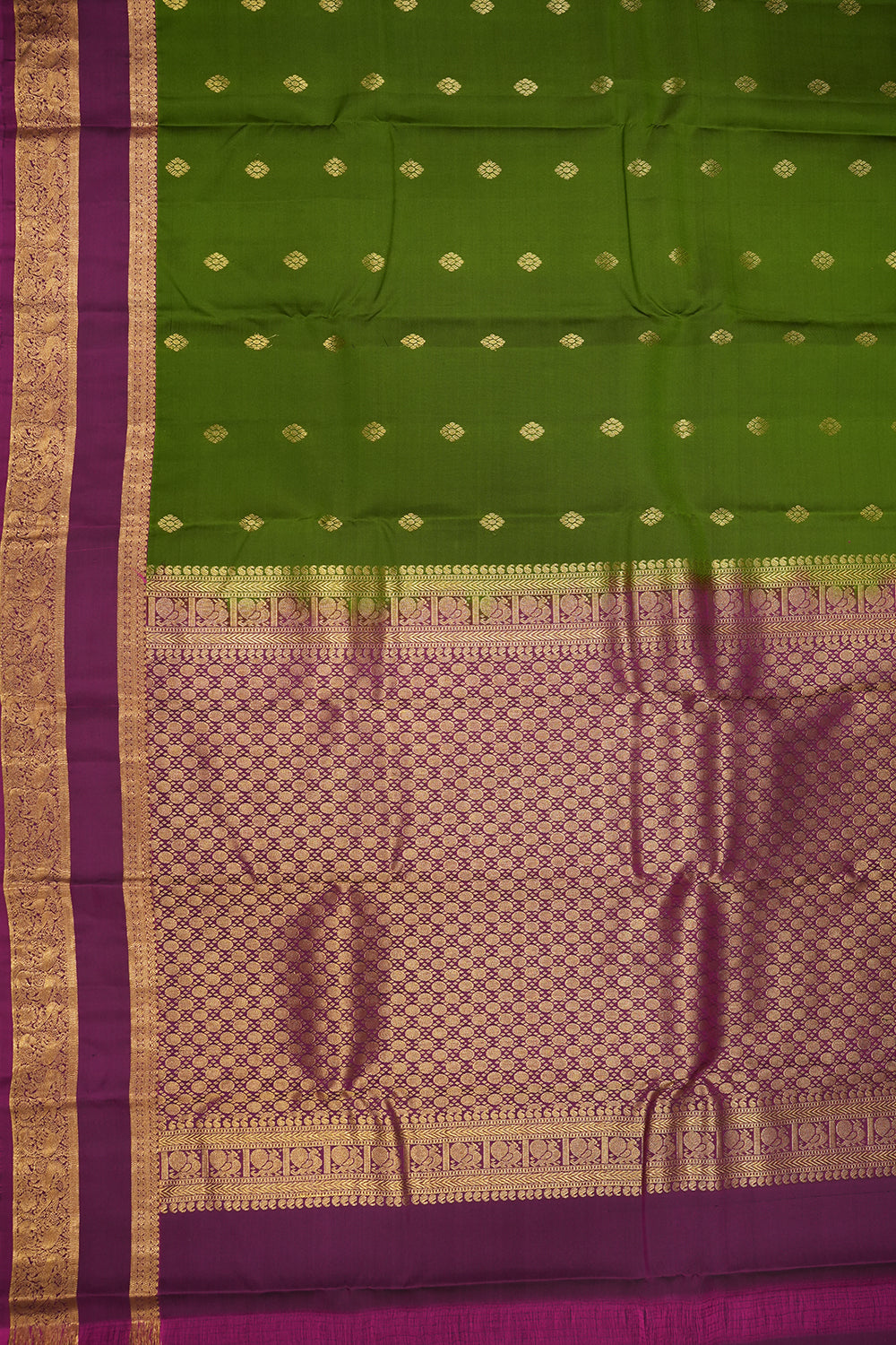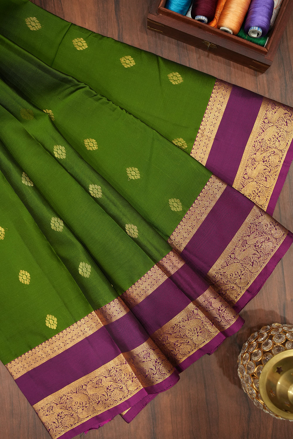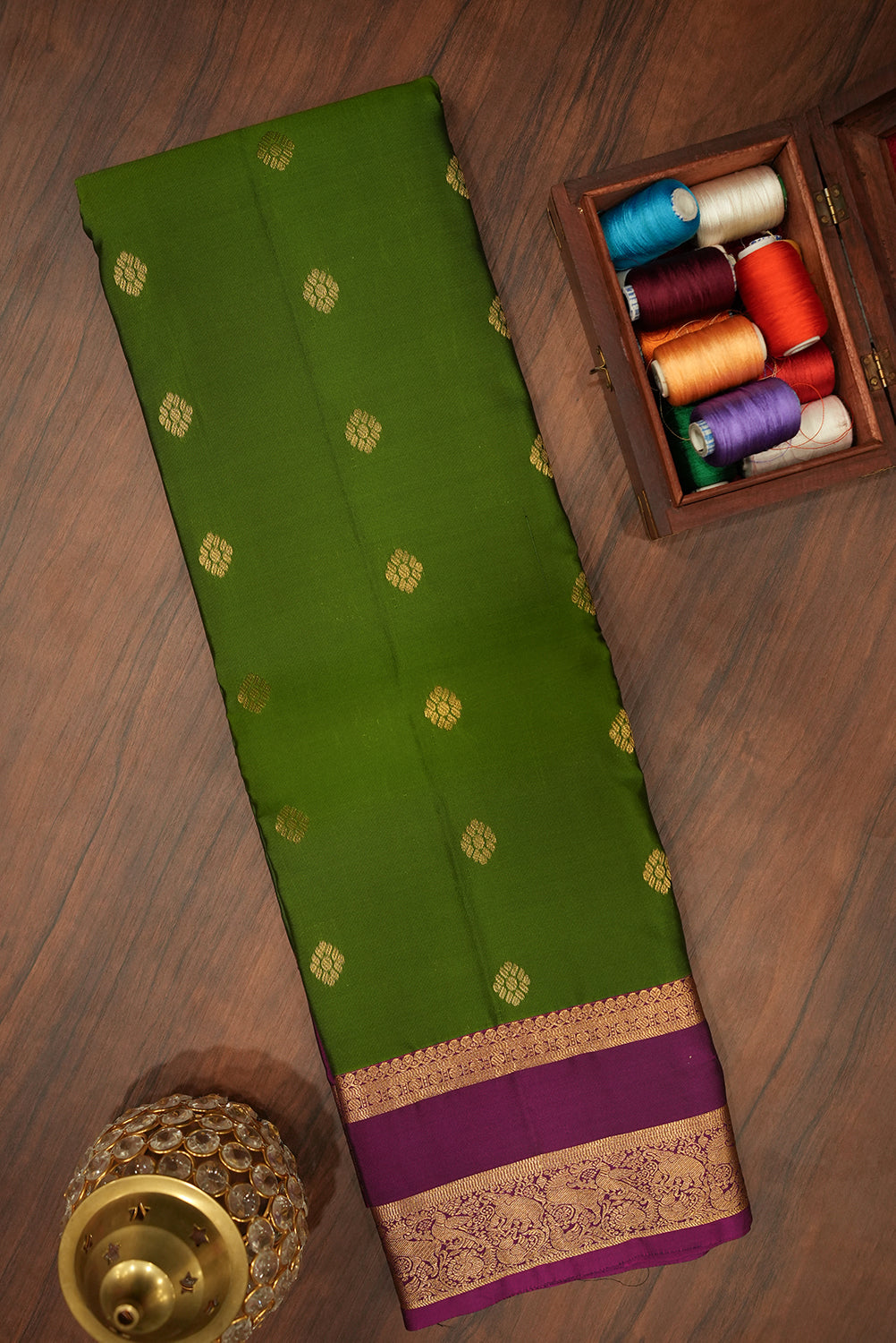Drape yourself in sophistication with this exquisite olive-green silk saree. Adorned with delicate golden buttas, this saree features a rich purple and gold zari border that adds a touch of regal charm. Perfect for festive occasions or formal events. Unstitched blouse attached.