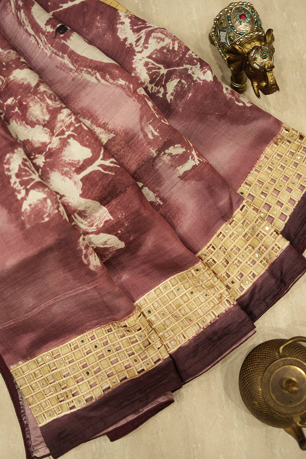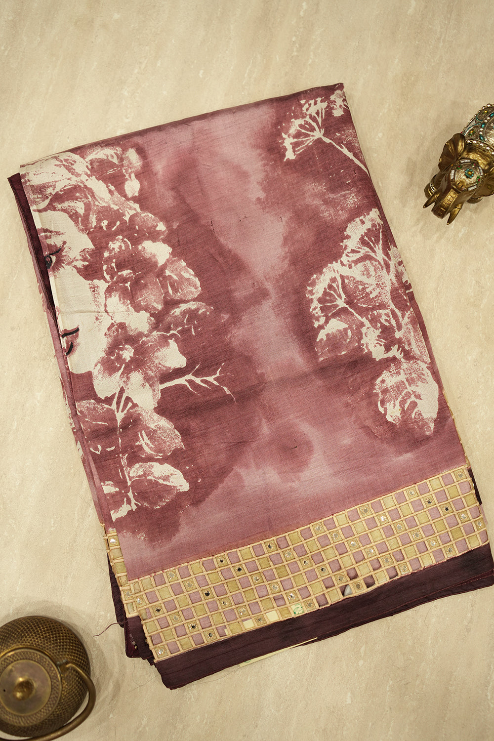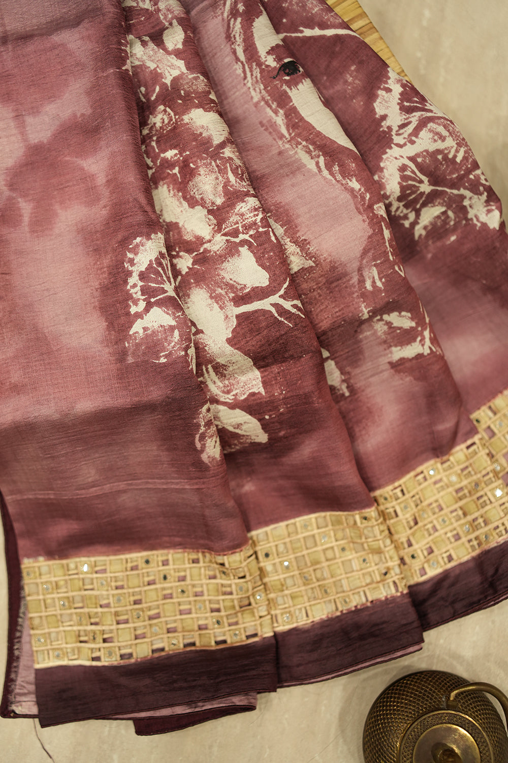 This elegant onion pink tussar saree showcases a beautiful white botanical print, creating a soft, artistic impression. It is framed by a contrasting geometric border, meticulously embellished with shimmering mirror work. Unstitched blouse attached.