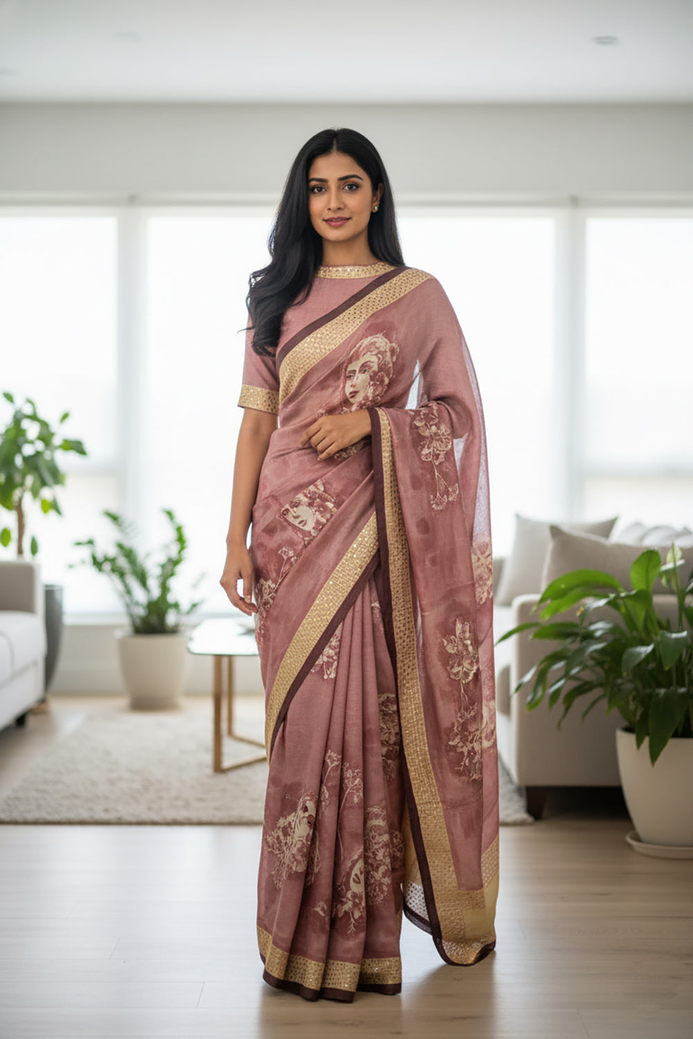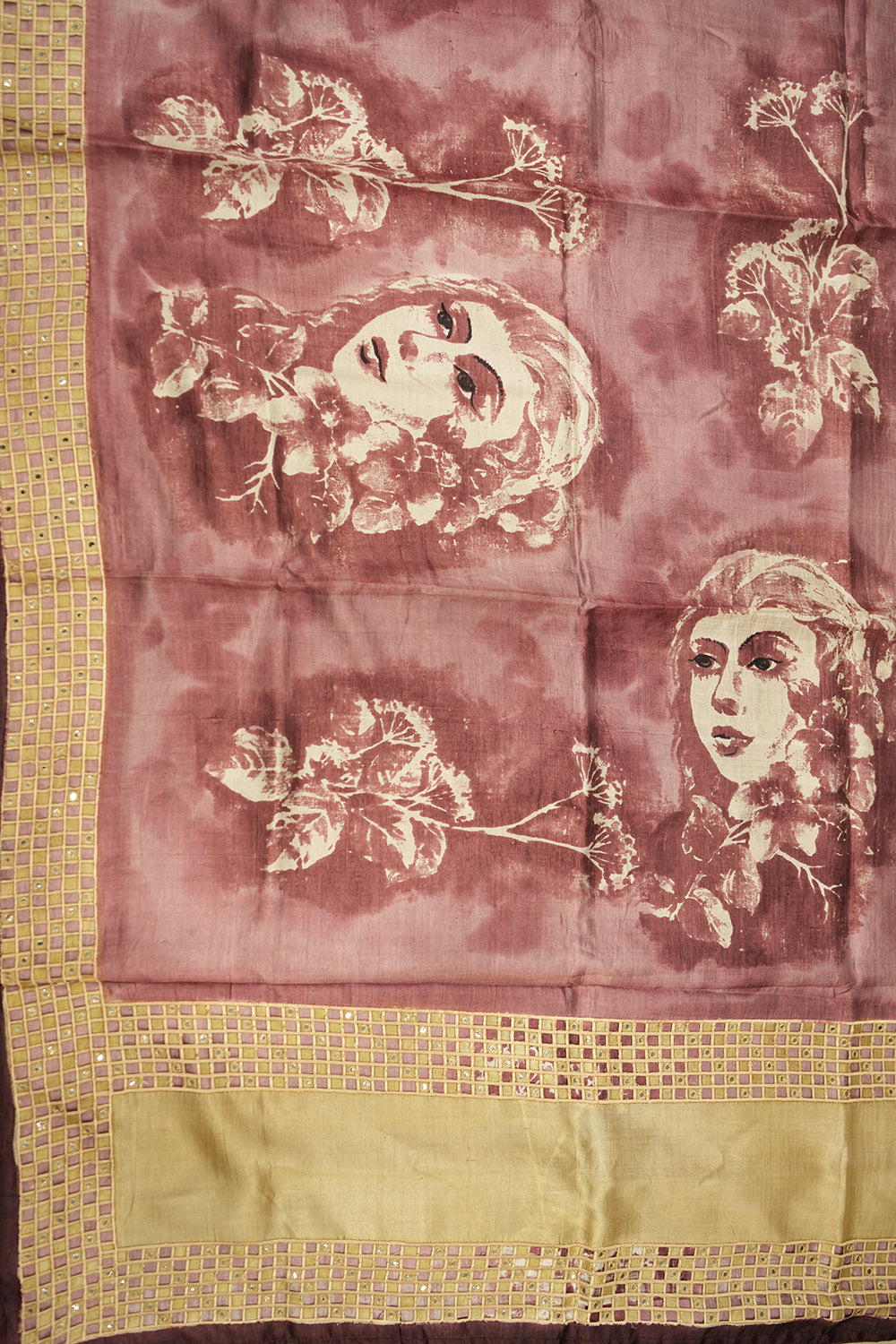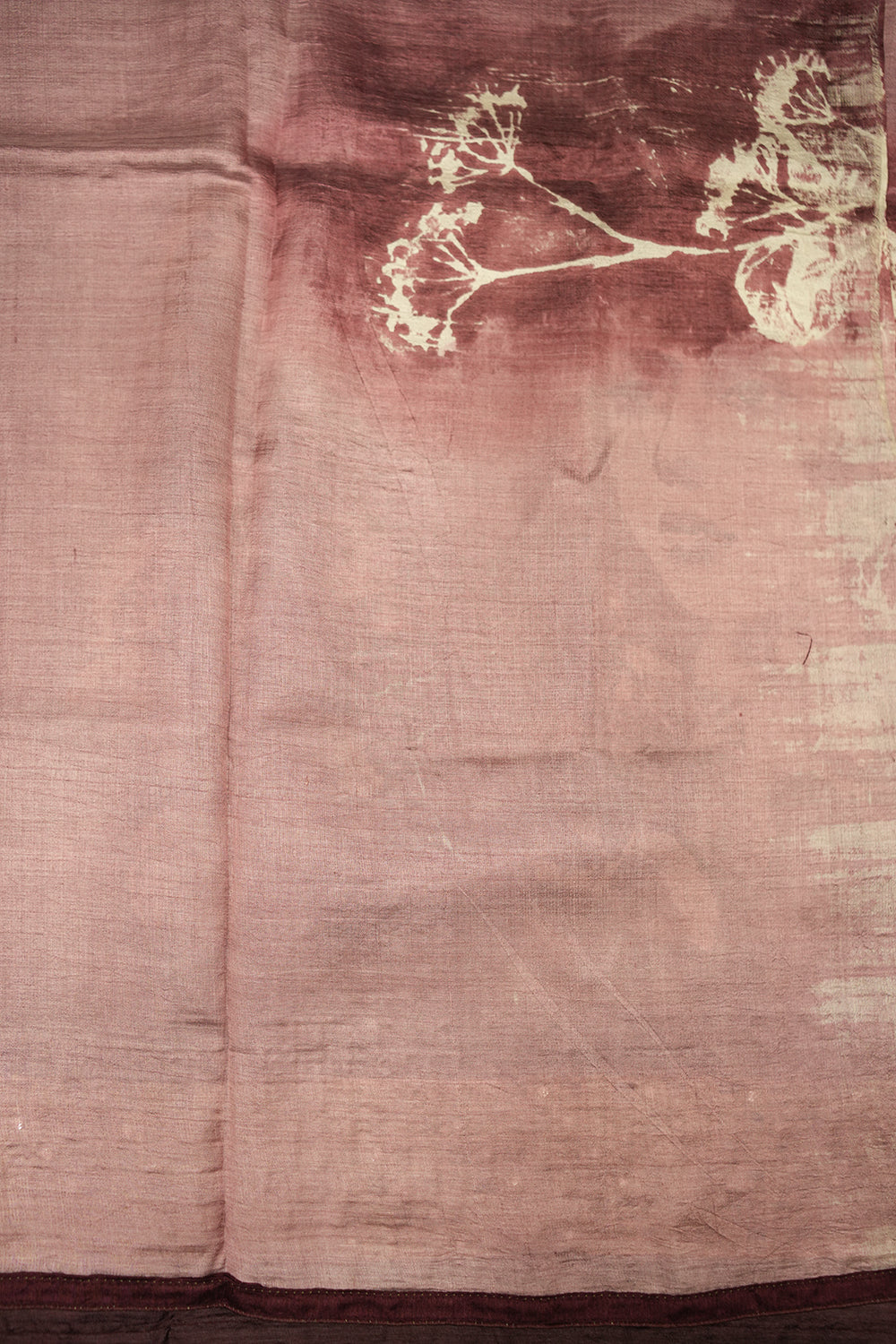 This elegant onion pink tussar saree showcases a beautiful white botanical print, creating a soft, artistic impression. It is framed by a contrasting geometric border, meticulously embellished with shimmering mirror work. Unstitched blouse attached.
