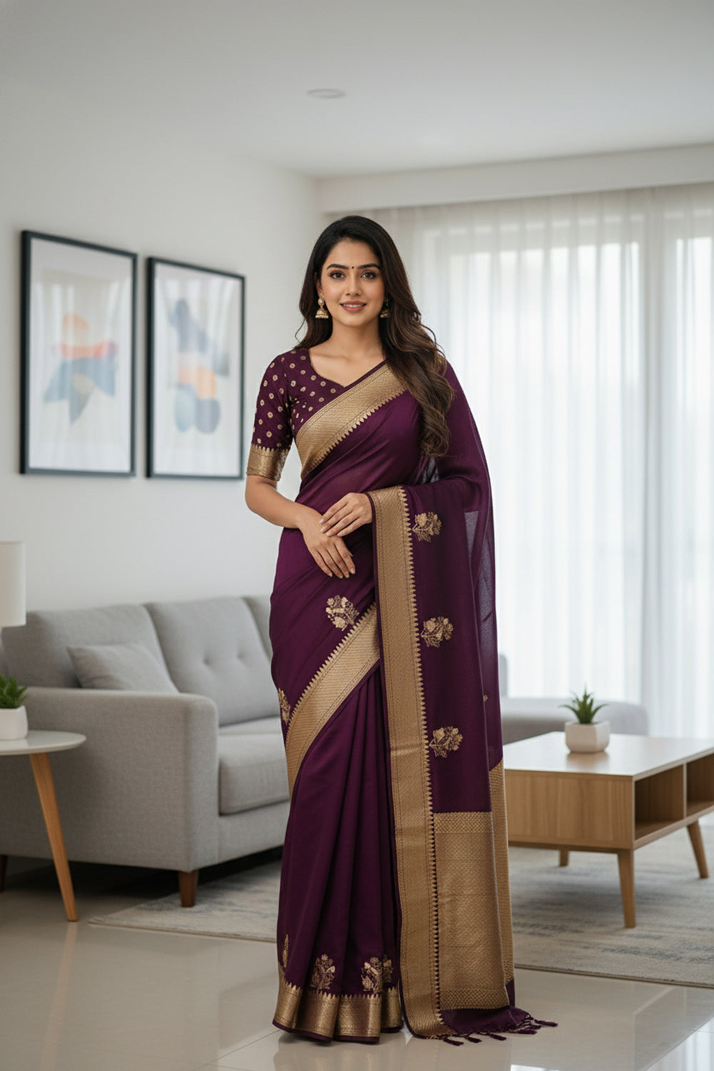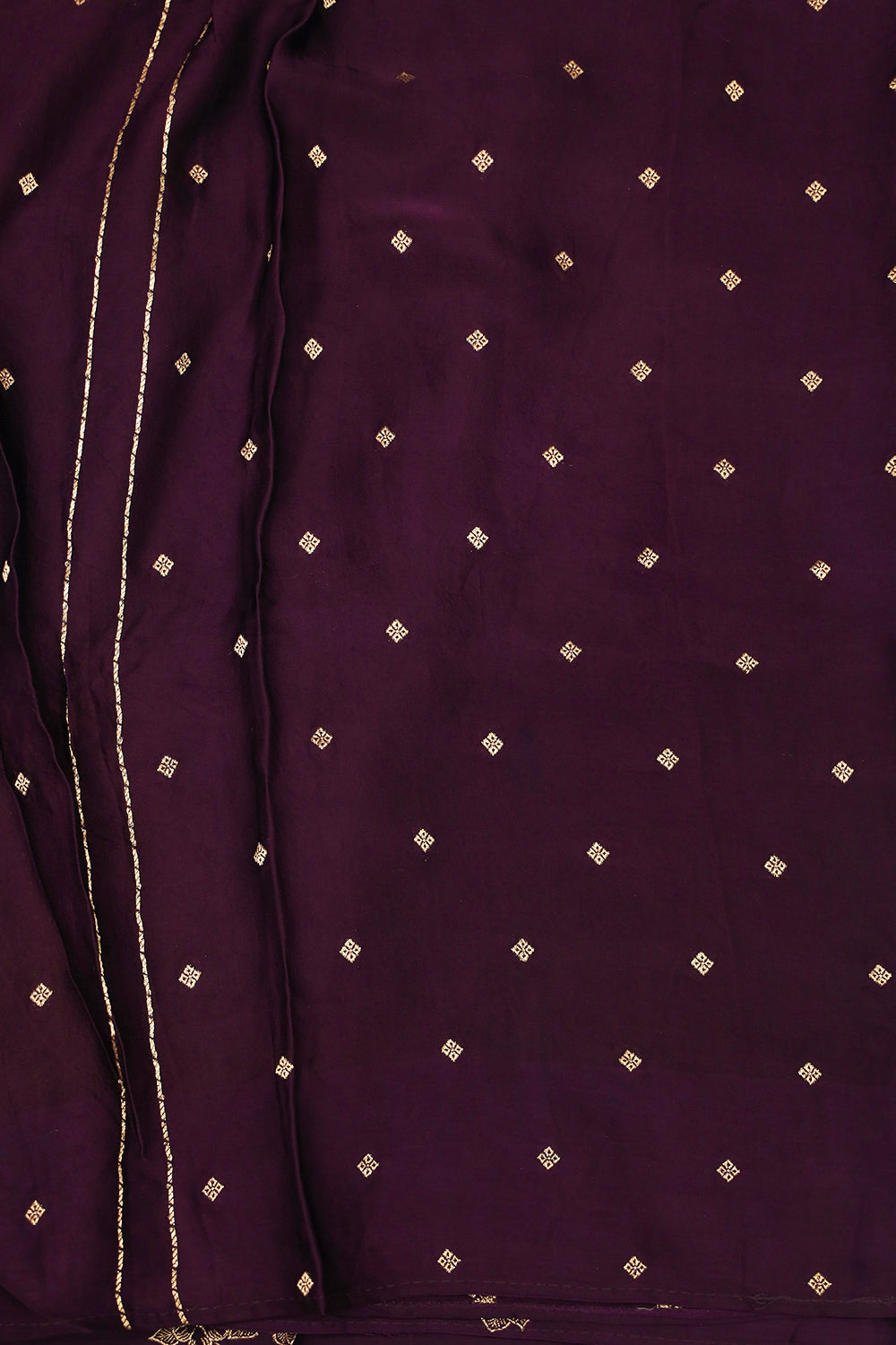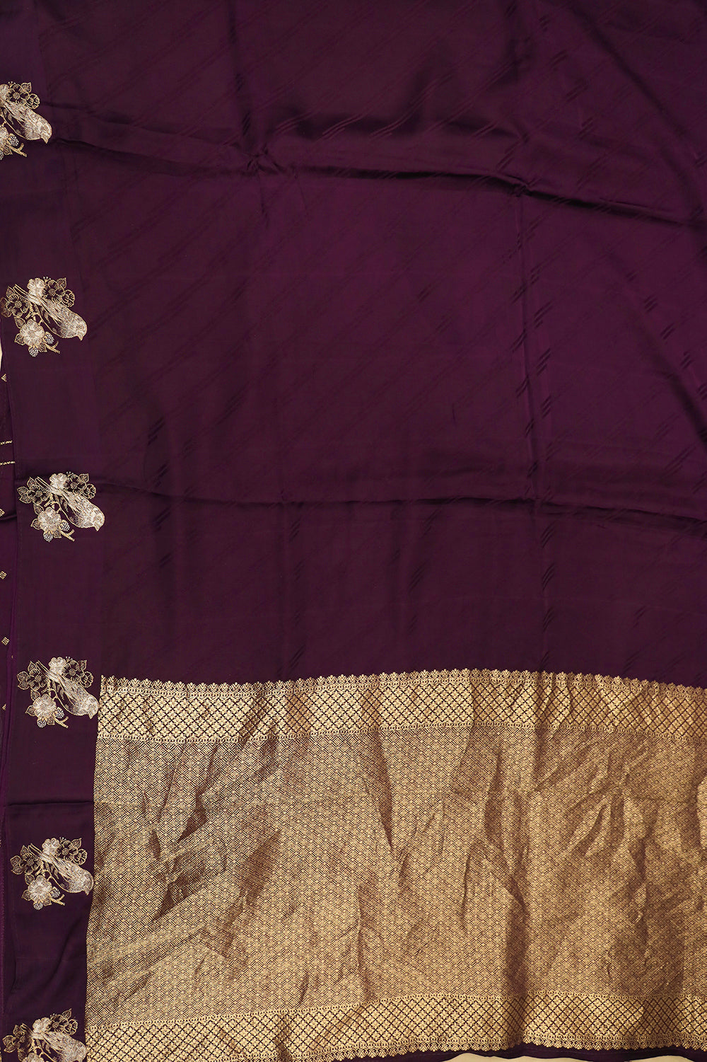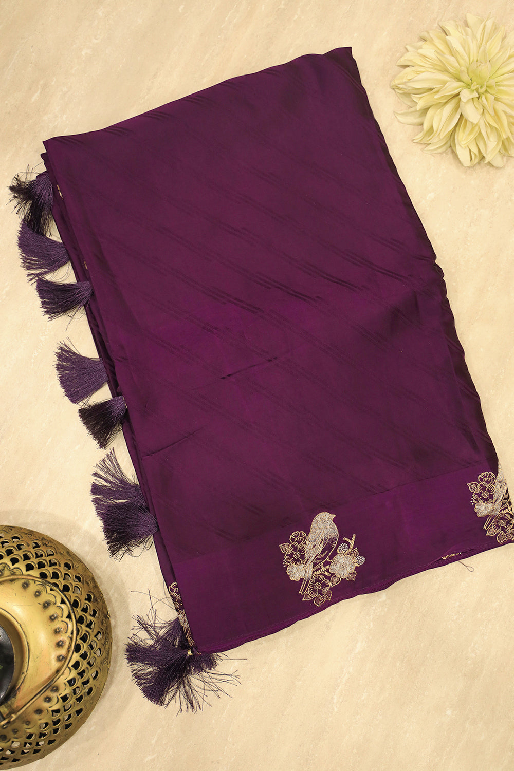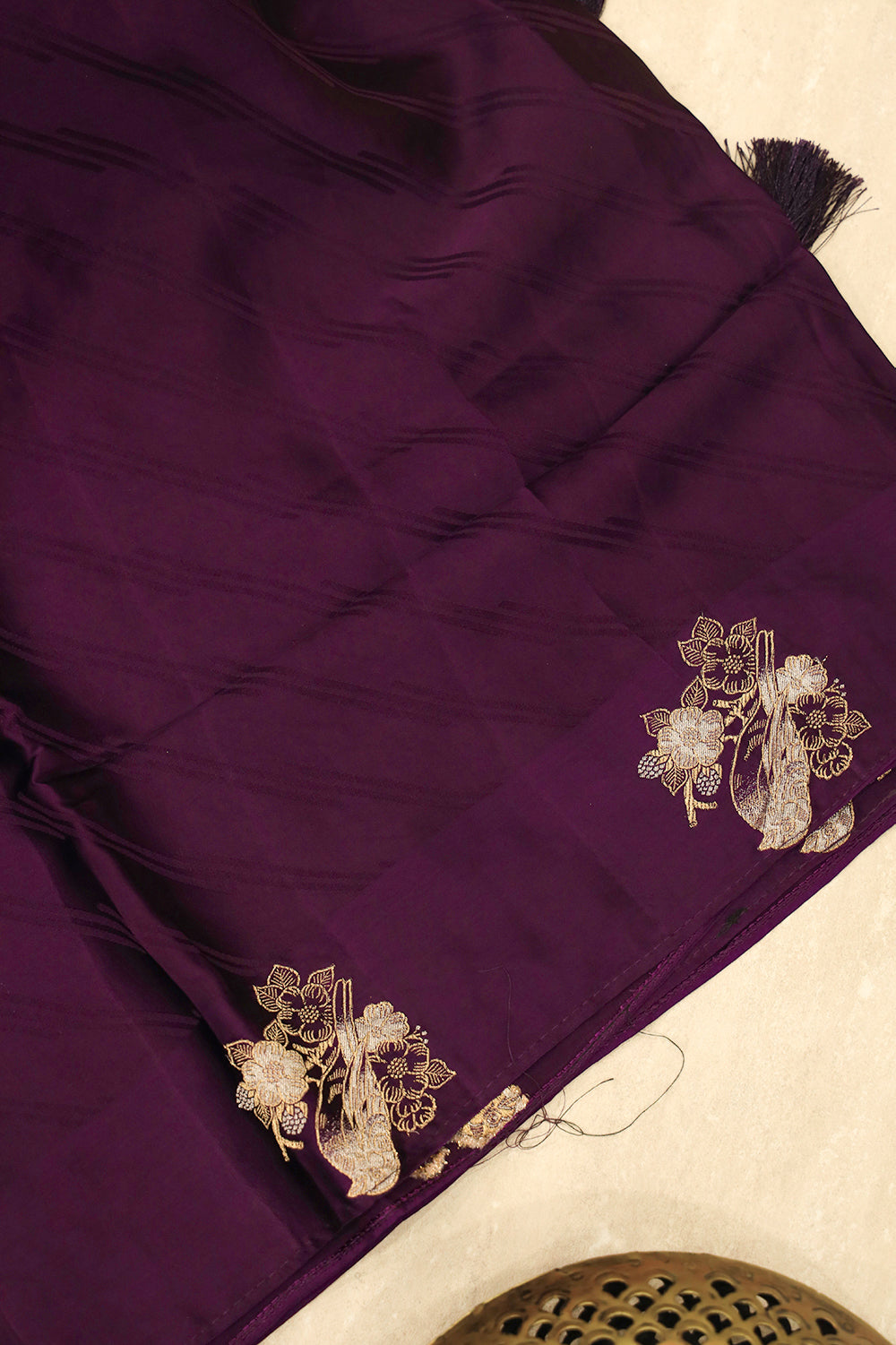 Discover elegance in this deep aubergine purple Banaras saree. It is gracefully adorned with delicate bird and floral embroidery. The pallu is finished with beautiful, matching tassels for a complete look. Unstitched blouse attached.