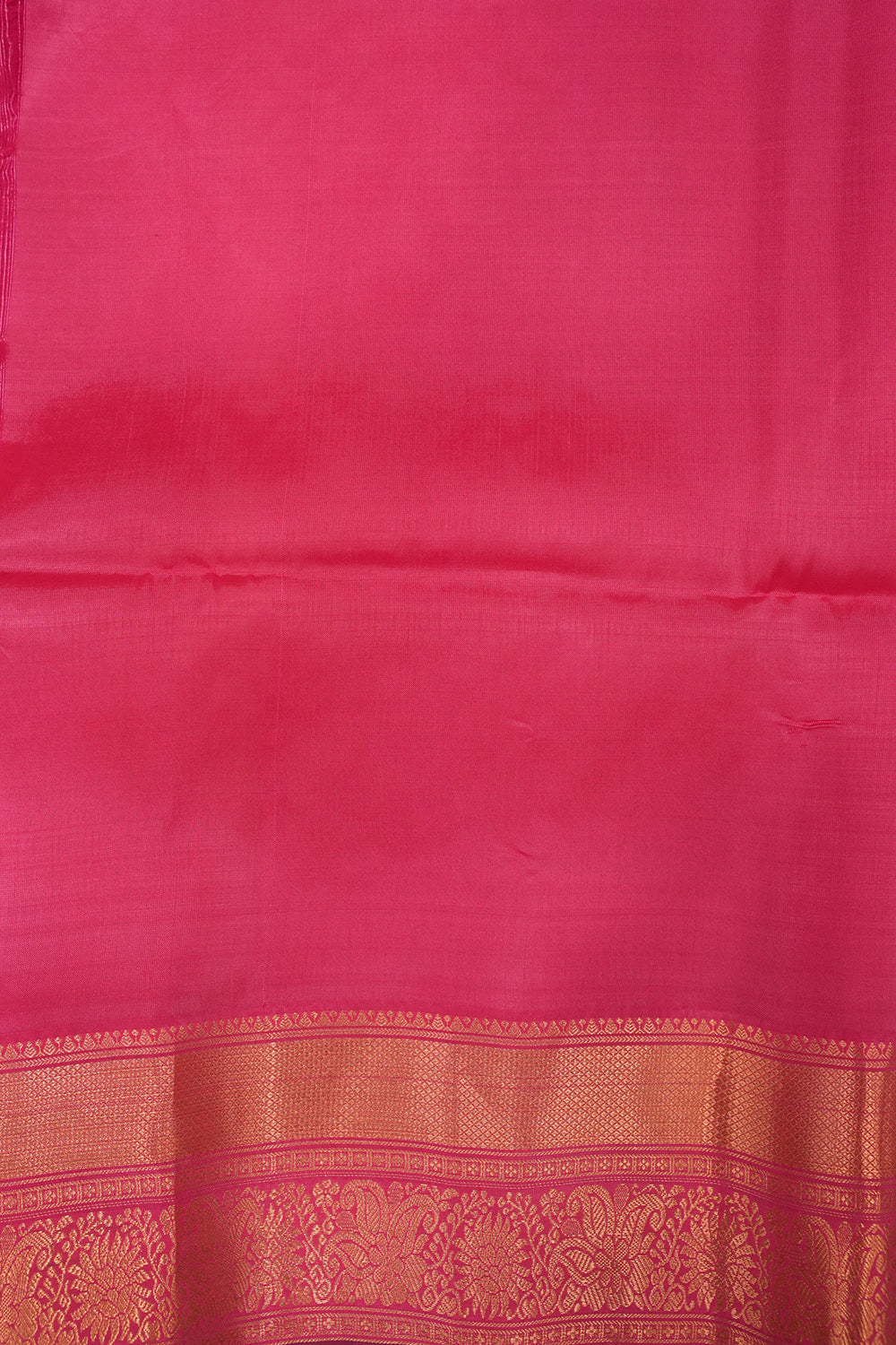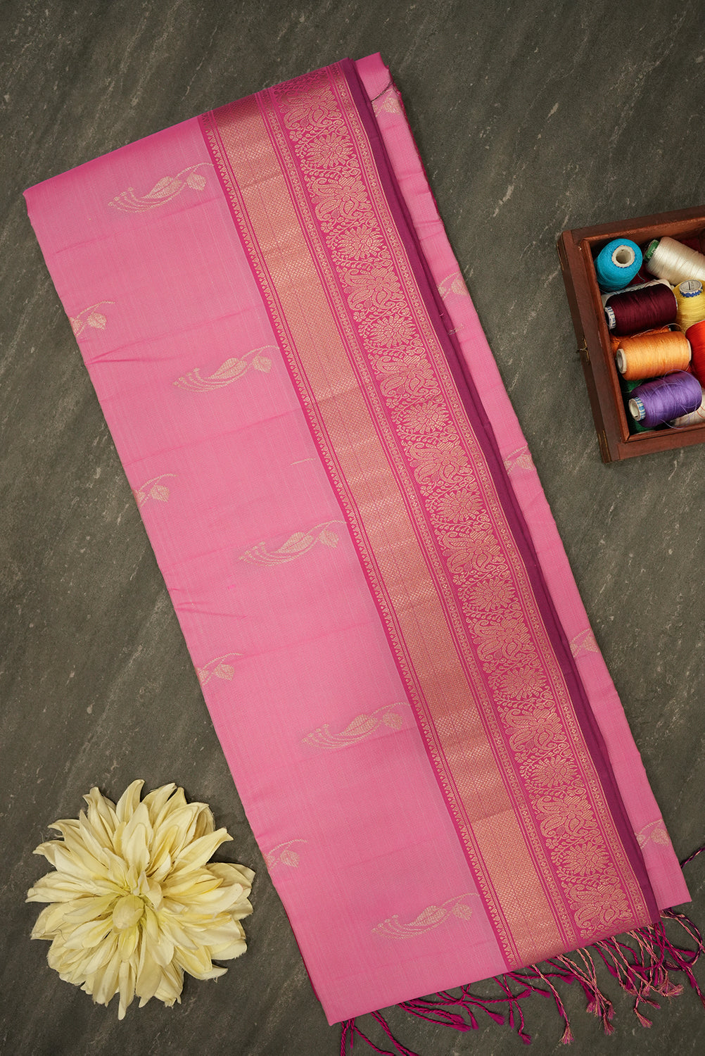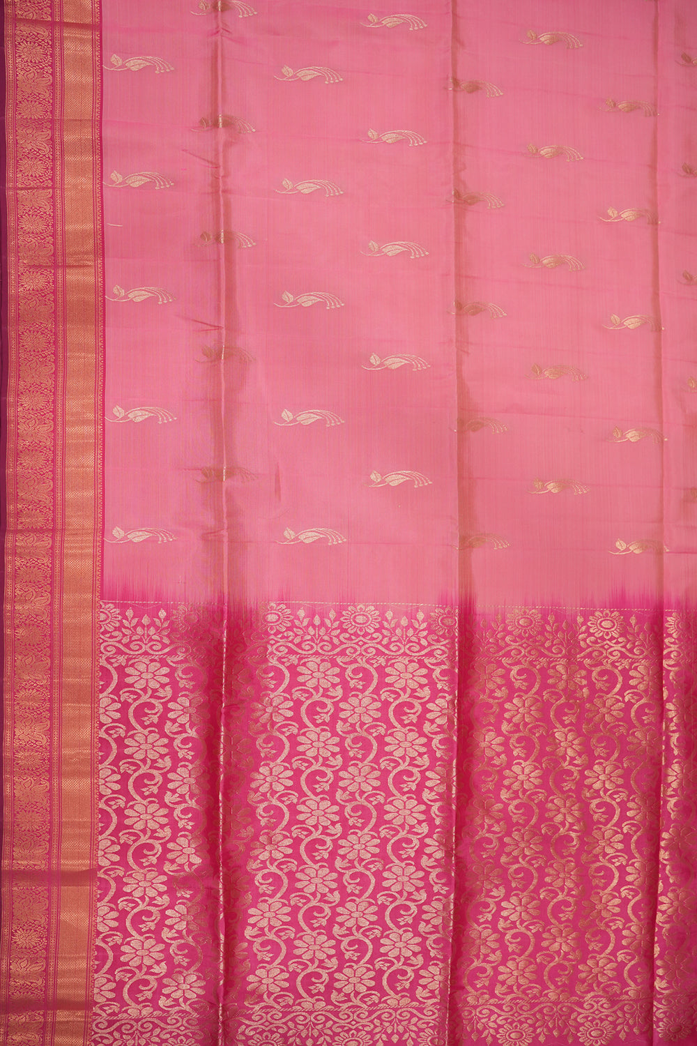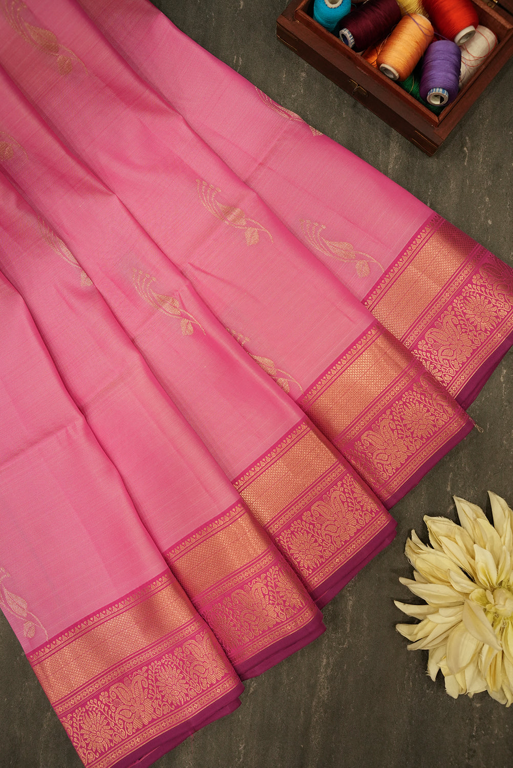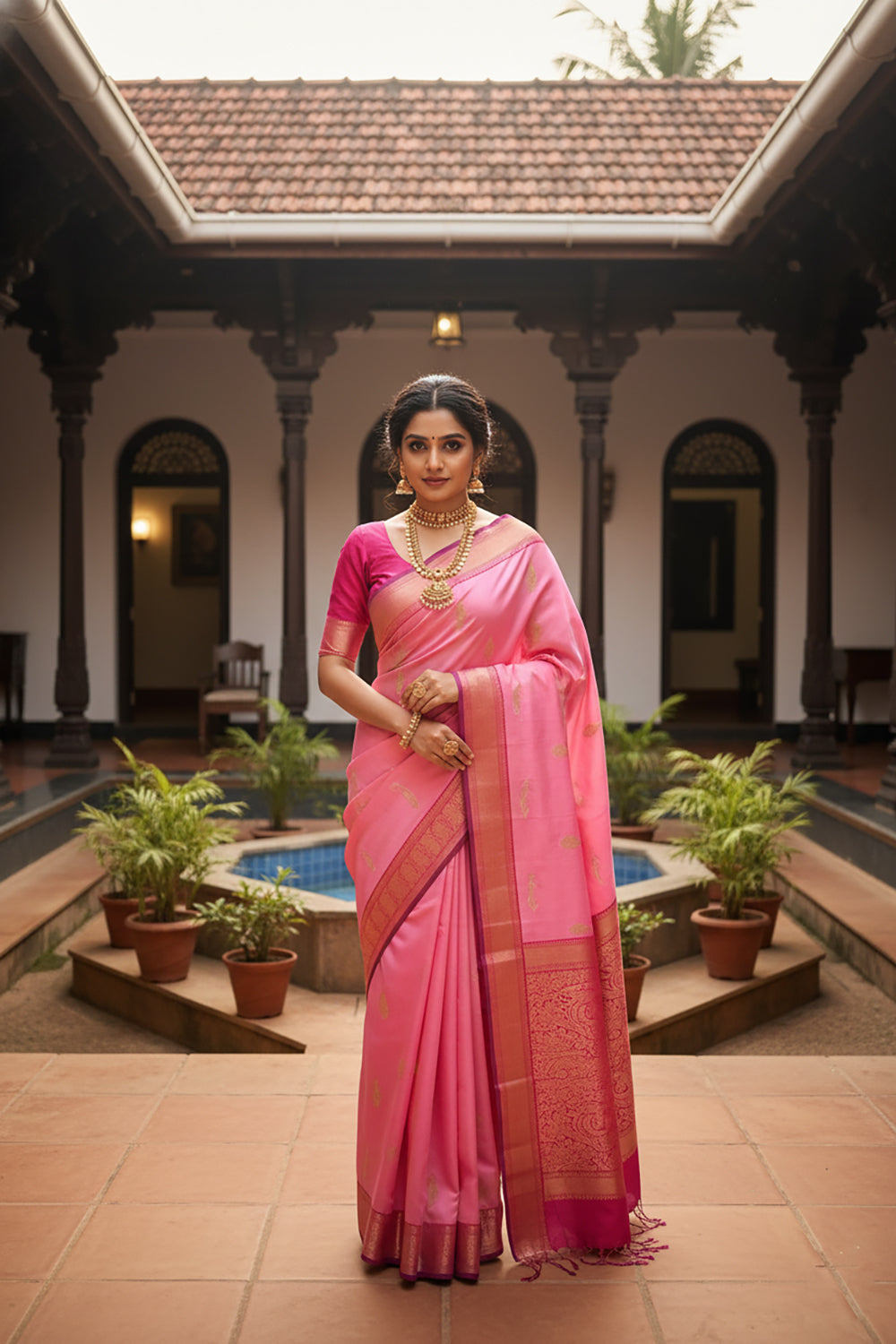 This elegant soft silk saree features a beautiful sage green body, adorned with a subtle leaf pattern woven in a lighter green. The saree is finished with a striking wide border and pallu, featuring a detailed golden zari paisley and floral design. This luxurious and lightweight saree is a perfect choice for weddings, festive occasions, and special events.