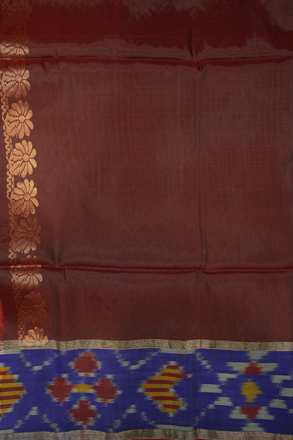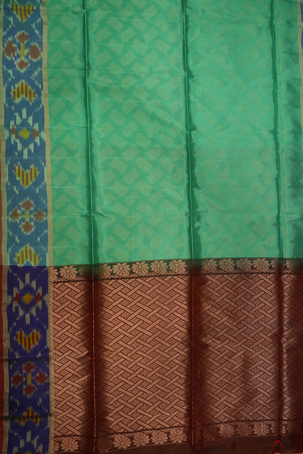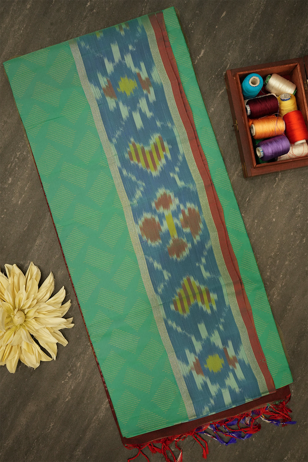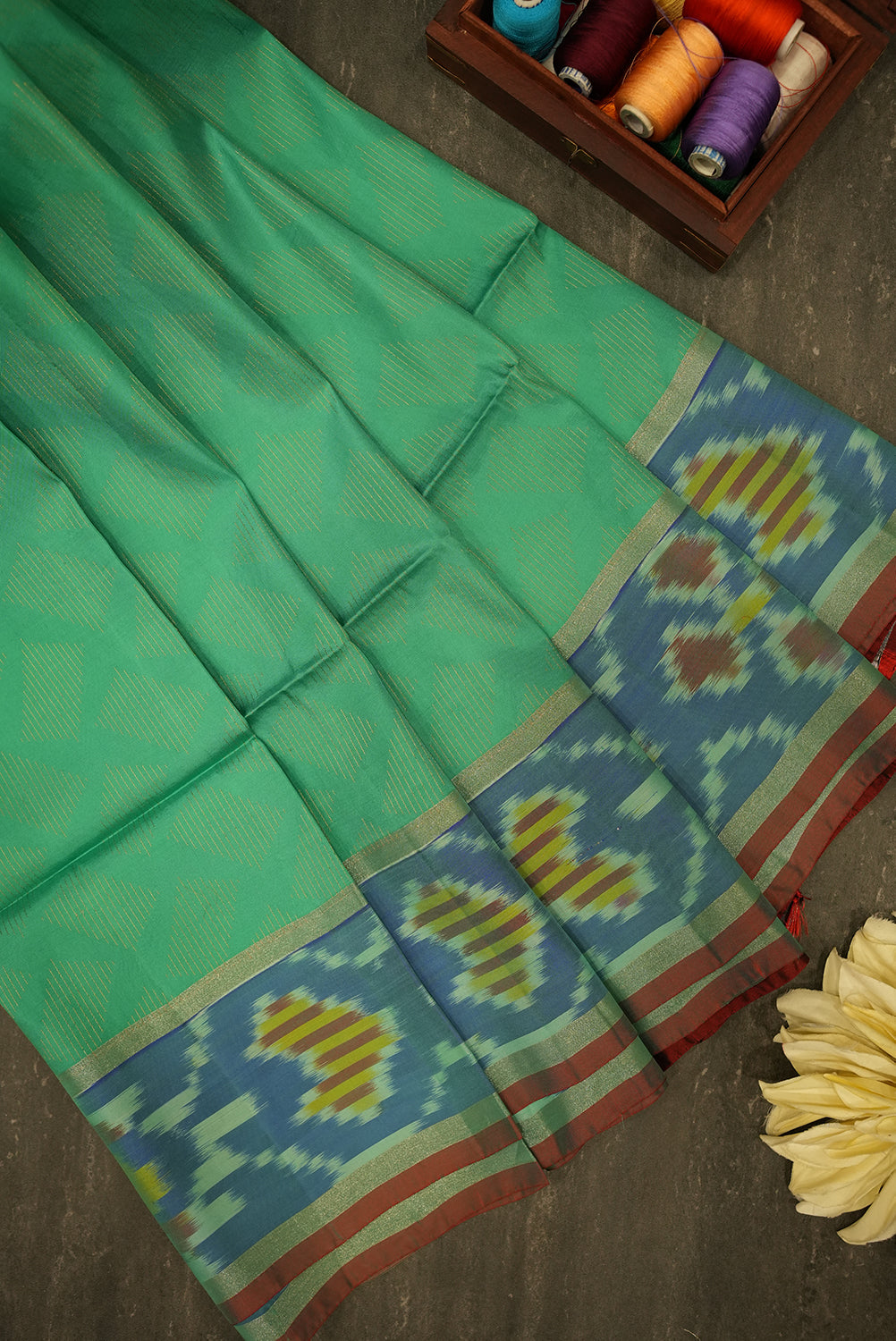 This stunning soft silk saree features a serene sea green body with a subtle geometric pattern. The striking ikat-printed pallu in shades of blue, maroon, and yellow adds a vibrant and artistic touch. The saree is finished with a delicate fringe, making it a perfect blend of modern design and traditional craftsmanship.