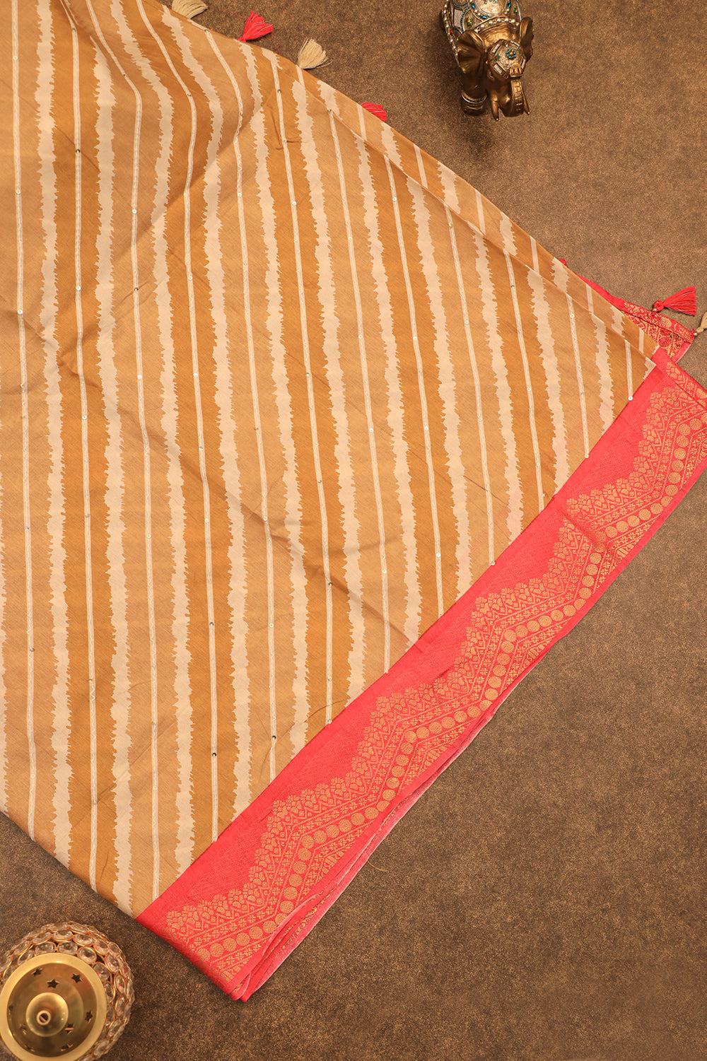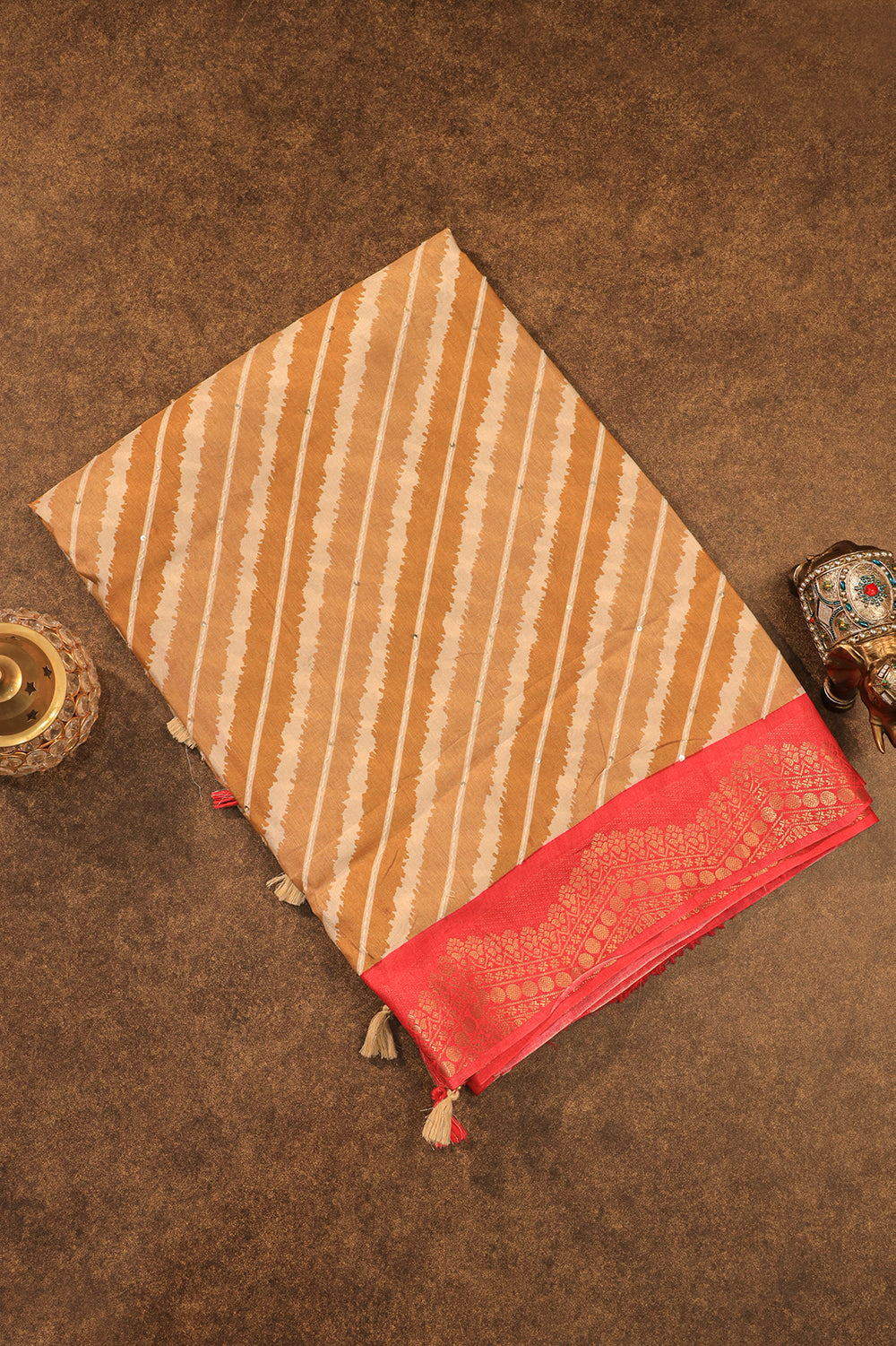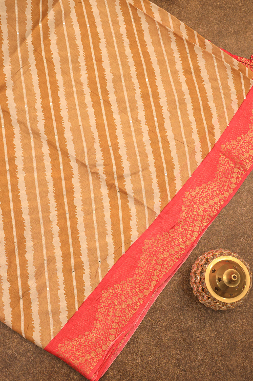 This unique raw silk saree boasts a contemporary striped pattern in warm beige and off-white, complemented by a striking coral pink border adorned with zari detailing. A lightweight and stylish choice for special celebrations. Unstitched blouse attached