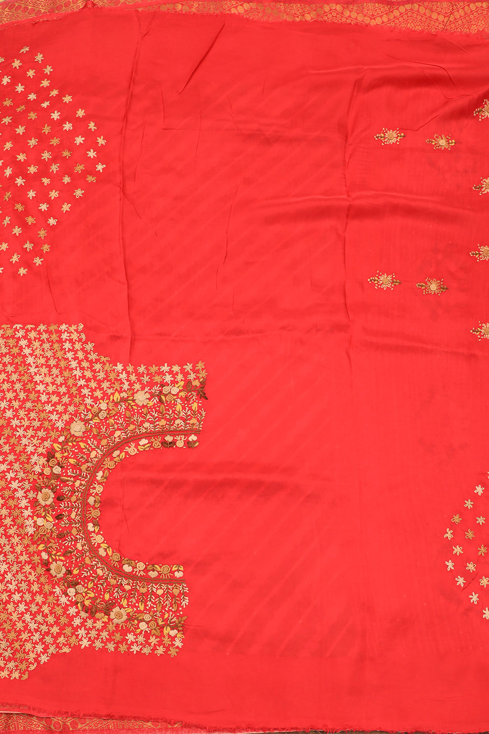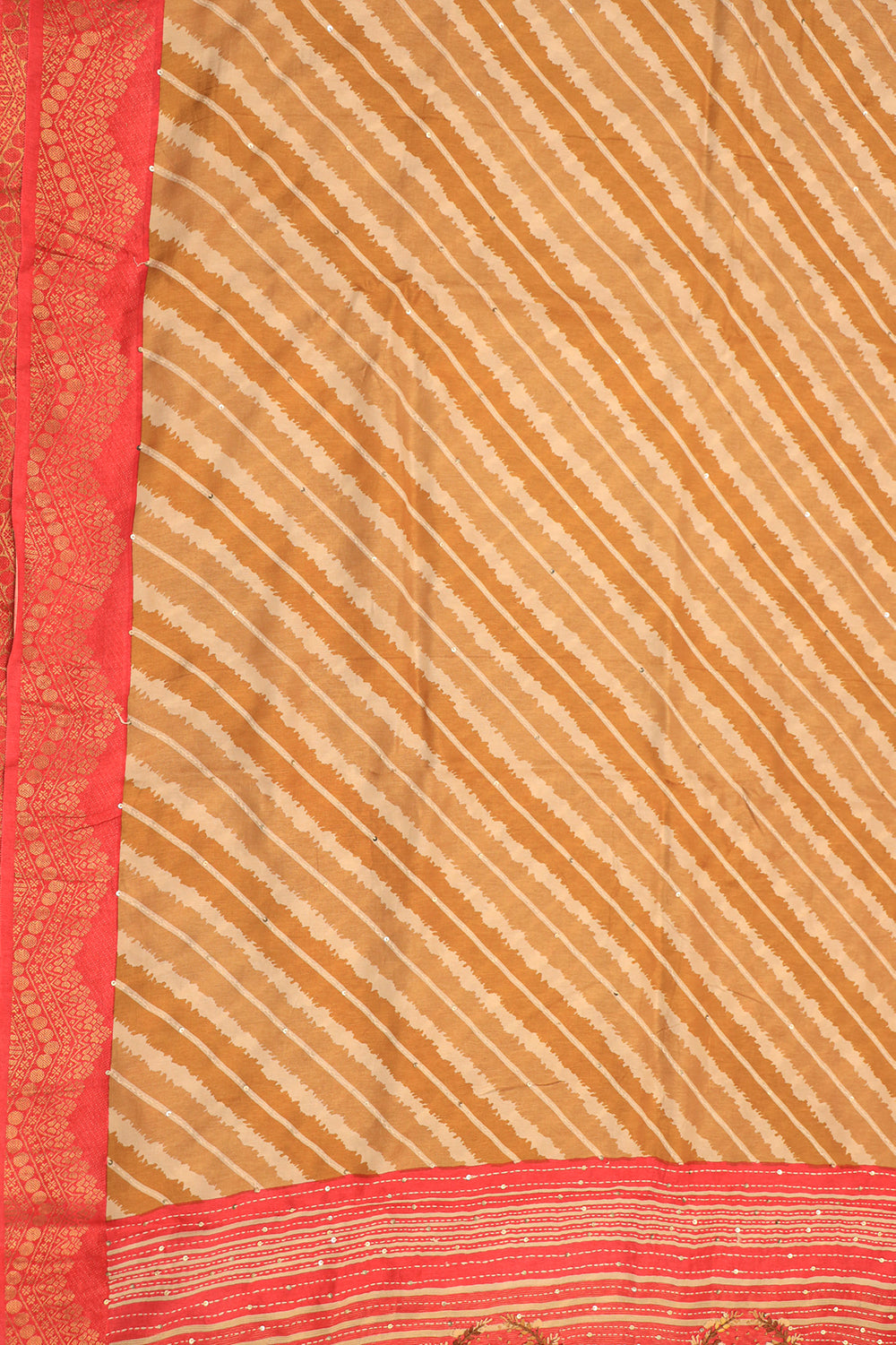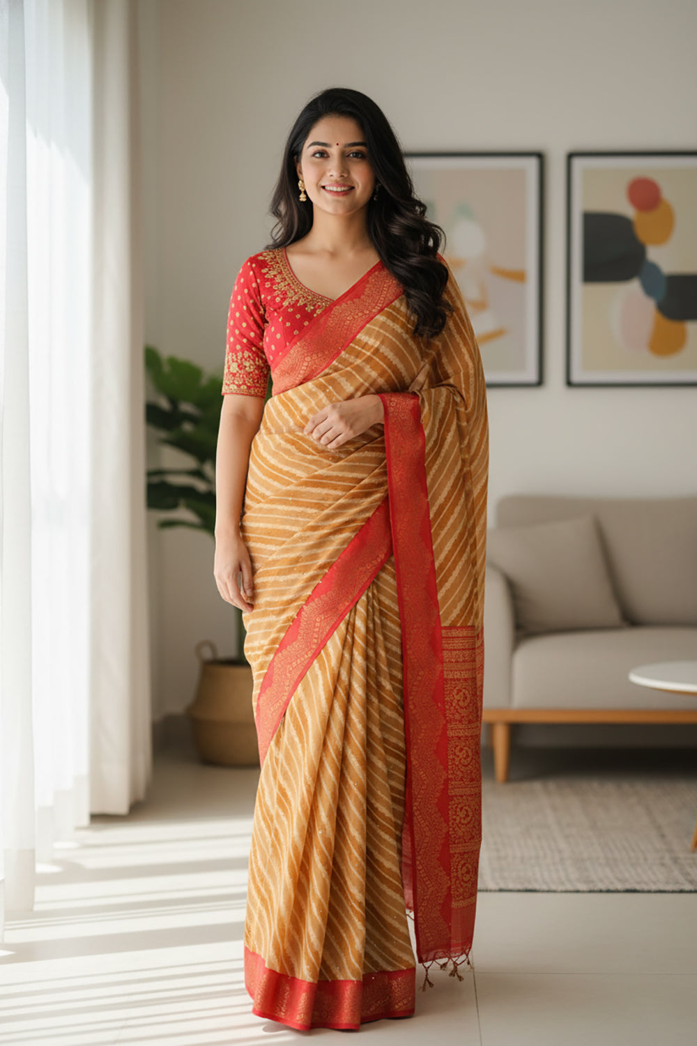 This unique raw silk saree boasts a contemporary striped pattern in warm beige and off-white, complemented by a striking coral pink border adorned with zari detailing. A lightweight and stylish choice for special celebrations. Unstitched blouse attached