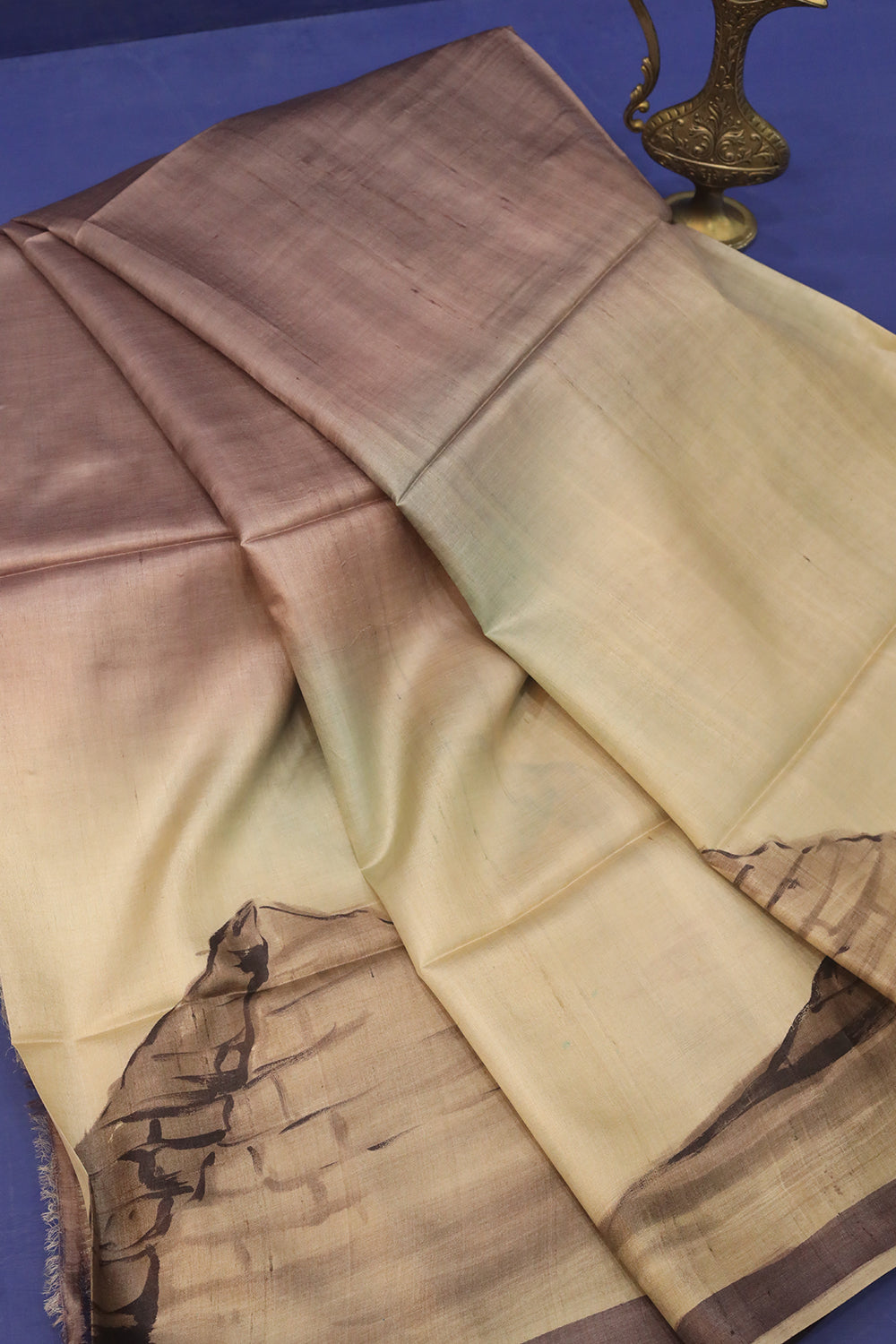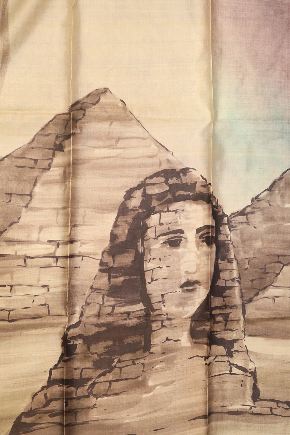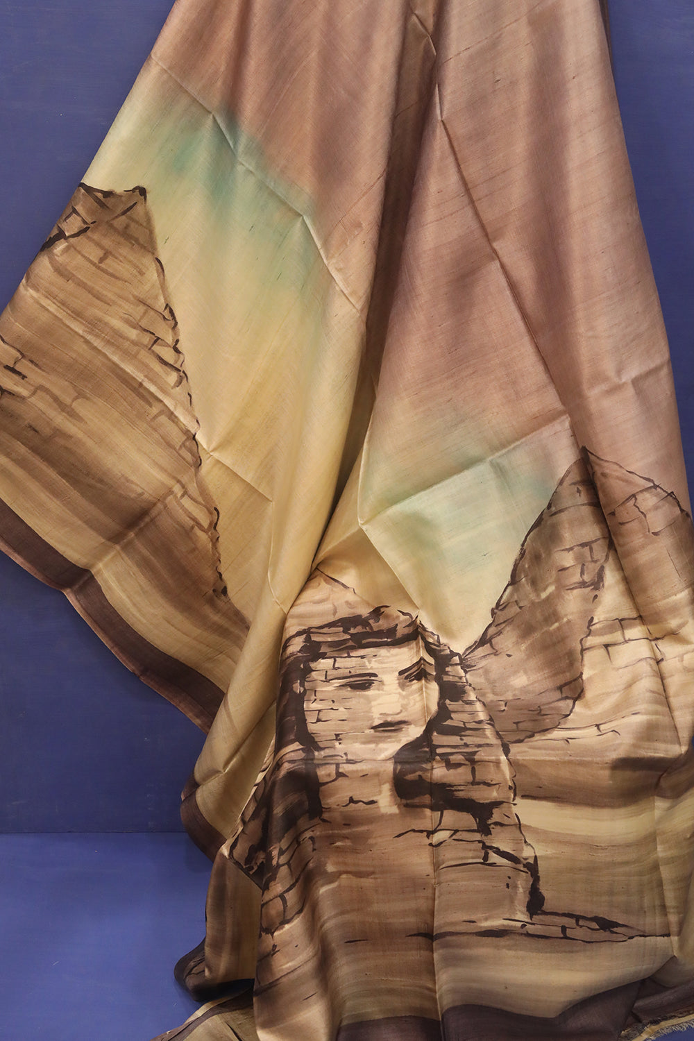 The beautiful story telling pure tussar silk saree, pallu with pyramid with Egyptians silhouette and in body with Egypt vibe,Has minimal border. Attach with unstitched blouse.
