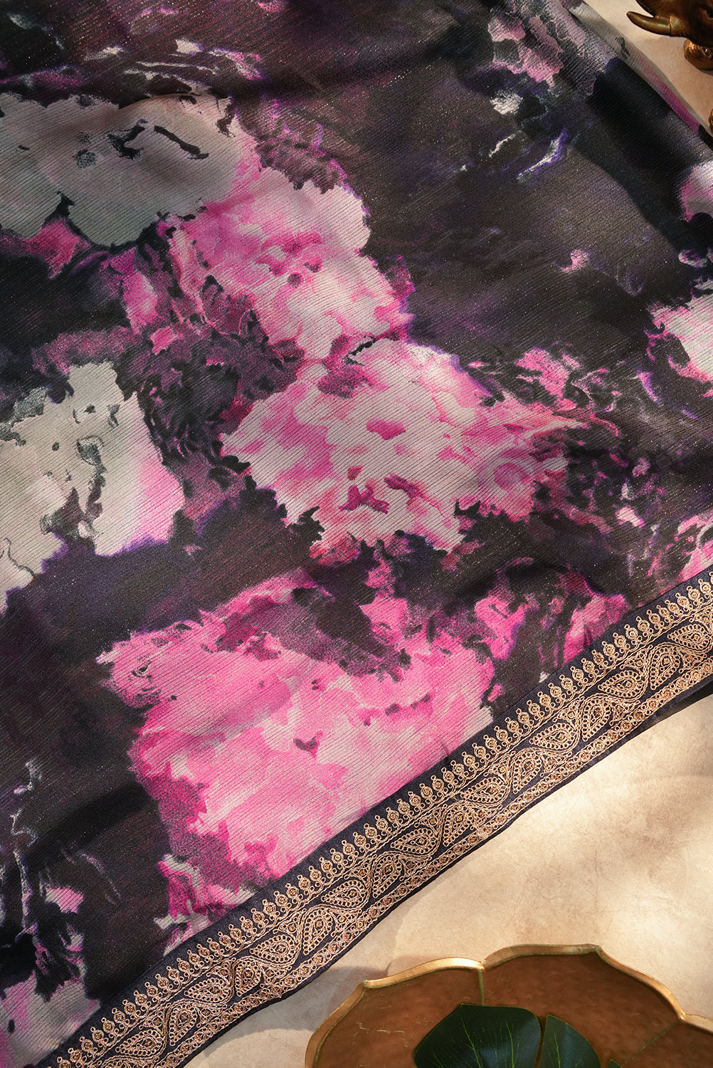 Black and Pink Tie-Dye Effect Chiffon Saree with Zari Border