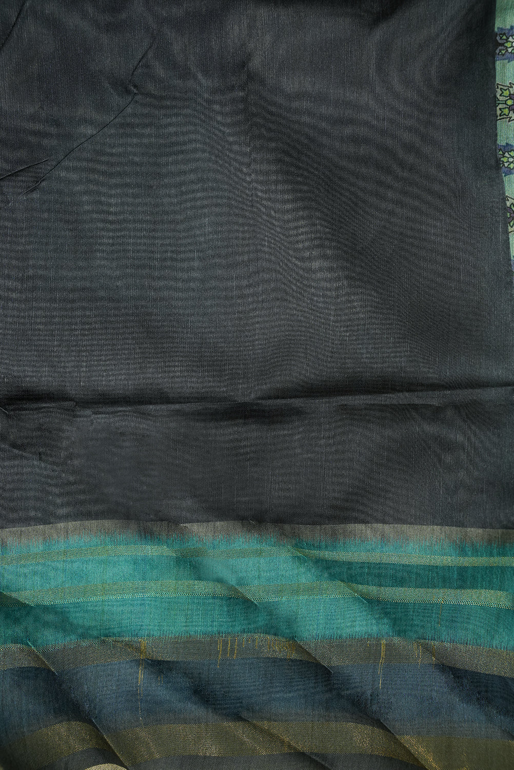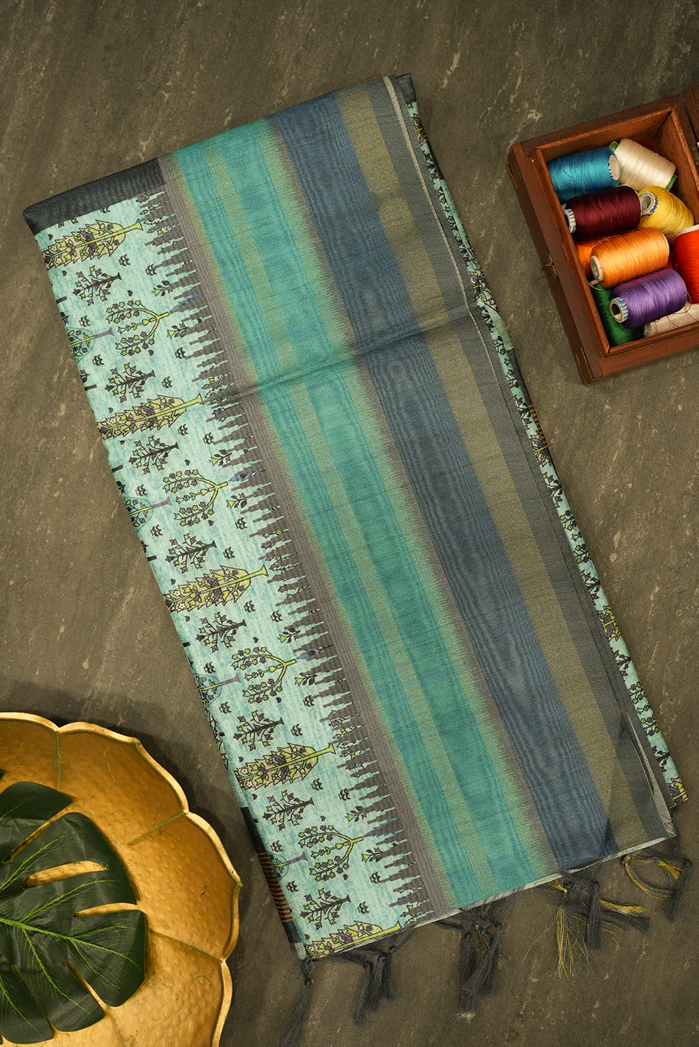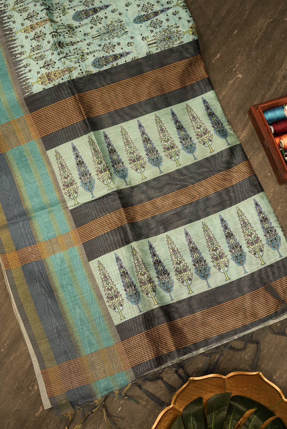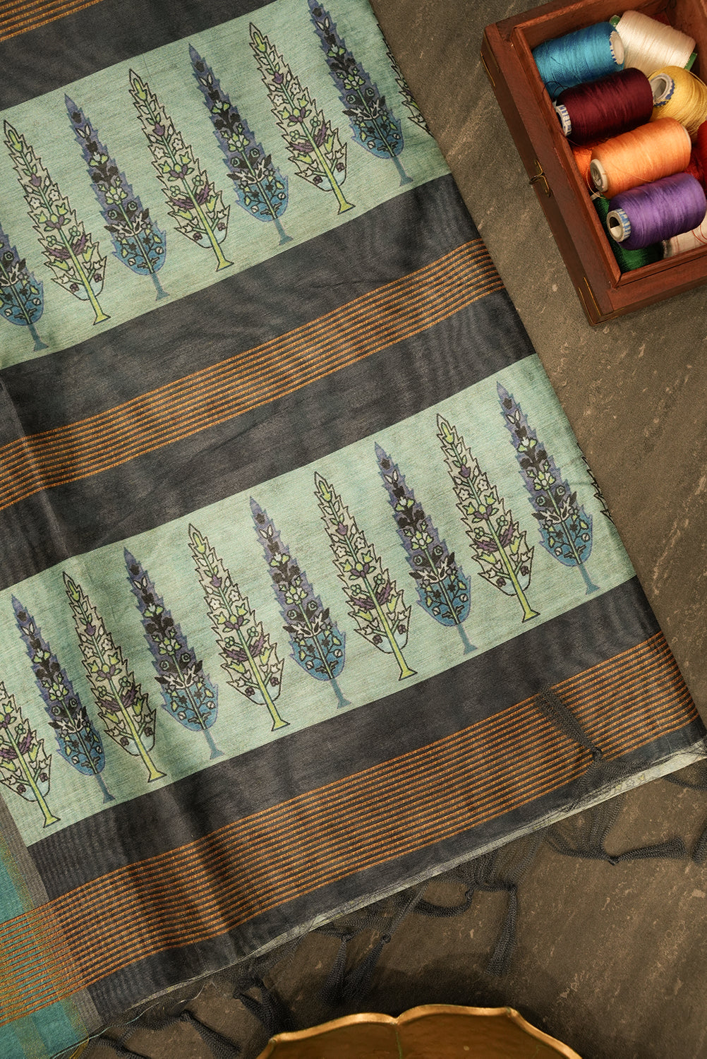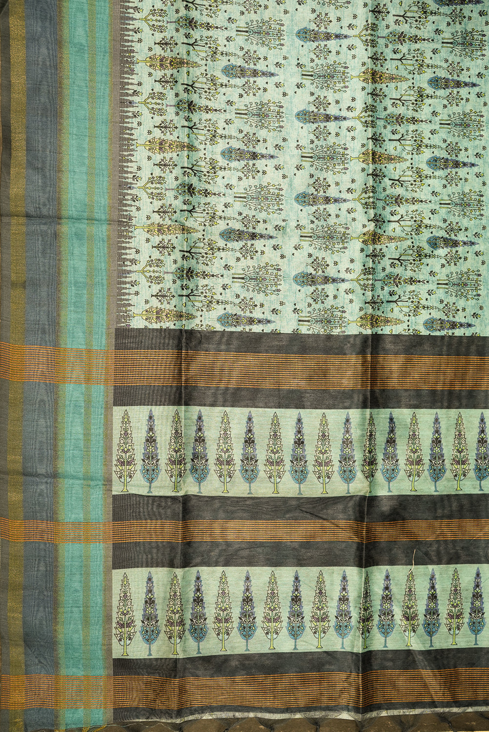 This lightweight tussar silk saree features a beautiful aqua body adorned with intricate tree and floral motifs in contrasting shades. The dual-toned border and pallu in charcoal grey and gold with repeating tree patterns add a touch of elegance, making it a perfect blend of traditional and contemporary design. Unstitched blouse attached.