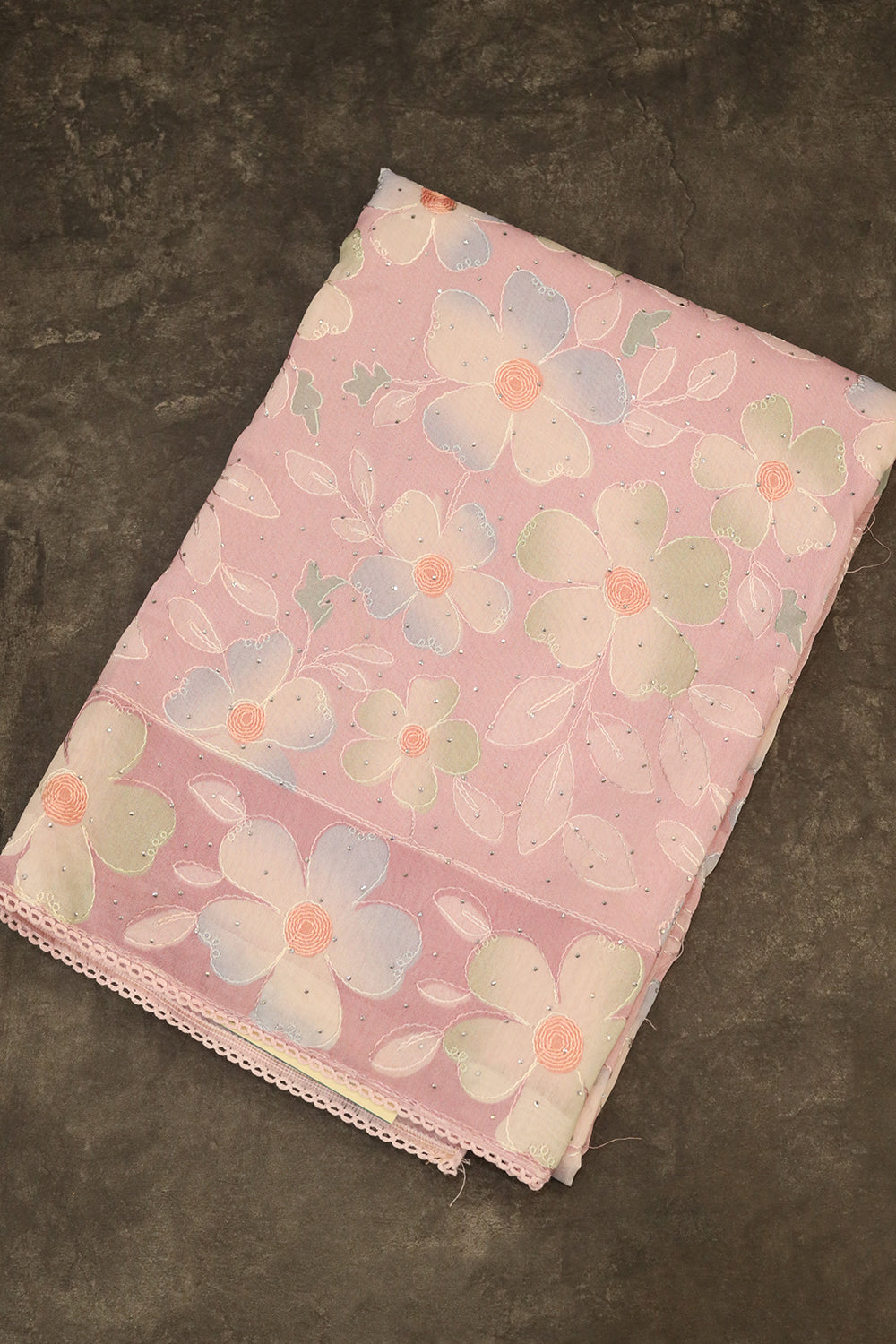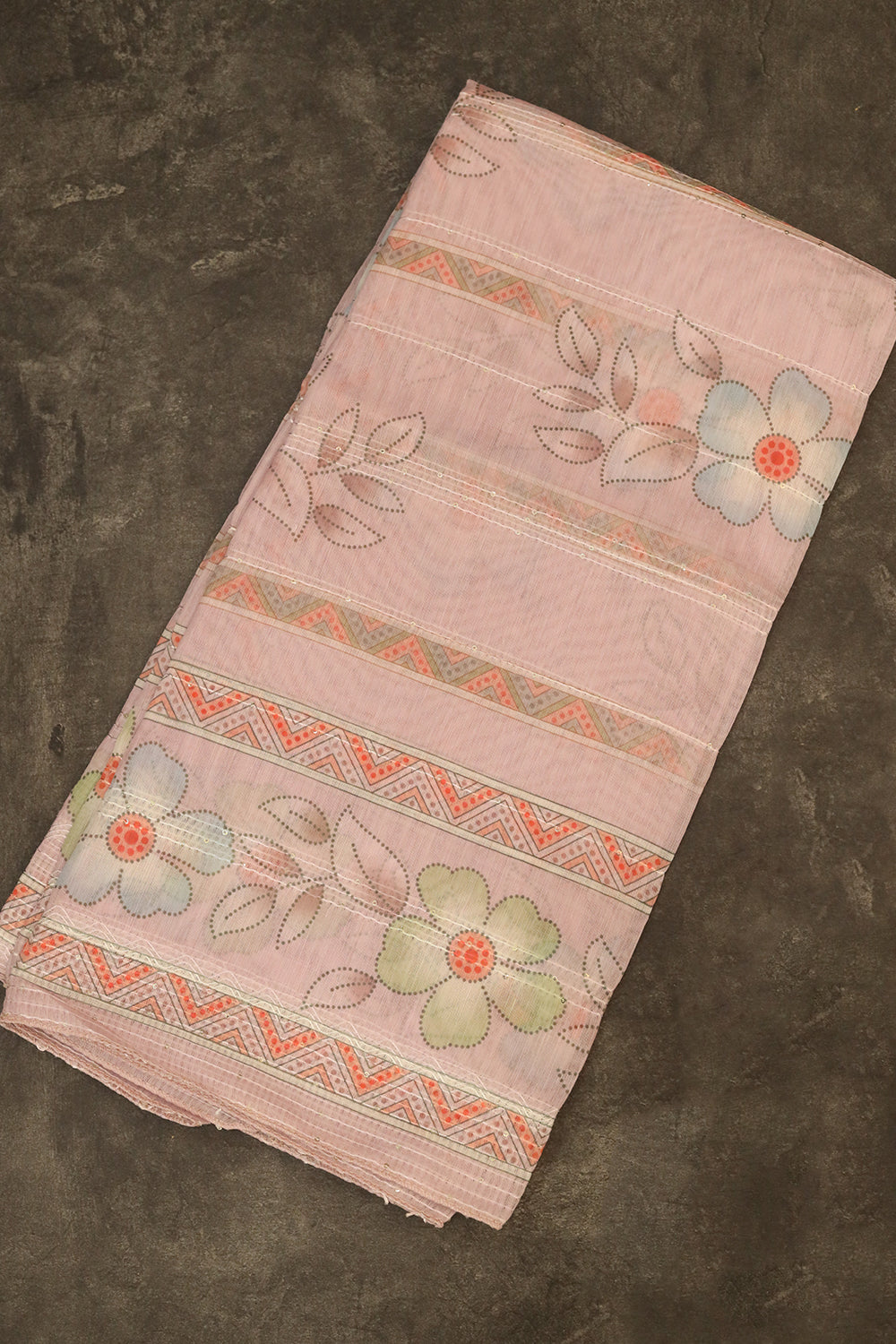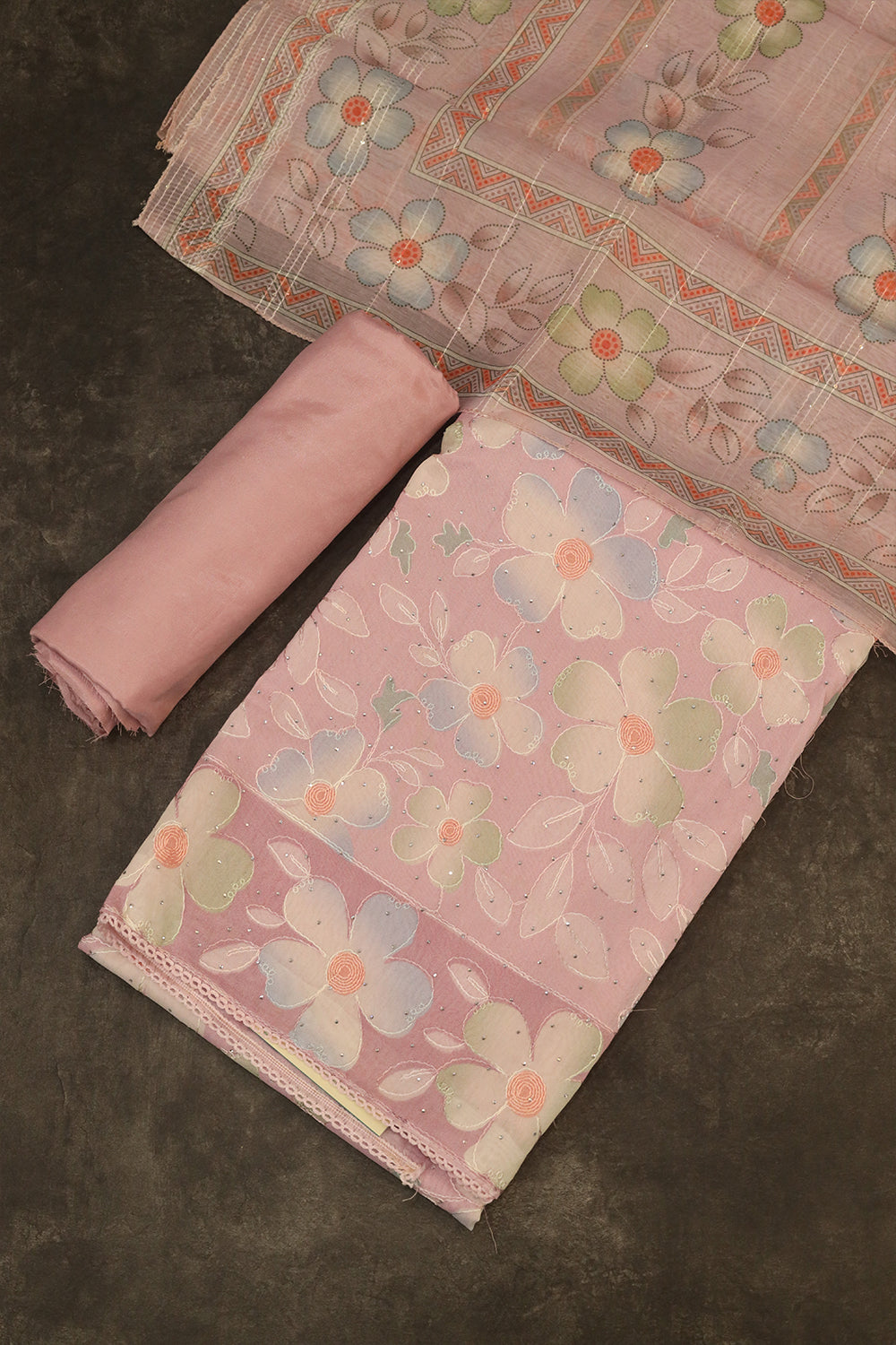 Baby Pink Linen salwar material having a colourful flower and leaf with embroidered work designs. Baby Pink colour flower design lovely dupatta.