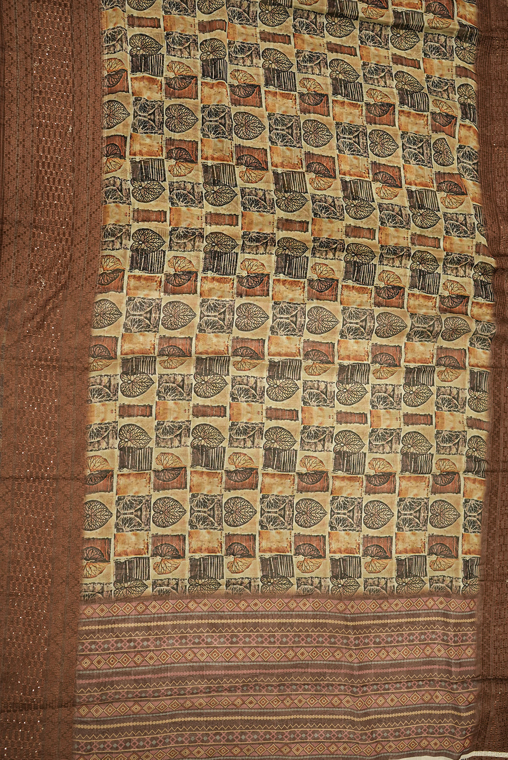 Embrace timeless elegance with this chiffon saree featuring soft beige fabric adorned with artistic leaf motifs in shades of brown and rust. Finished with a rich copper-brown border and golden edging, it strikes the perfect balance between subtlety and style. Unstitched blouse attached.