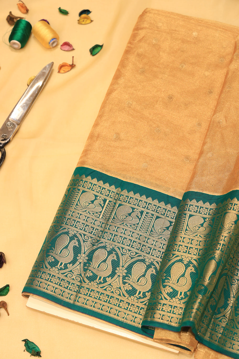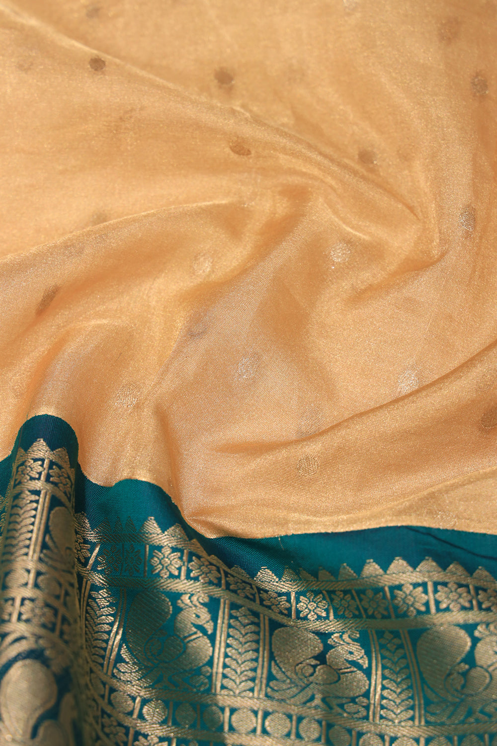 This beige-toned silk fabric features delicate gold zari buttas scattered across its surface, complemented by a striking bottle green traditional border adorned with intricate motifs.