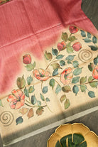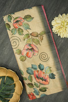 This elegant tussar saree features a sophisticated beige base, beautifully adorned with a hand-painted floral print. The large blossoms in shades of pink, red, blue, and green create a soft, watercolor-like effect, giving the saree an artistic charm. The border is a modern dark grey with a hint of maroon, providing a chic contrast. This designer piece is perfect for art lovers and those who want to make a graceful statement at any special occasion.
