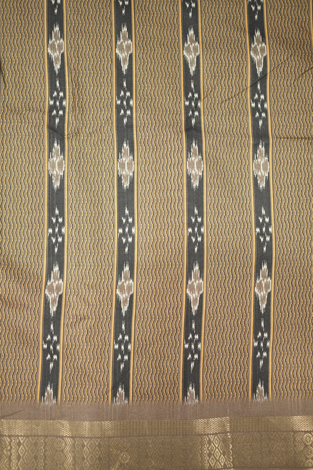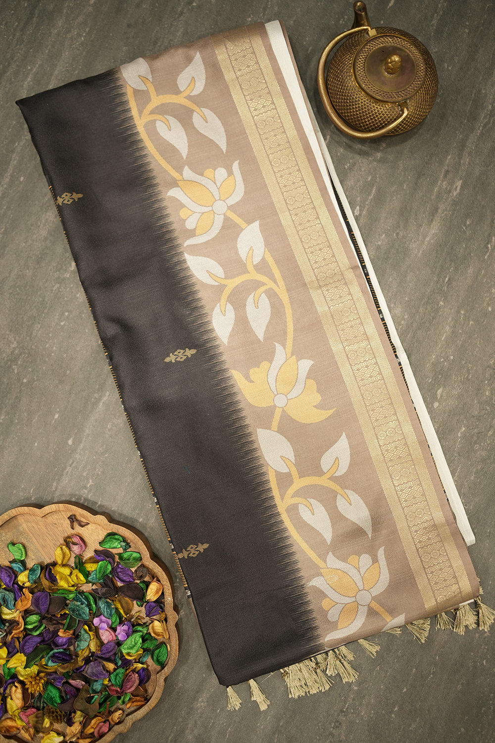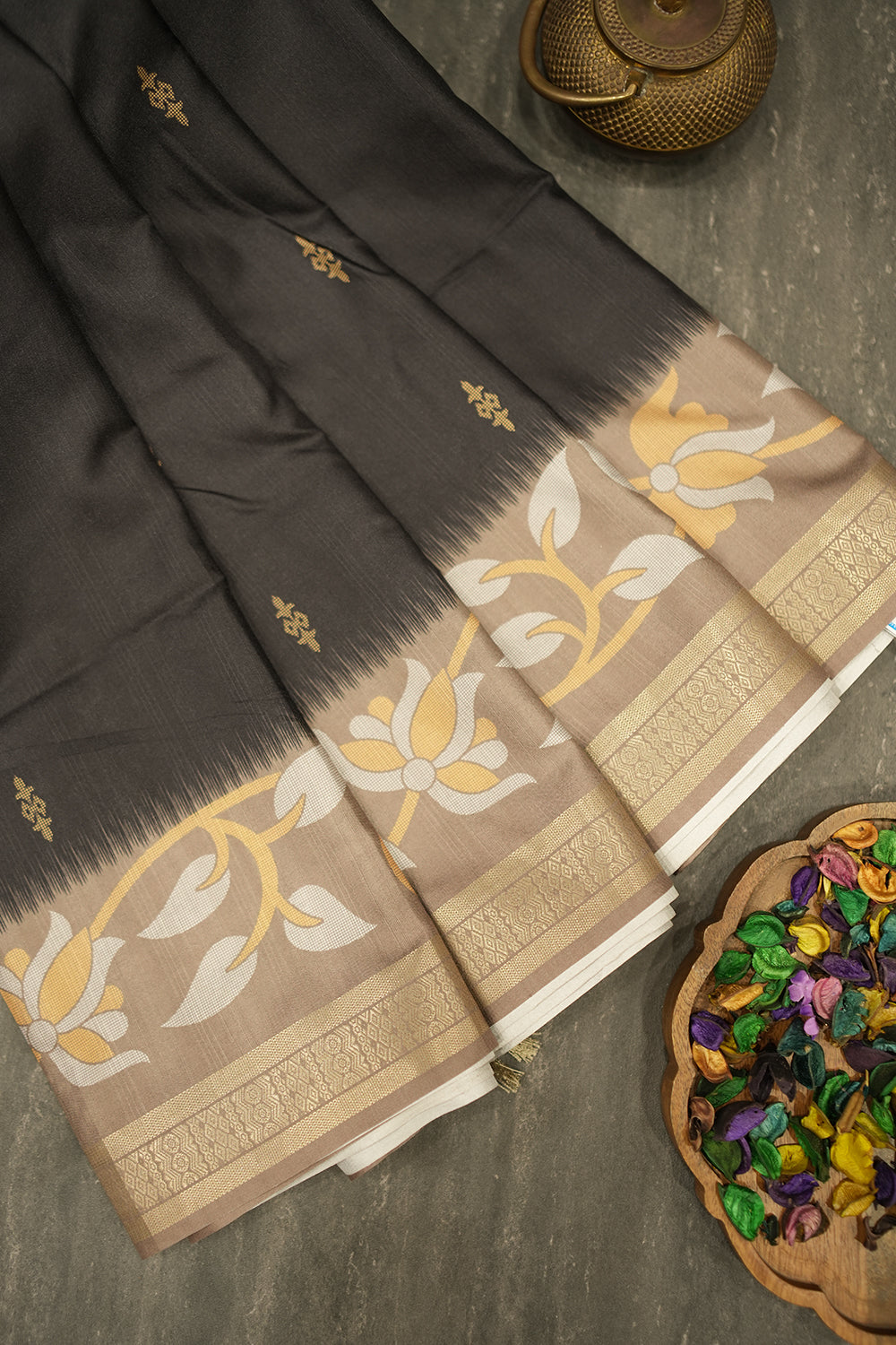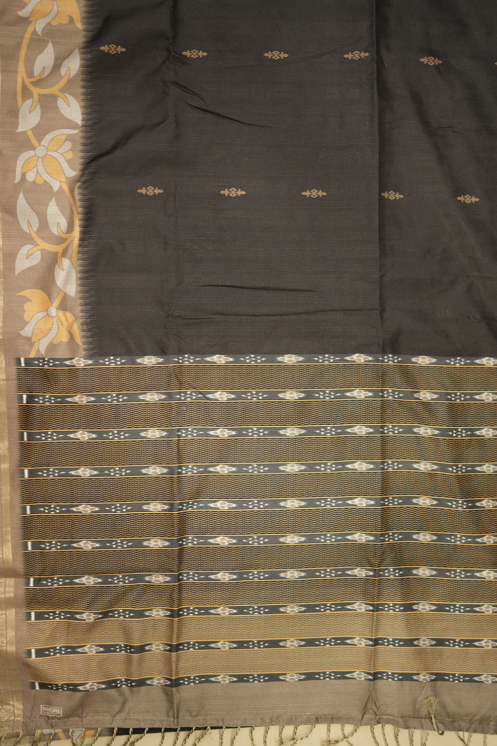 Step out in style with this beautiful semi-jute saree in a classic black hue. The border showcase a unique beige base with intricate yellow and off-white floral patterns. Unstitched blouse attached.