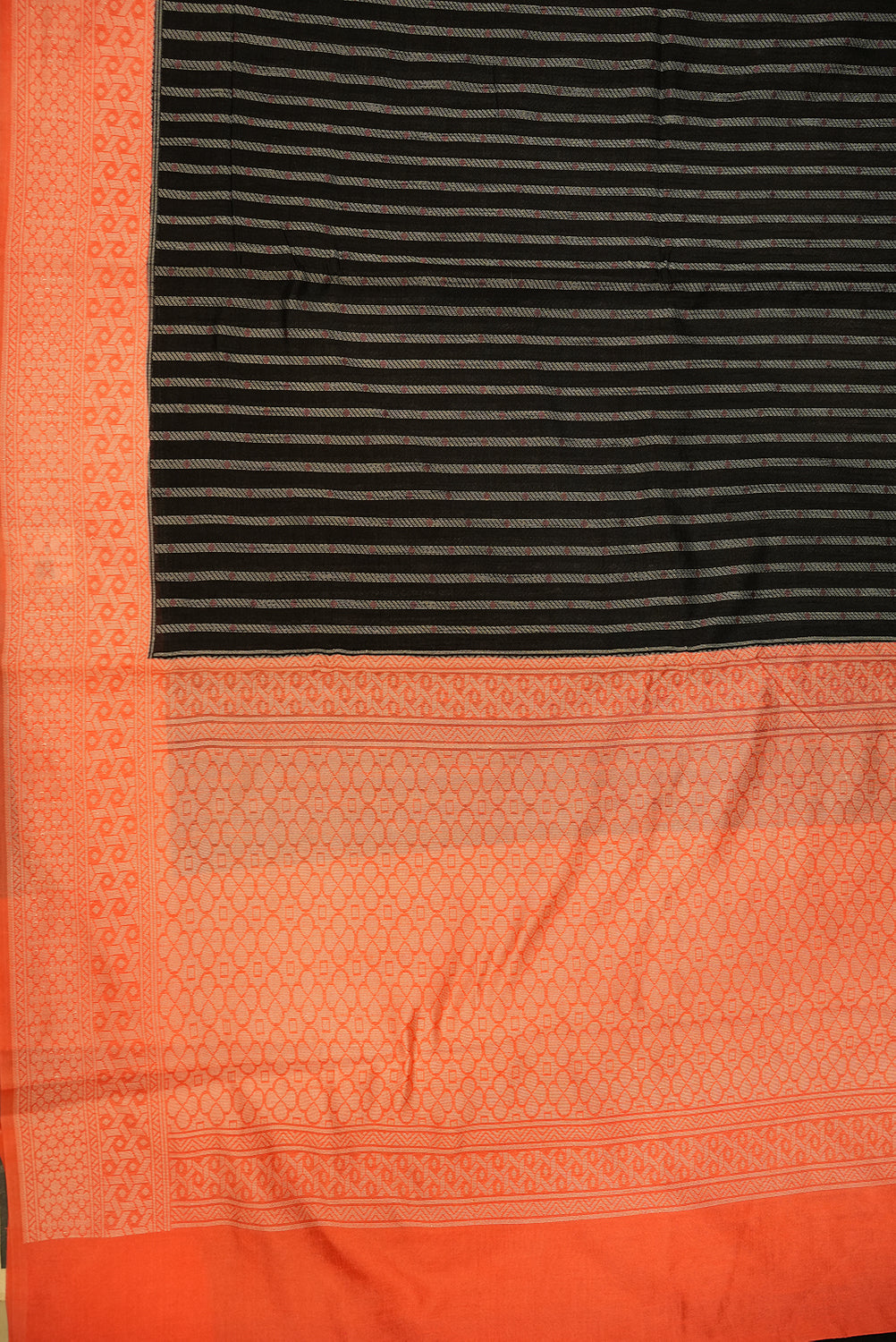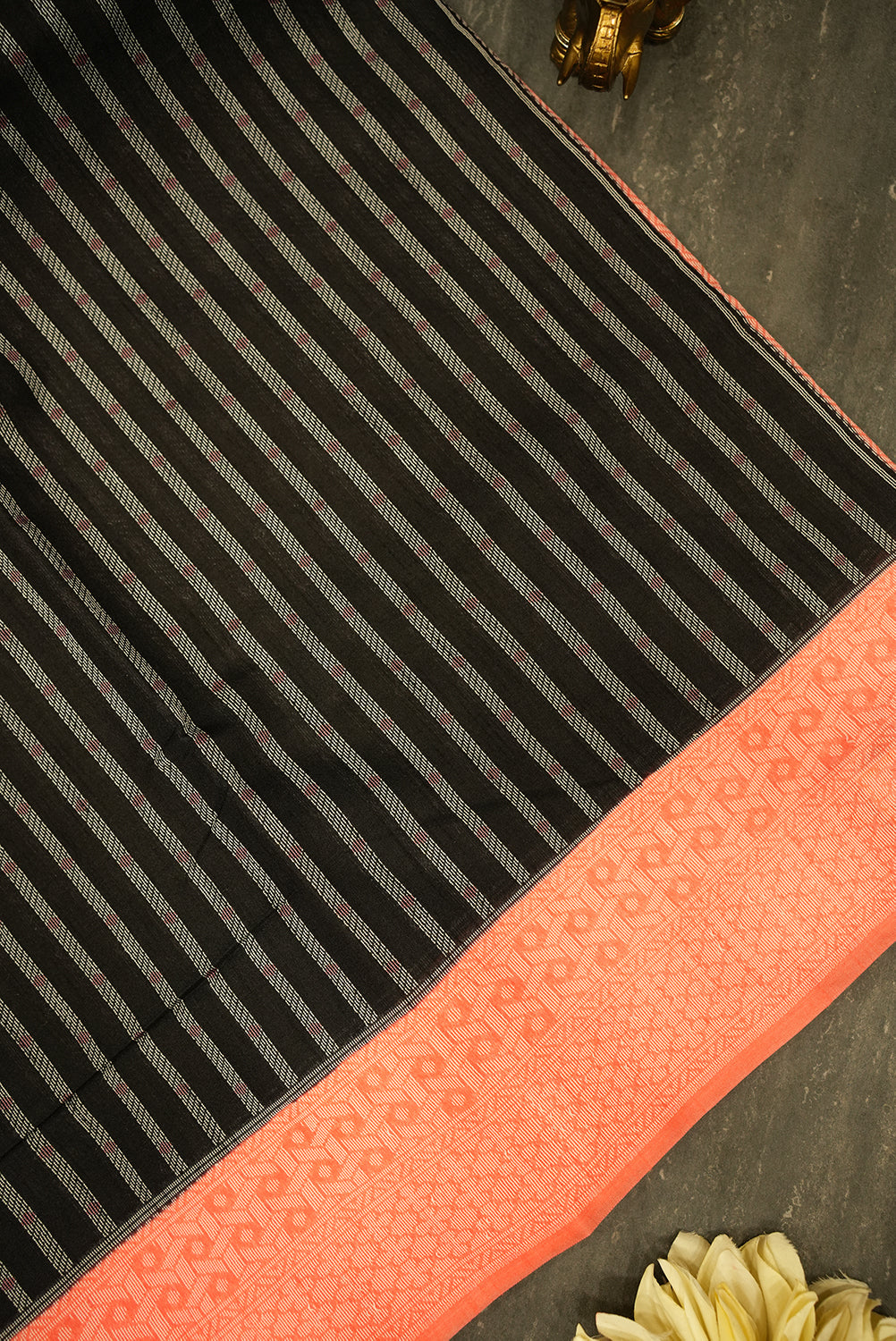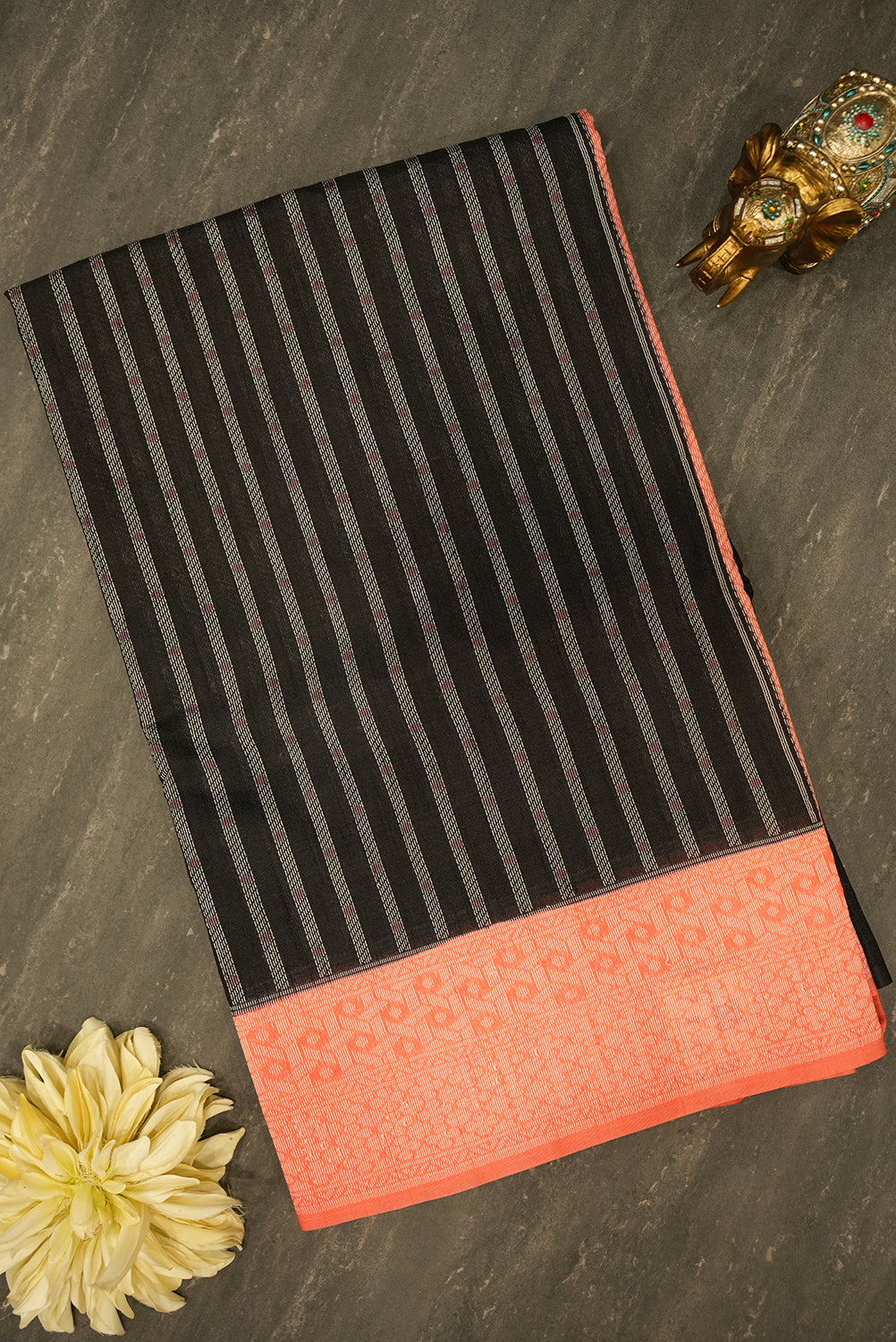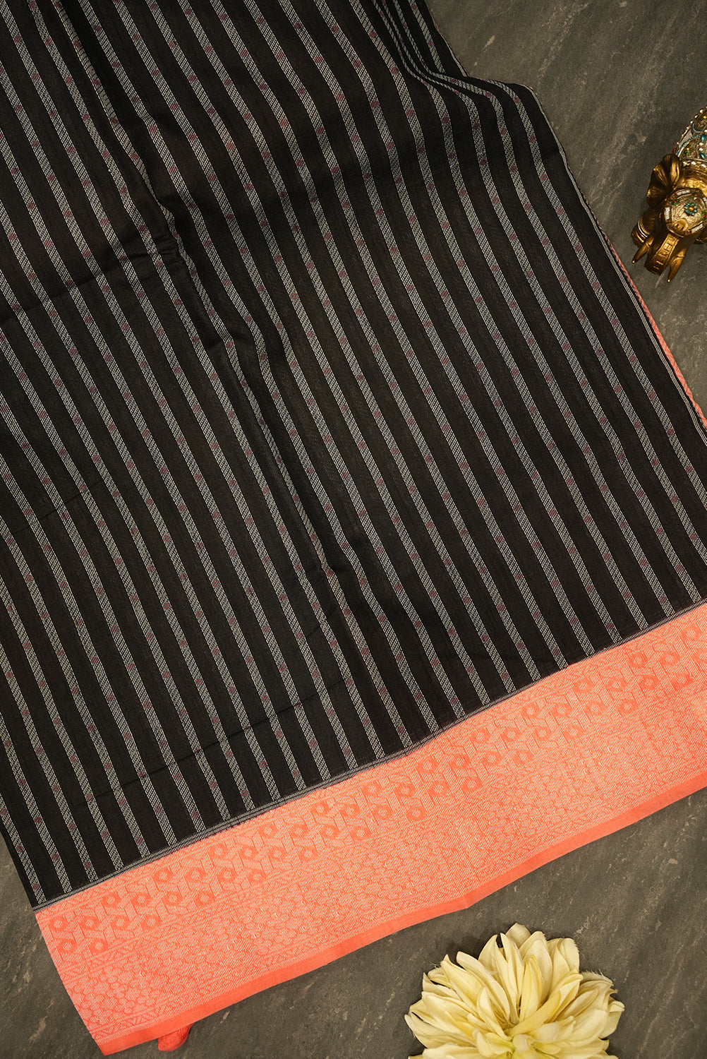 Black Semi Raw Silk Saree having a lovely vertical straight lines with dots all over the body. Mint Blue with white pattern designed lovely border. Unstitched blouse attached.