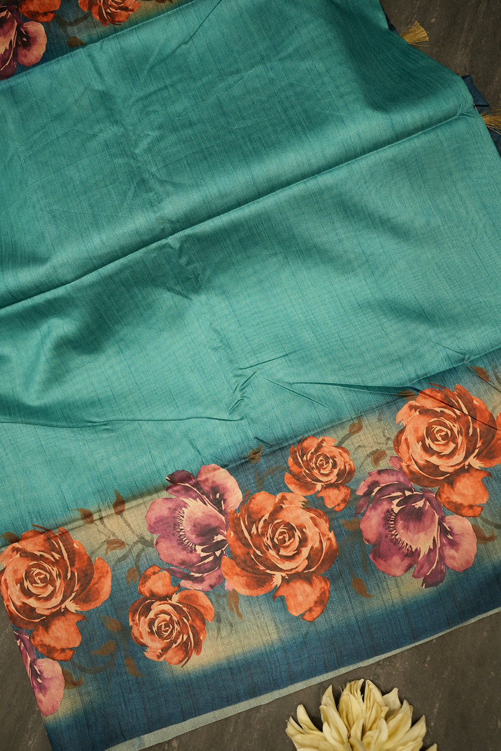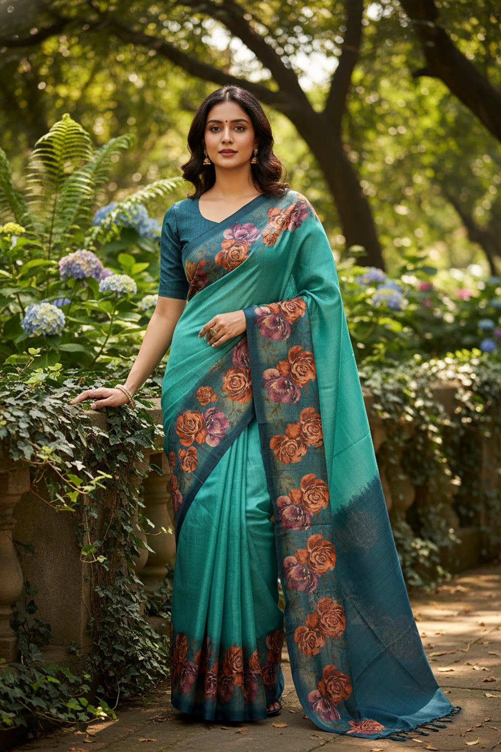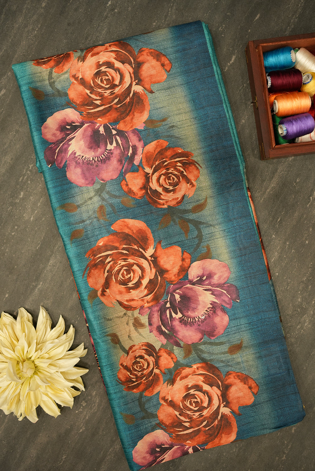 This stunning semi-tussar saree features a beautiful blue background with a subtle striped texture, adorned with a large floral print. The vibrant blossoms in shades of orange, peach, and purple create a striking contrast, making the saree both artistic and elegant. This lightweight and stylish saree is perfect for special occasions, combining modern design with a classic feel.