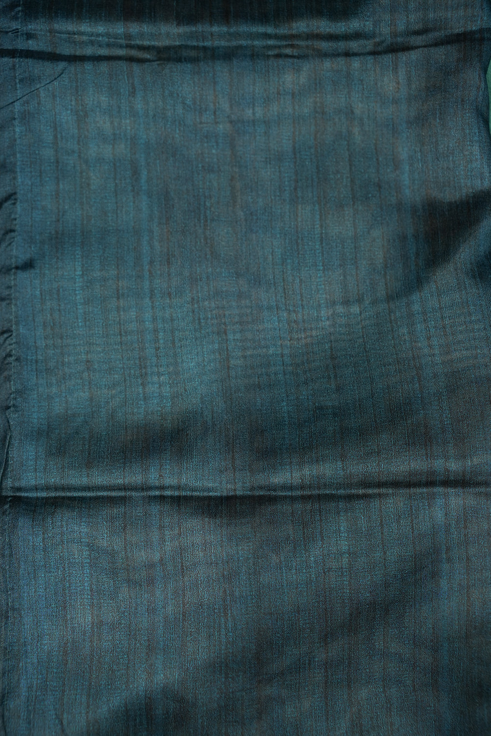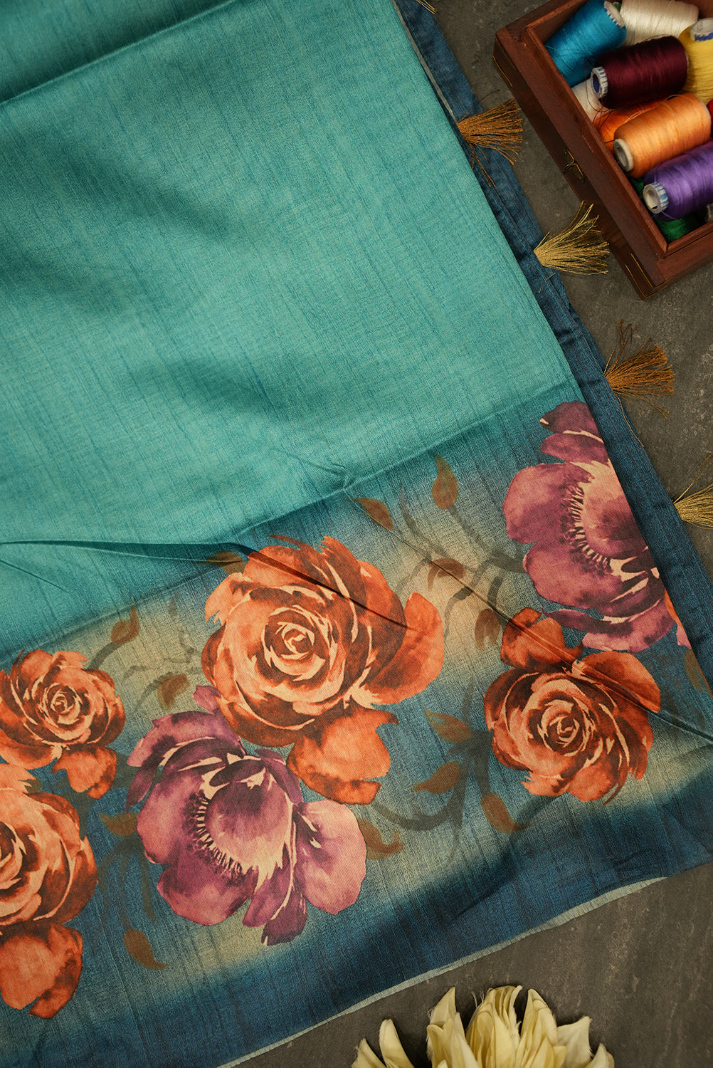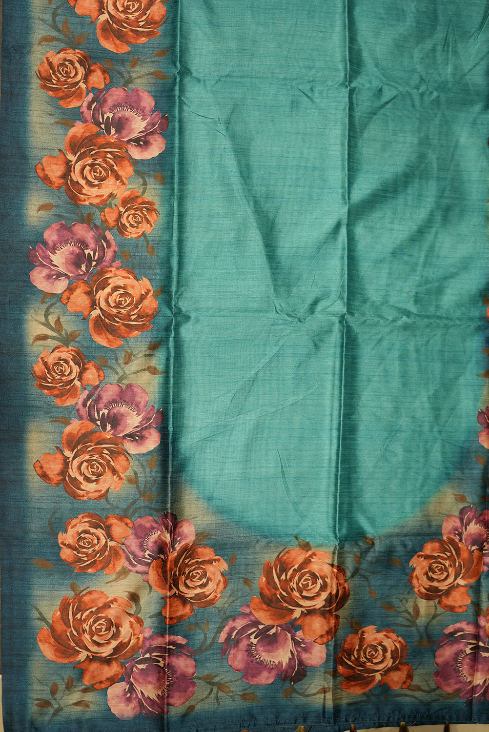 This stunning semi-tussar saree features a beautiful blue background with a subtle striped texture, adorned with a large floral print. The vibrant blossoms in shades of orange, peach, and purple create a striking contrast, making the saree both artistic and elegant. This lightweight and stylish saree is perfect for special occasions, combining modern design with a classic feel.