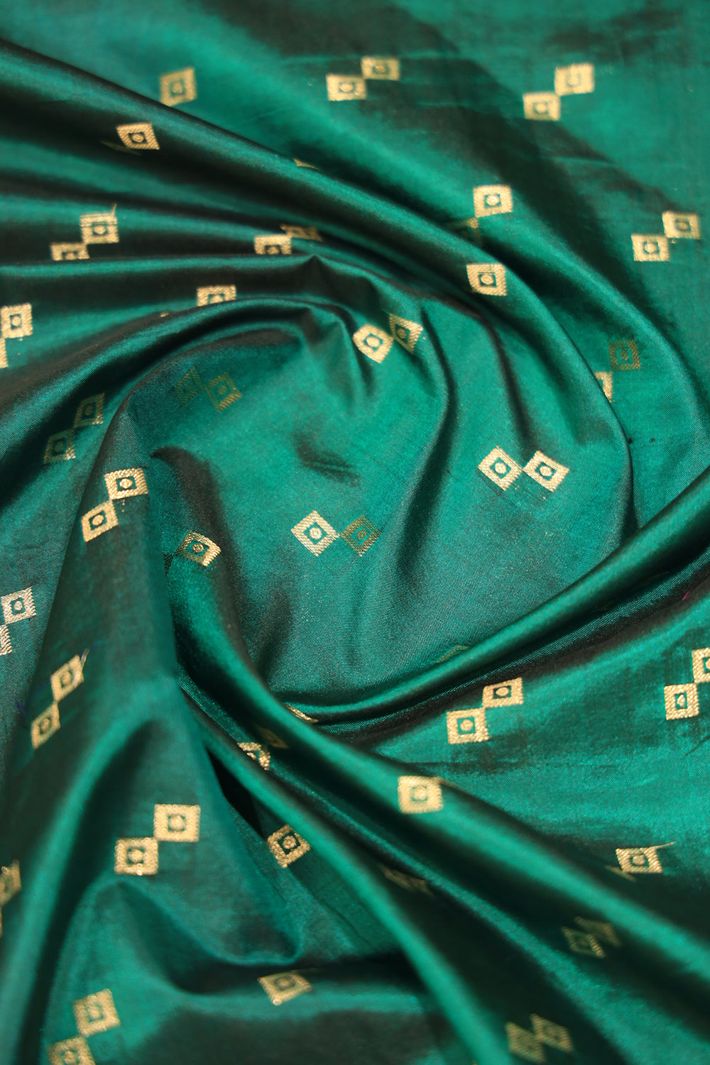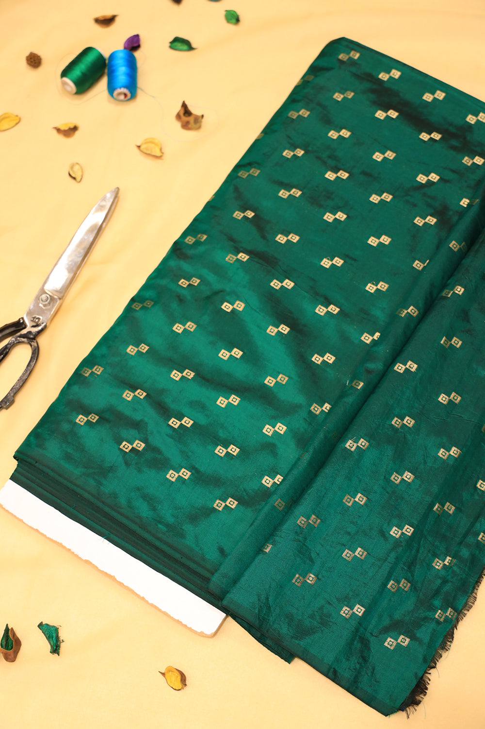 This is a luxurious bottle green silk fabric, adorned with intricate gold zari buttas for a touch of opulence. Perfect for creating elegant traditional attire with its rich color and subtle shimmer.